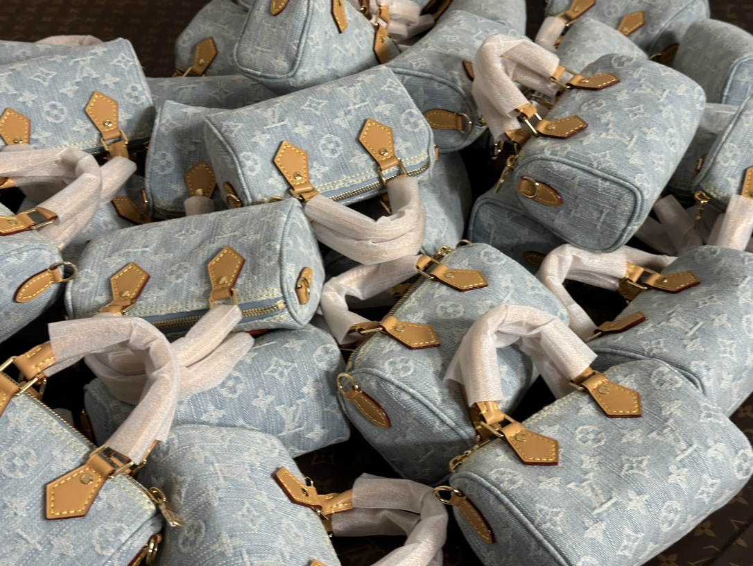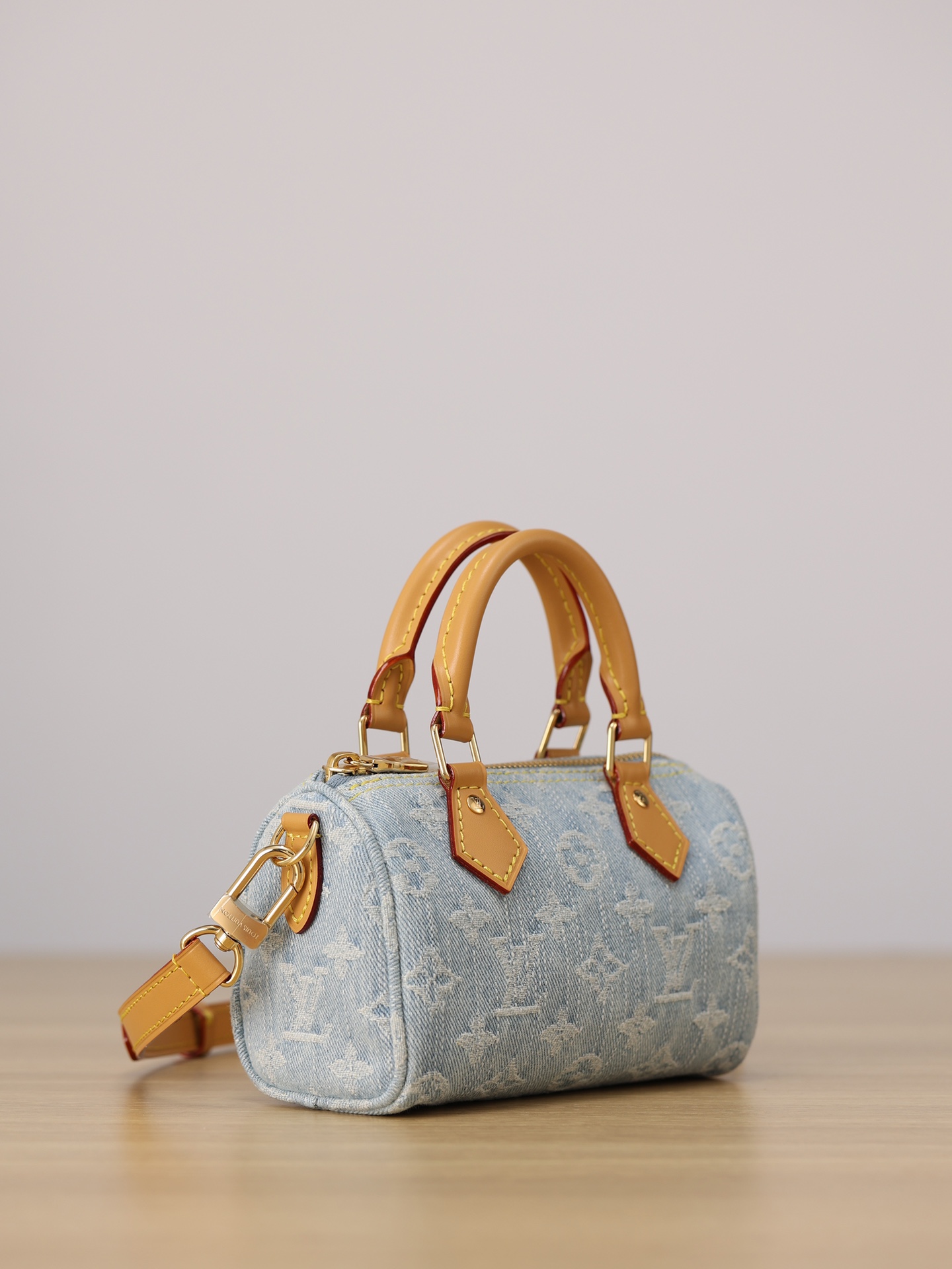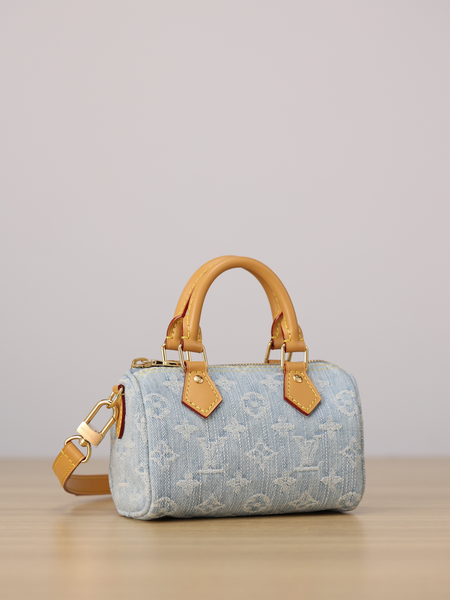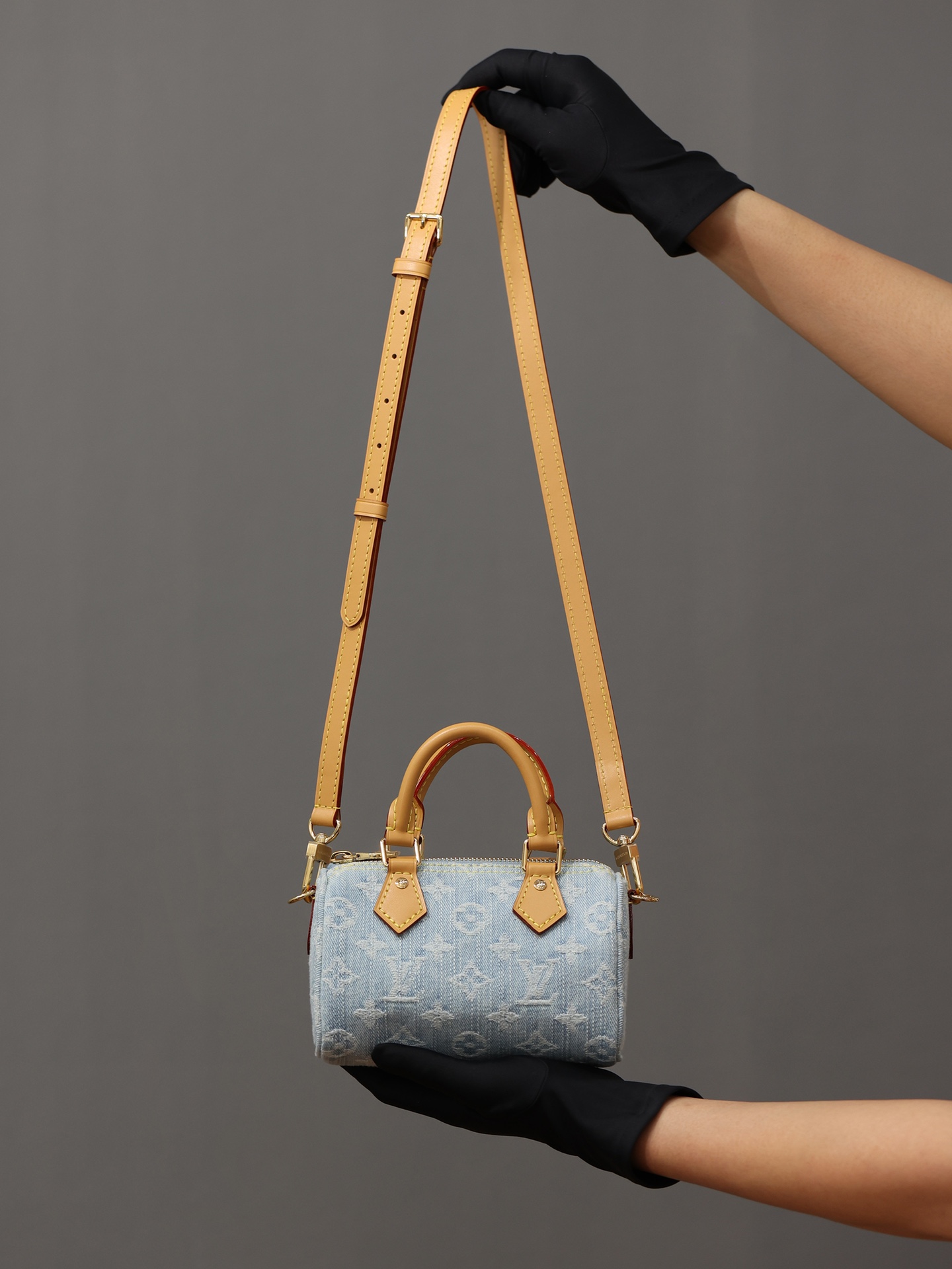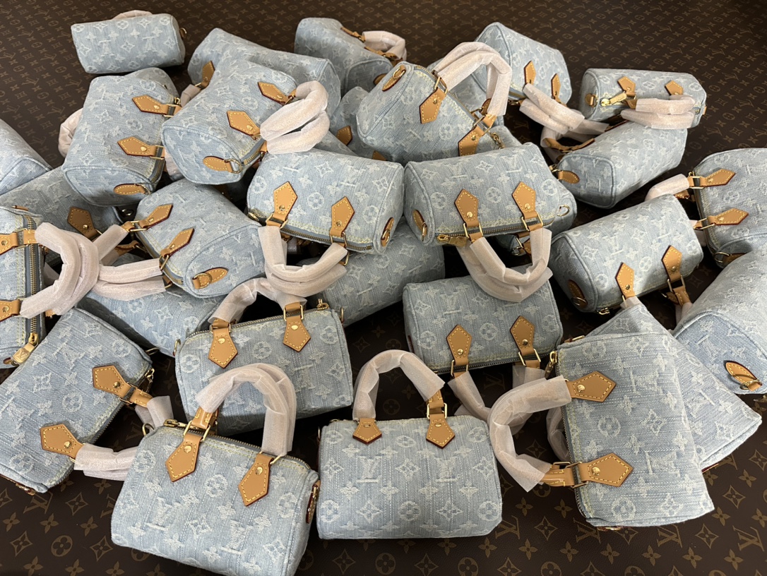 【独家实拍 M11212 】本款 Nano Speedy 手袋为棉质丹宁织就 Monogram 图案,经漂白和砂洗后呈现复古风范。牛皮革塑造手柄和可拆卸并调节的肩带,呈现微妙做旧效果。
