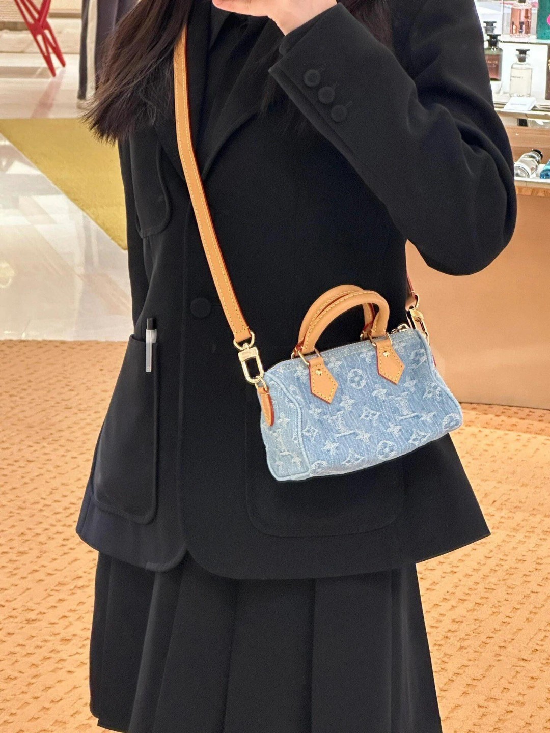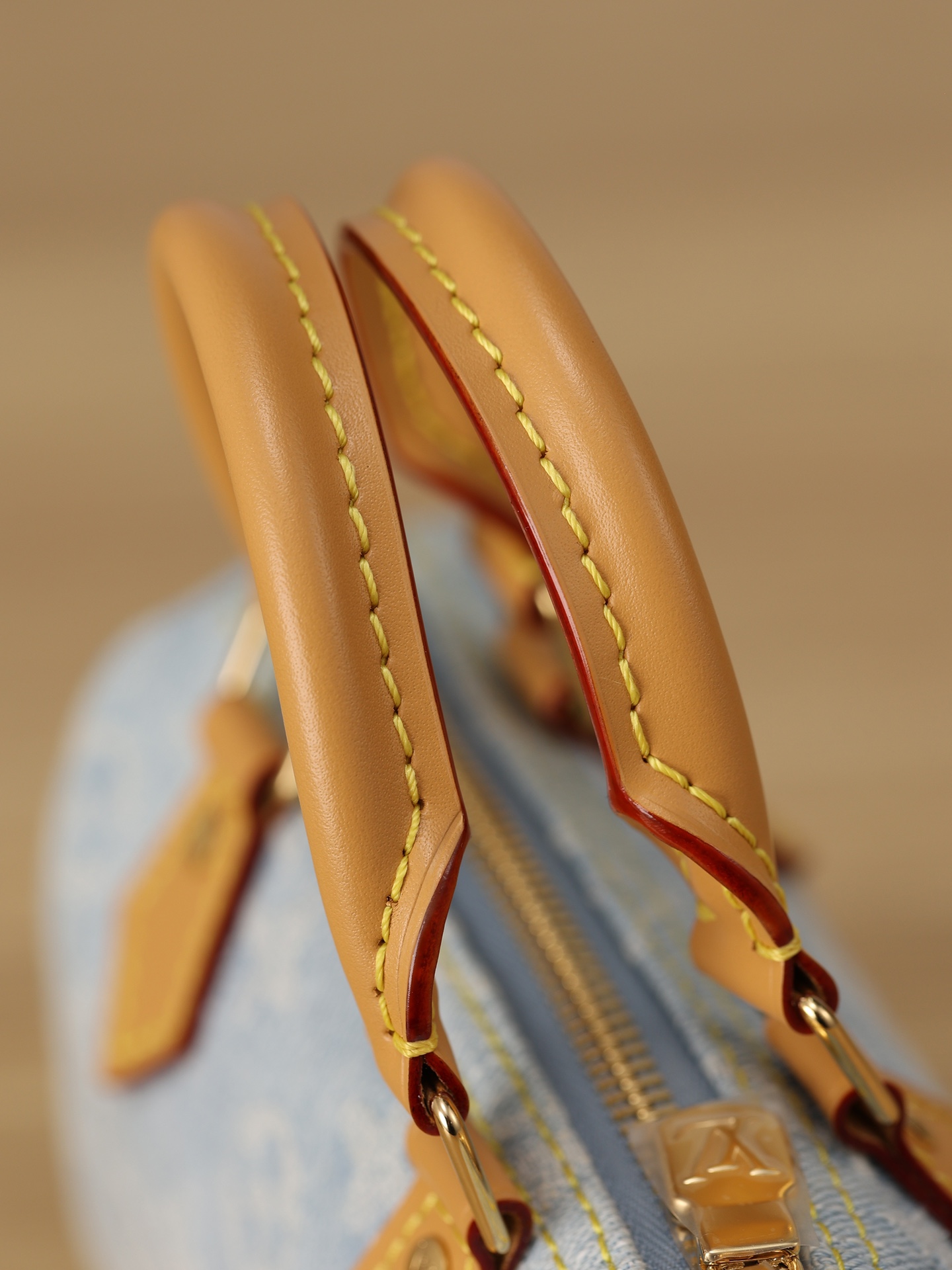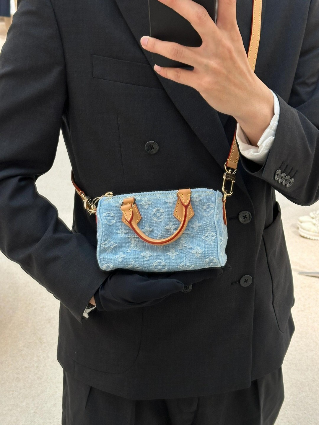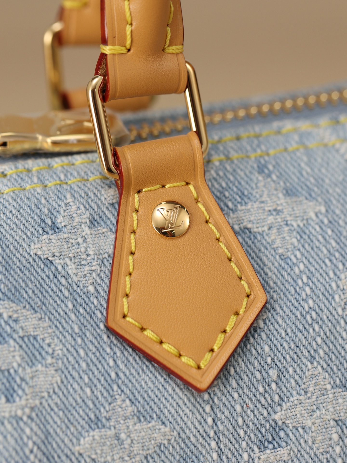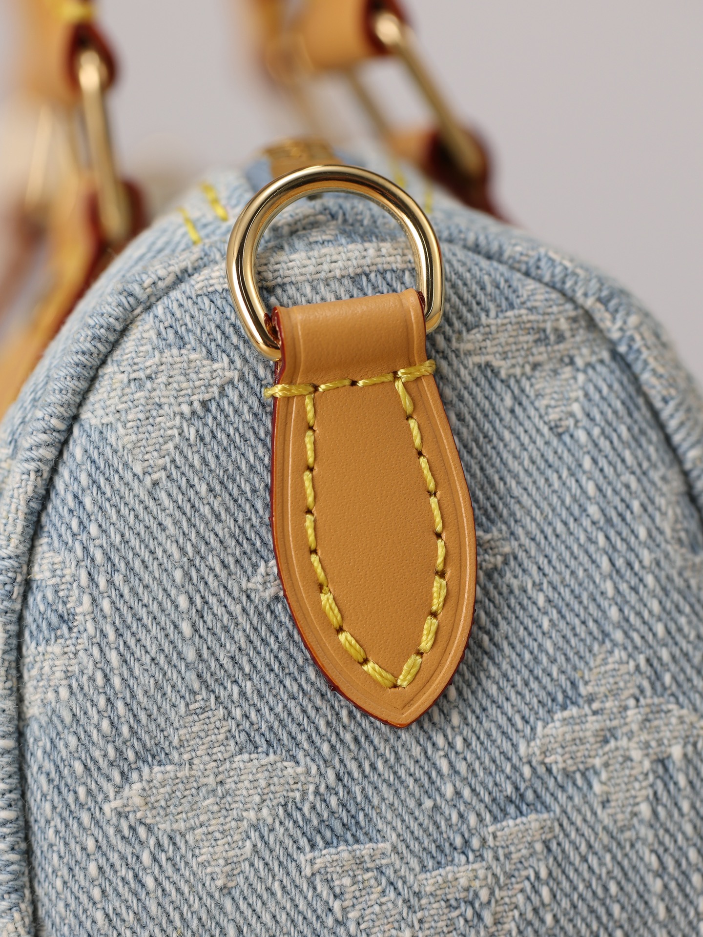 【独家实拍 M11212 】本款 Nano Speedy 手袋为棉质丹宁织就 Monogram 图案,经漂白和砂洗后呈现复古风范。牛皮革塑造手柄和可拆卸并调节的肩带,呈现微妙做旧效果。