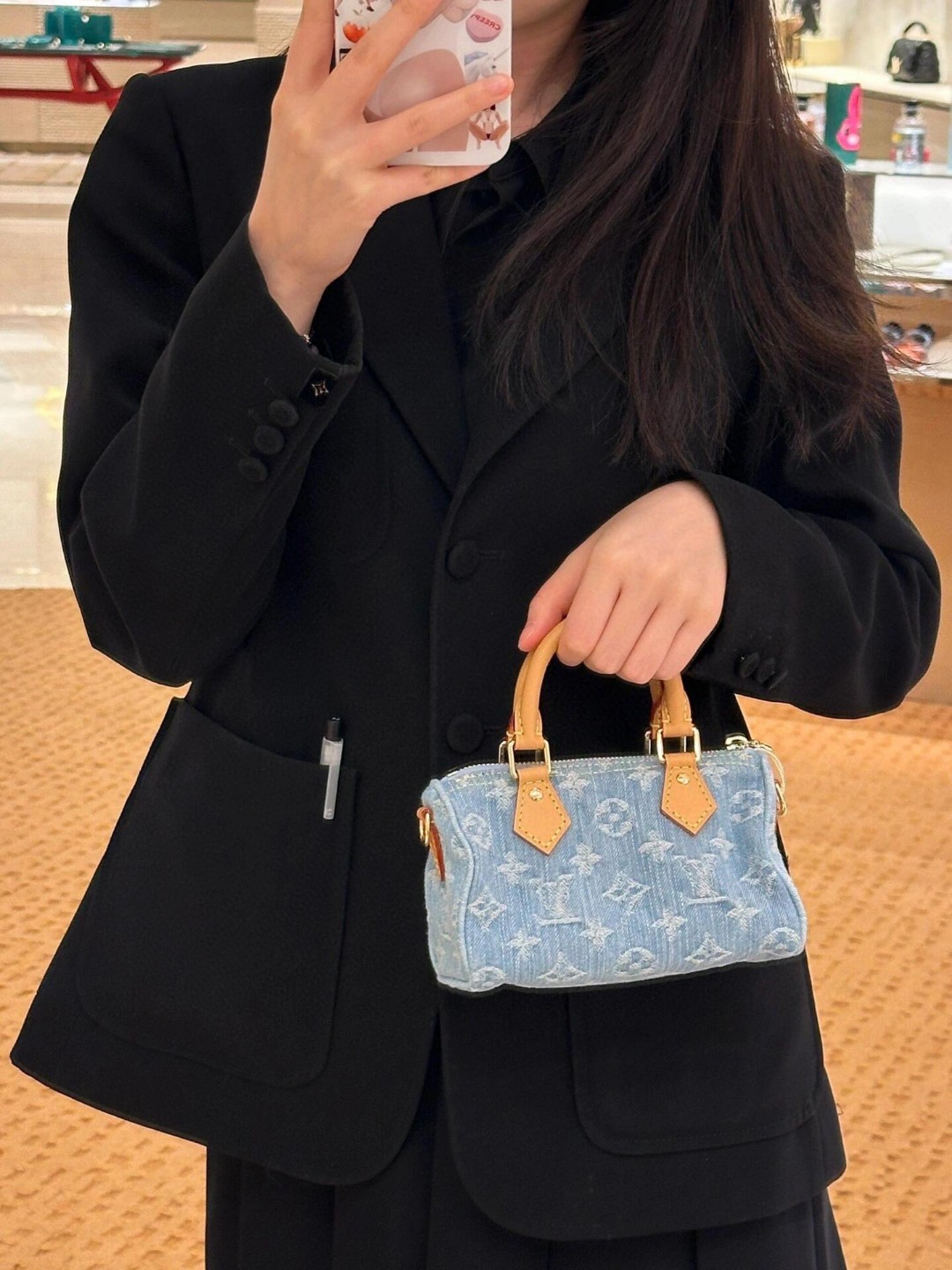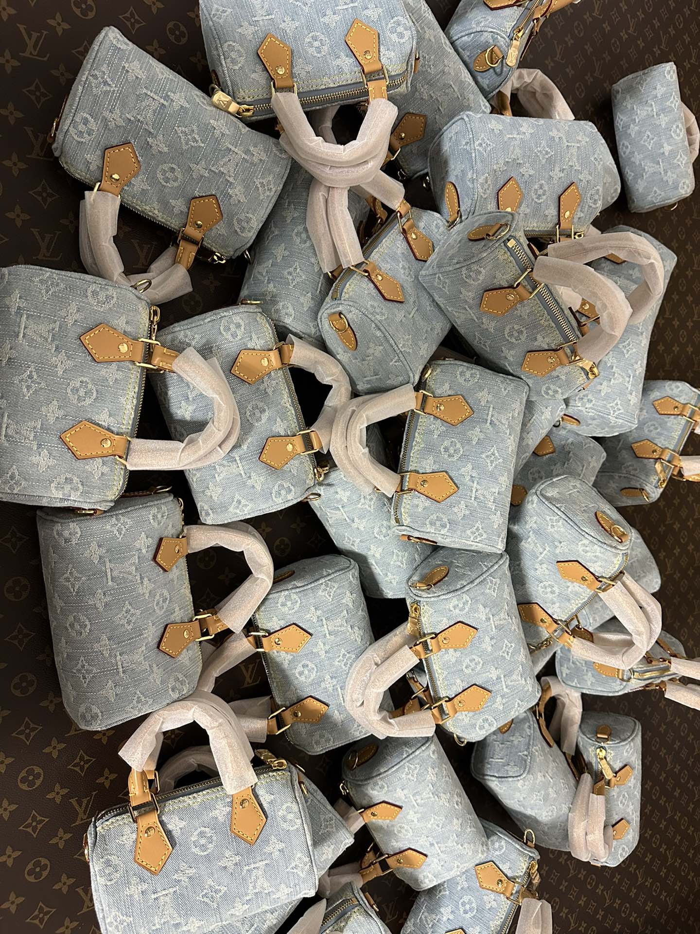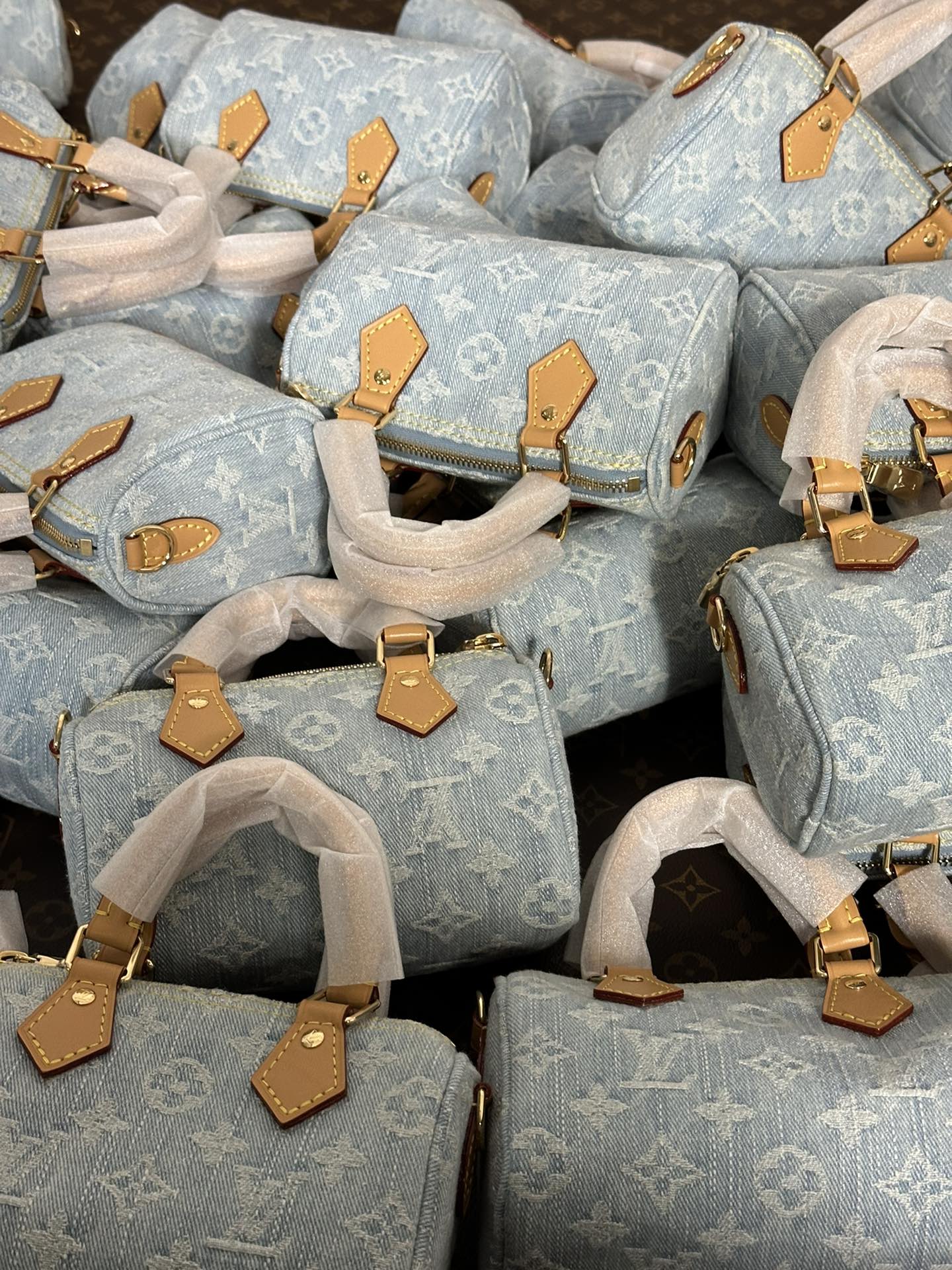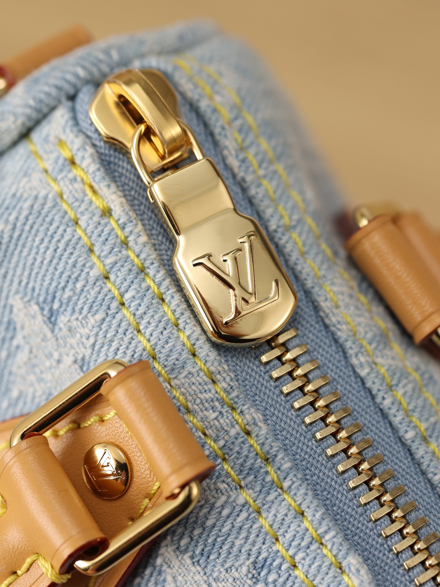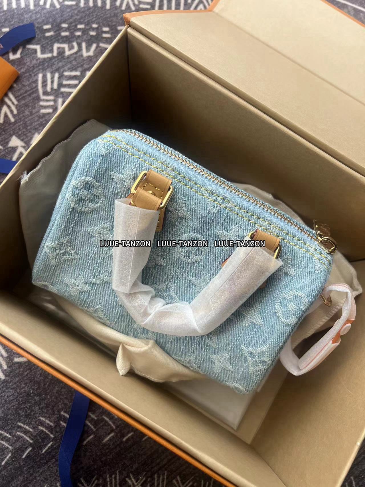 【独家实拍 M11212 】本款 Nano Speedy 手袋为棉质丹宁织就 Monogram 图案,经漂白和砂洗后呈现复古风范。牛皮革塑造手柄和可拆卸并调节的肩带,呈现微妙做旧效果。