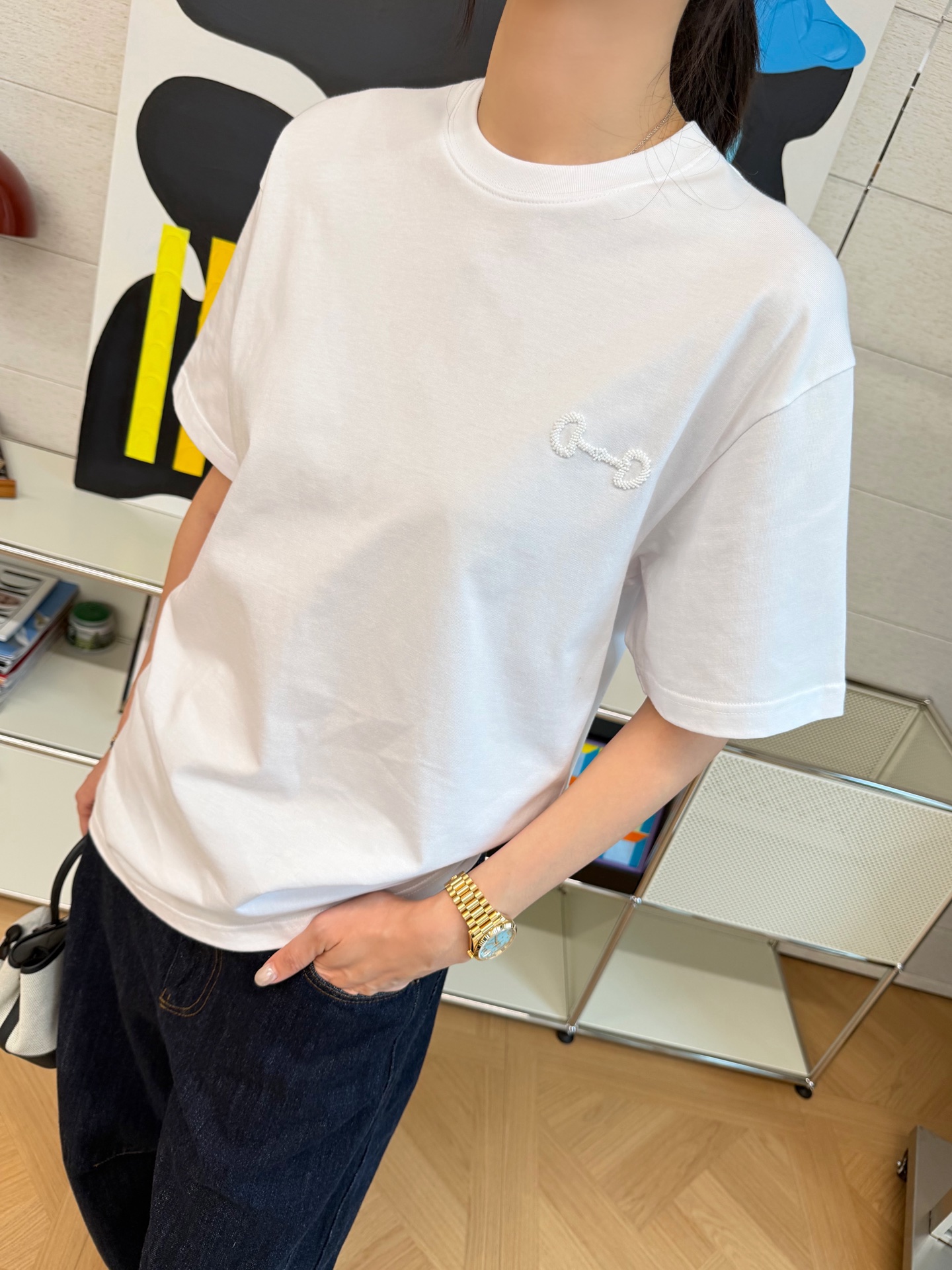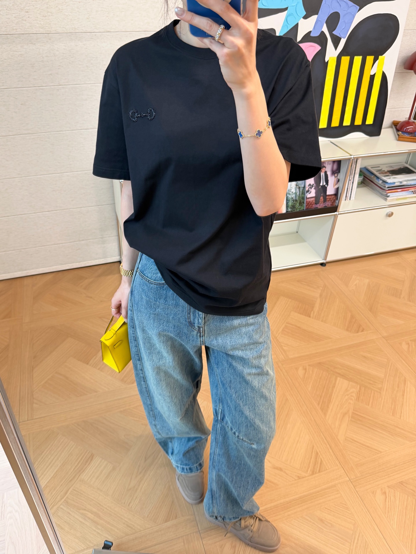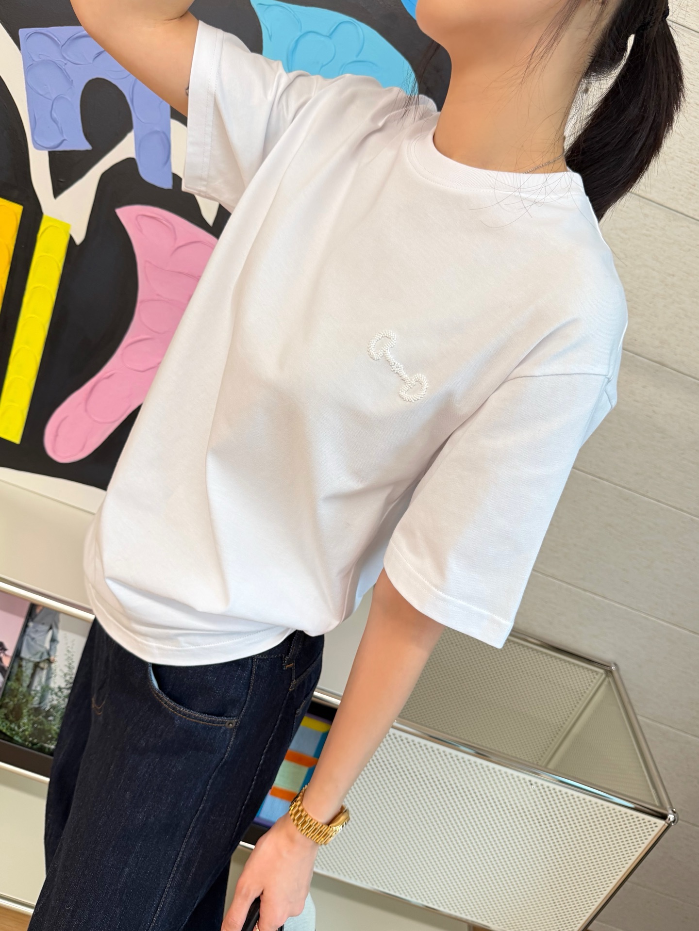 最新款 T恤,巧妙融入饰珠粒马衔扣刺绣,一展别致韵调〰️以其优质的面料、舒适的触感、精致的工艺和百搭的设计,成为了衣柜中不可或缺的一款单品, 胸前钉珠设计提升精致度🔝宽松版型,适合各种体型的人群穿着,无论是喜欢休闲风格的你,还是追求简约设计的你,都能在这款T恤中找到属于你的那份风格💗黑/白两个色,码数SML