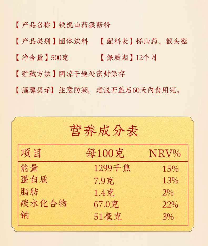 铁棍山药猴菇粉500g 营养早餐即食代餐食品冲调 胃暖暖的很舒服 真实材料 【固本堂】