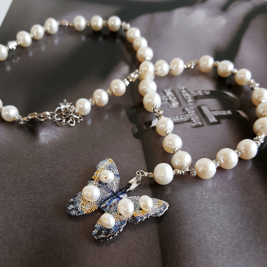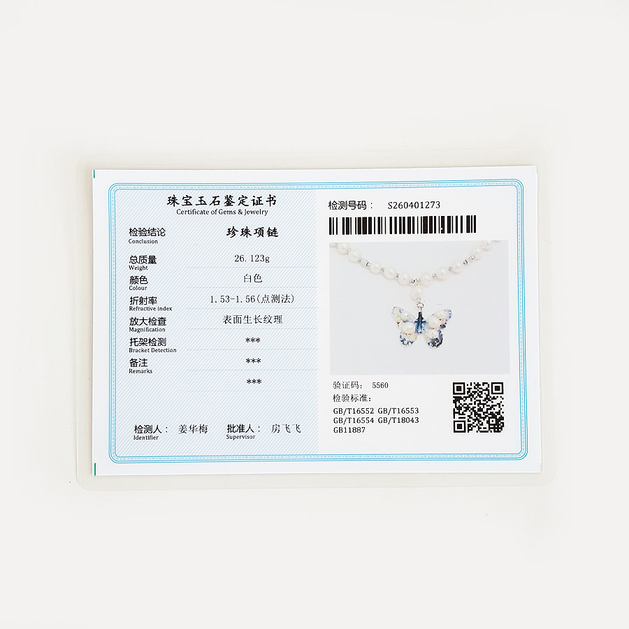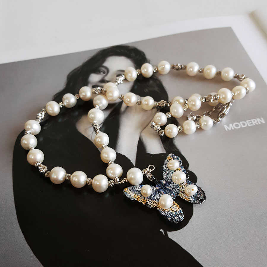 名称 | 天然近圆约7-8MM白色珍珠配蓝色蝴蝶造型吊坠项链 |