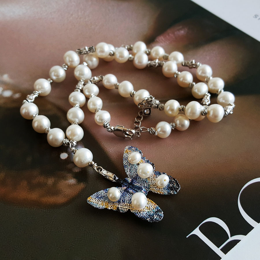 【天然正品】 天然近圆约7-8MM白色珍珠配蓝色蝴蝶造型吊坠项链 链长:44CM(皆取最大值) 200426NJT46