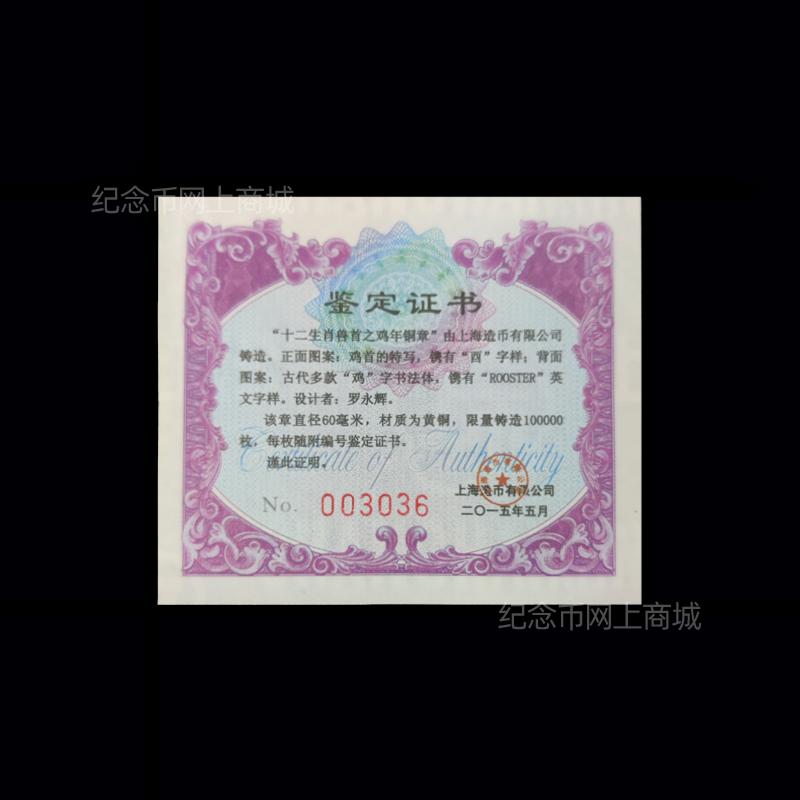 【上海造币】十二生肖鸡年铜章 直径60mm