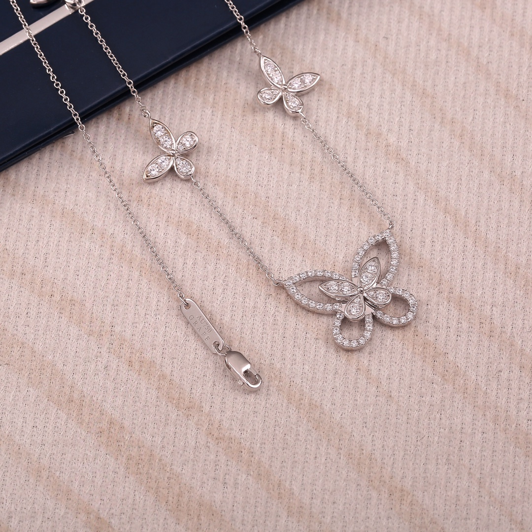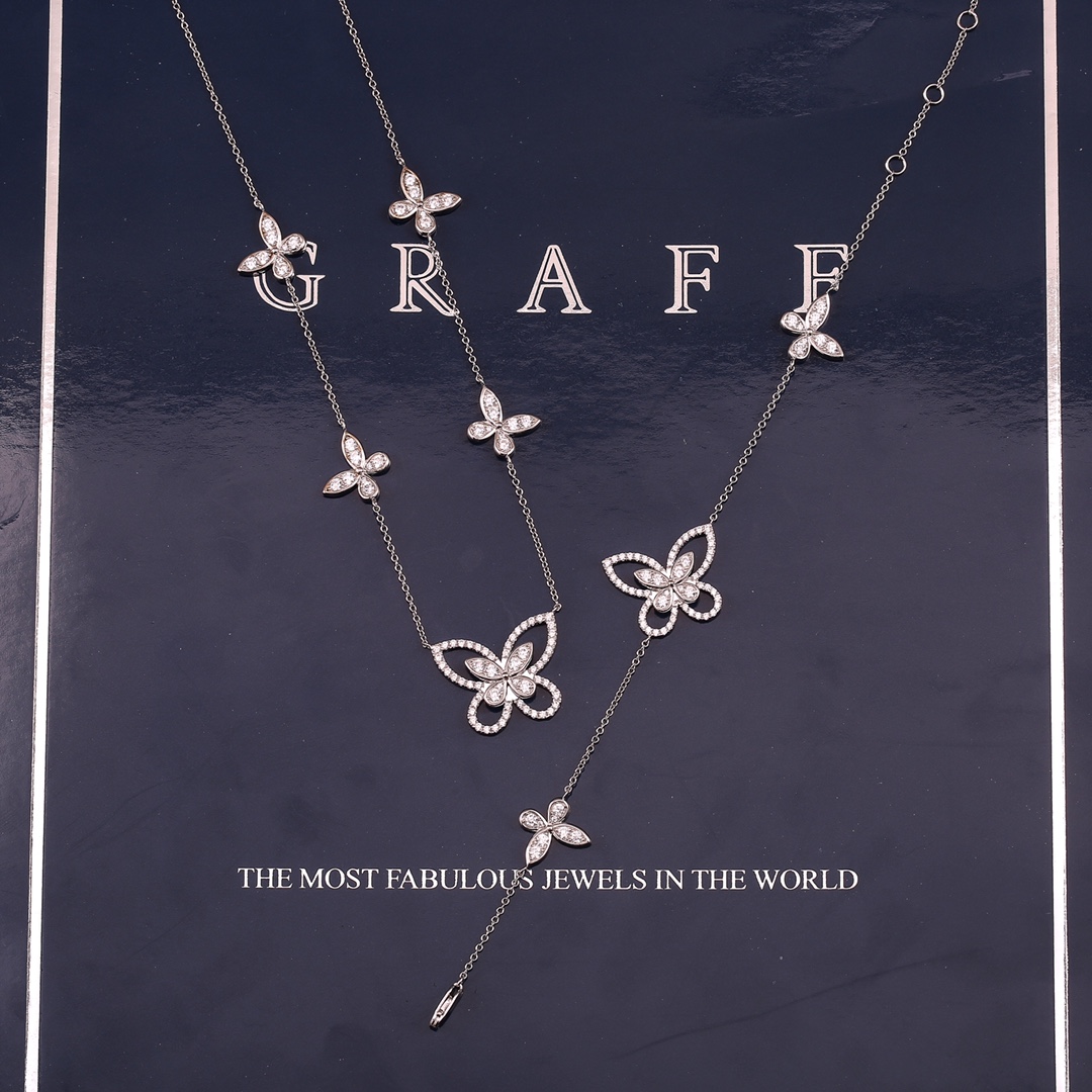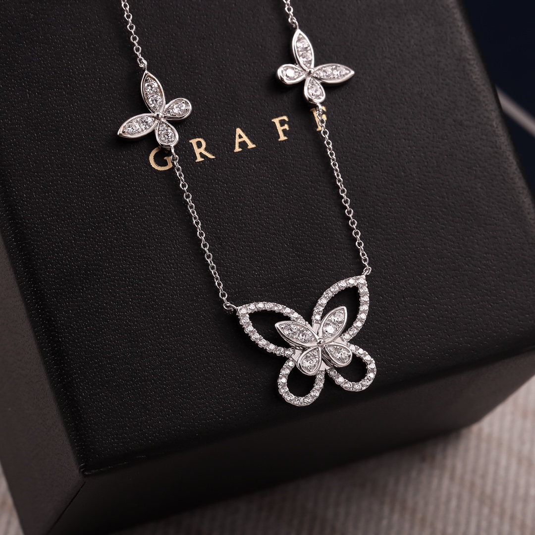 Princess满钻蝴蝶项链 GR@FF的款,高级珠宝的设计大气耐看,很精美的一款蝴蝶项链,翩翩姿态,优雅高贵。镂空仙子能够成就你成为高级仙子,四个小蝴蝶组成,灵动闪现💓幻影蝴蝶作为G家标志性款式,款式的美感毋庸置疑。上身是比较有存在感的一款项链,大小适中不浮夸,搭配裙装超级美。通体925银材质,镶嵌定制进口仿真钻 配精美包装