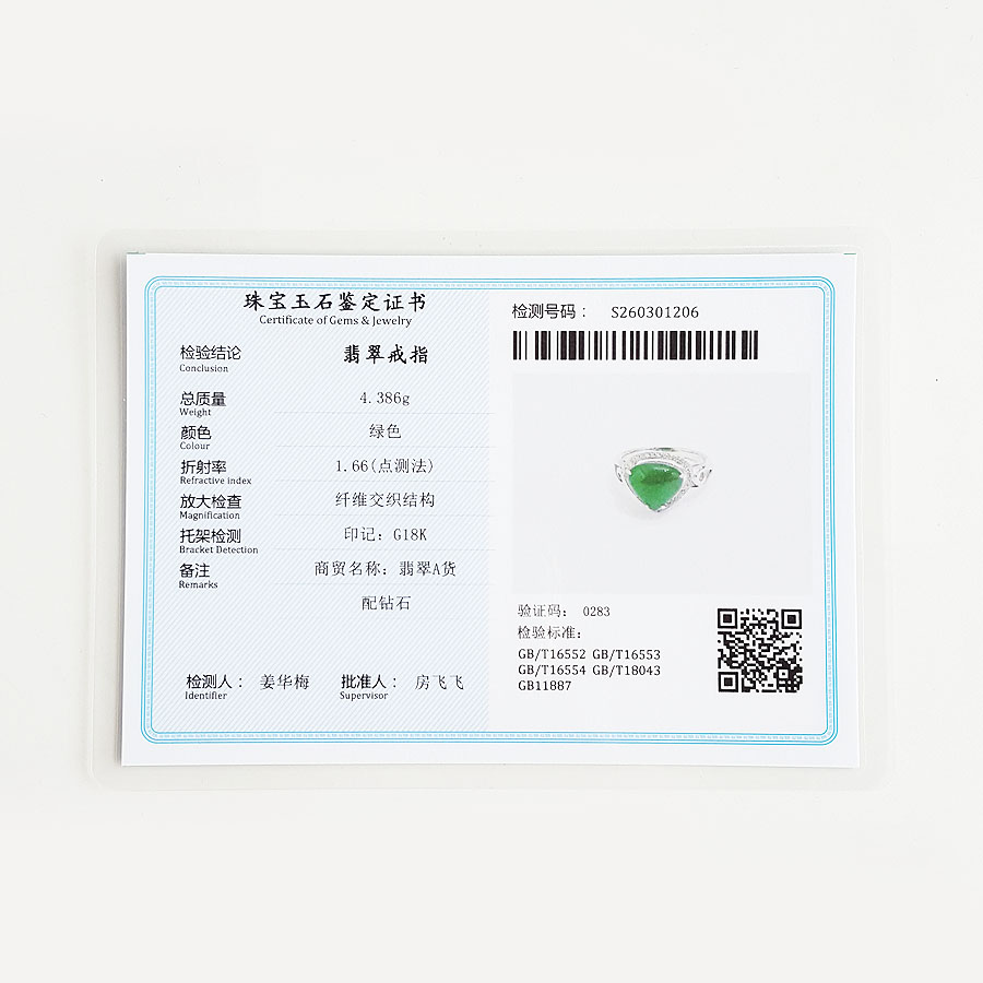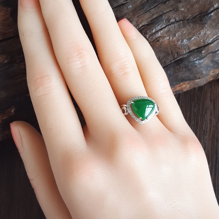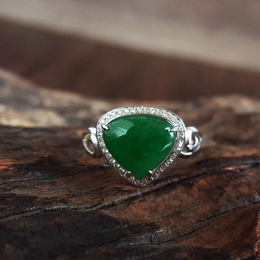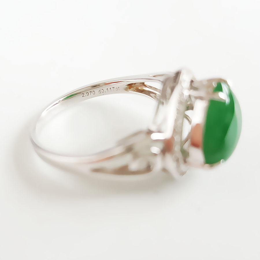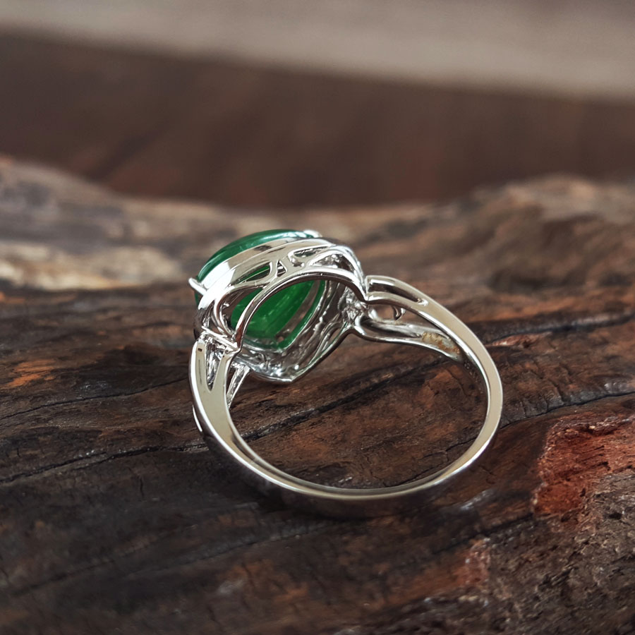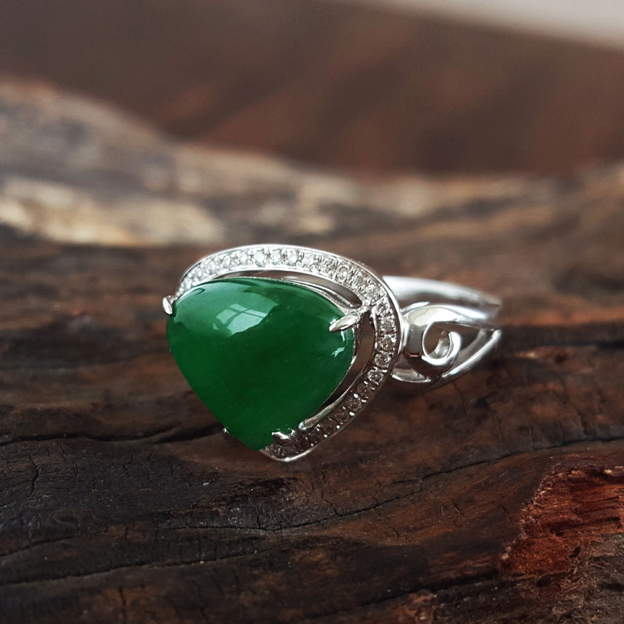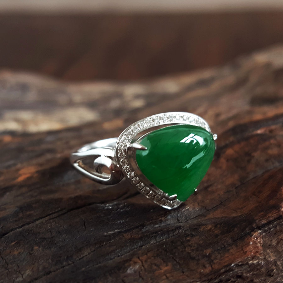 名称 | AU750白金镶钻镶天然细腻糯种满绿水滴蛋面翡翠戒指 |