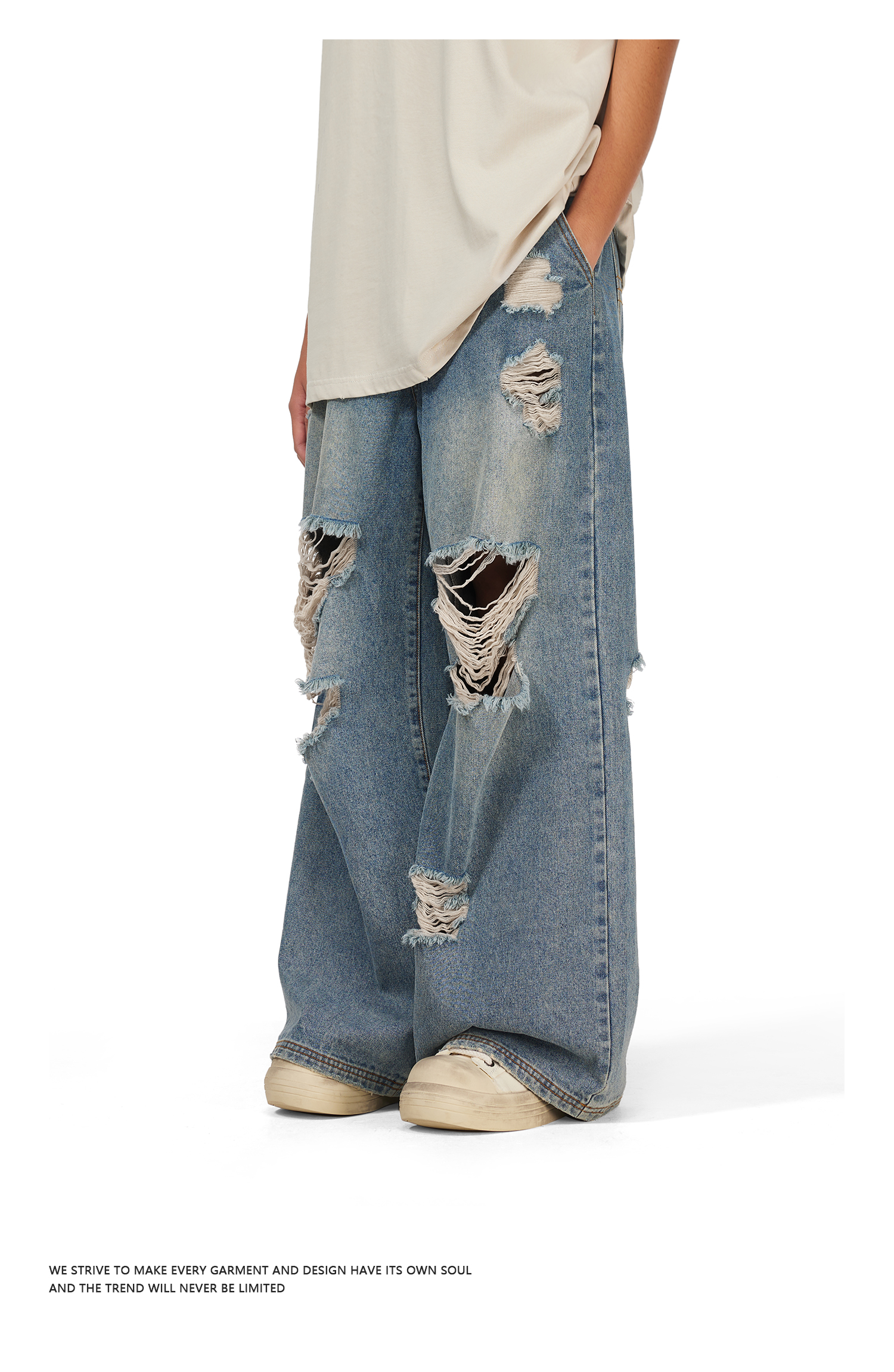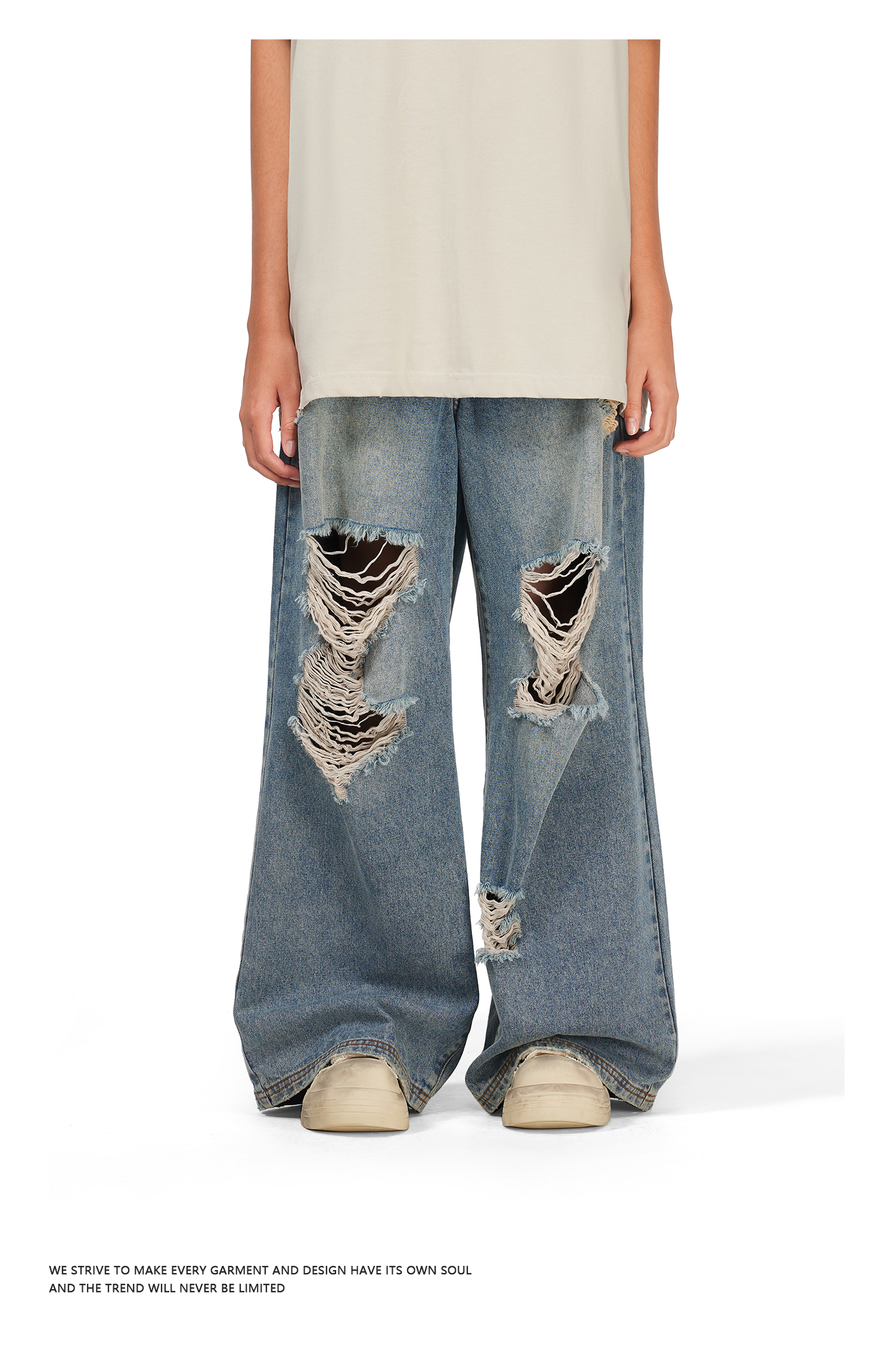 FDR官方店 美式复古做旧破洞牛仔裤女夏季百搭宽松运动直筒长裤子