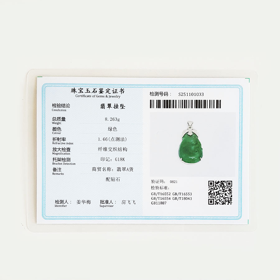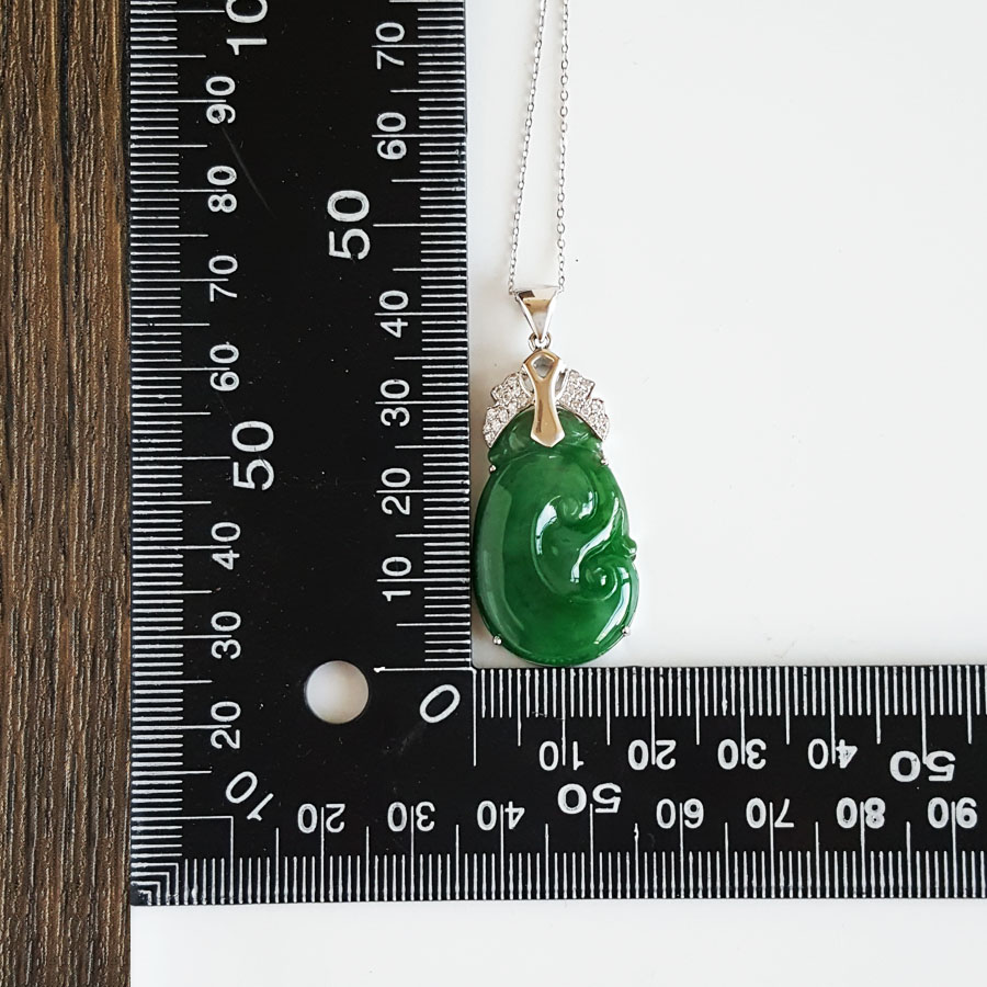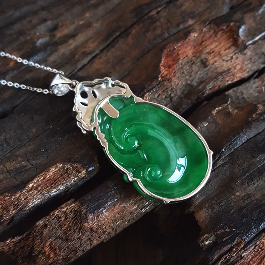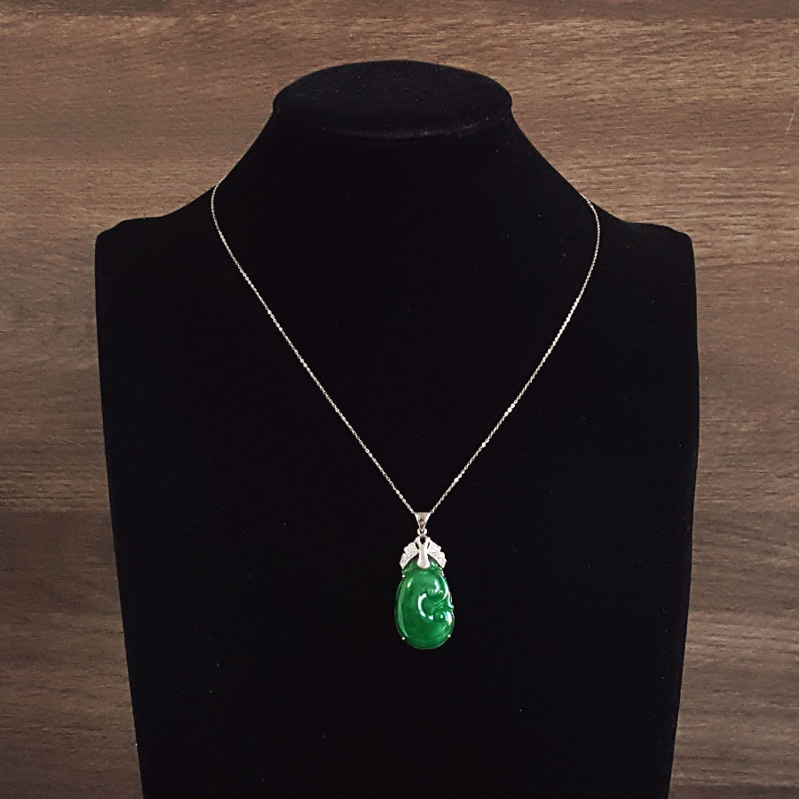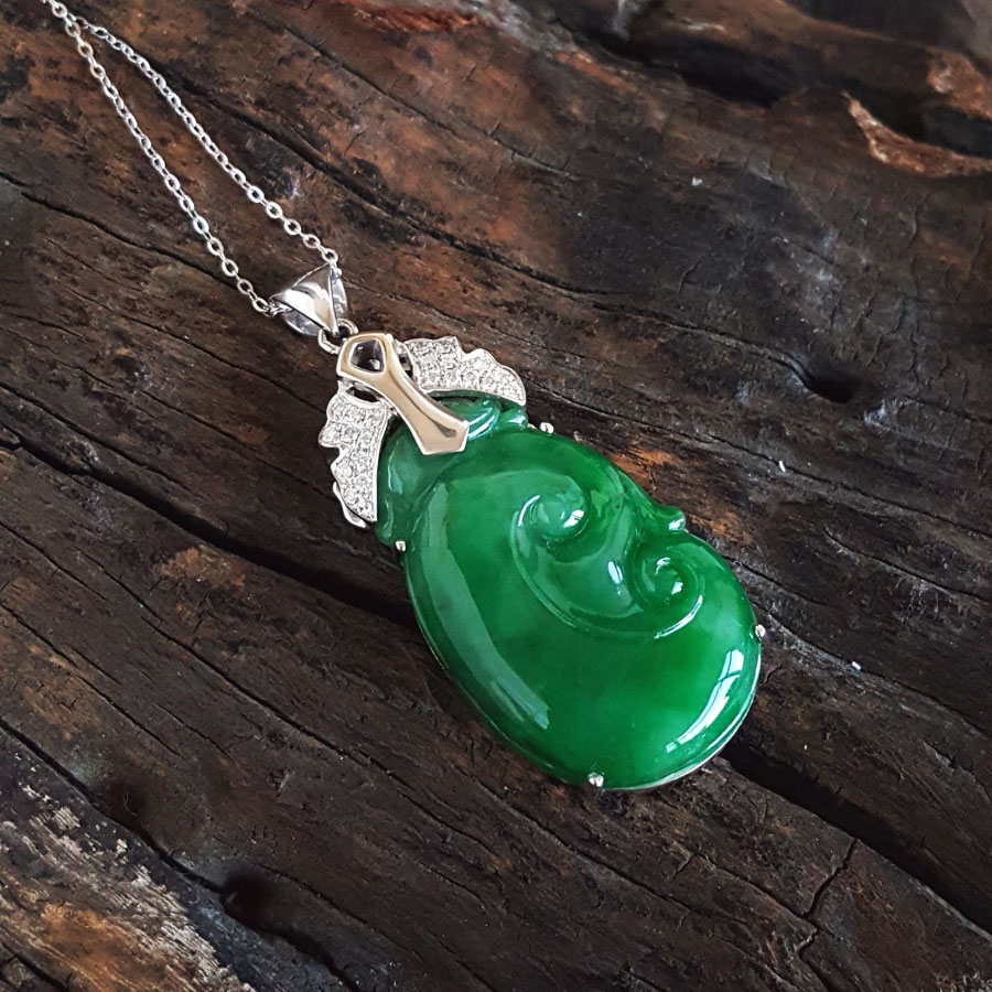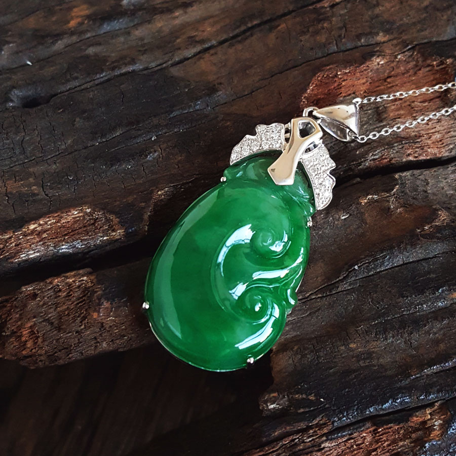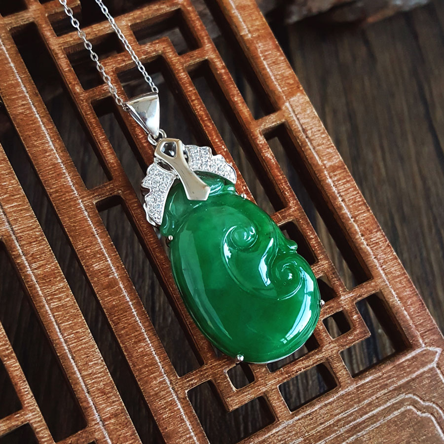 名称 | AU750白金镶钻镶天然细腻满绿糯种如意(万事如意)翡翠吊坠项链 |