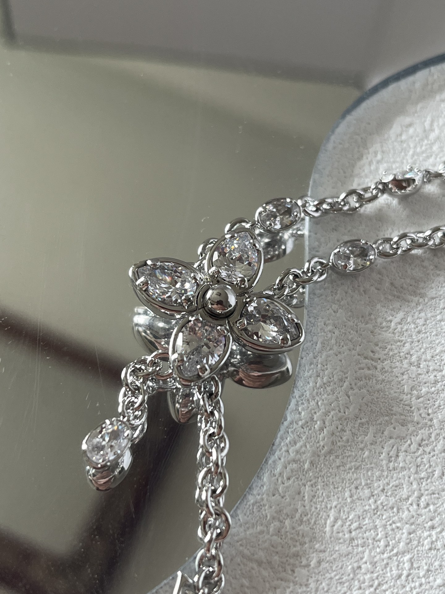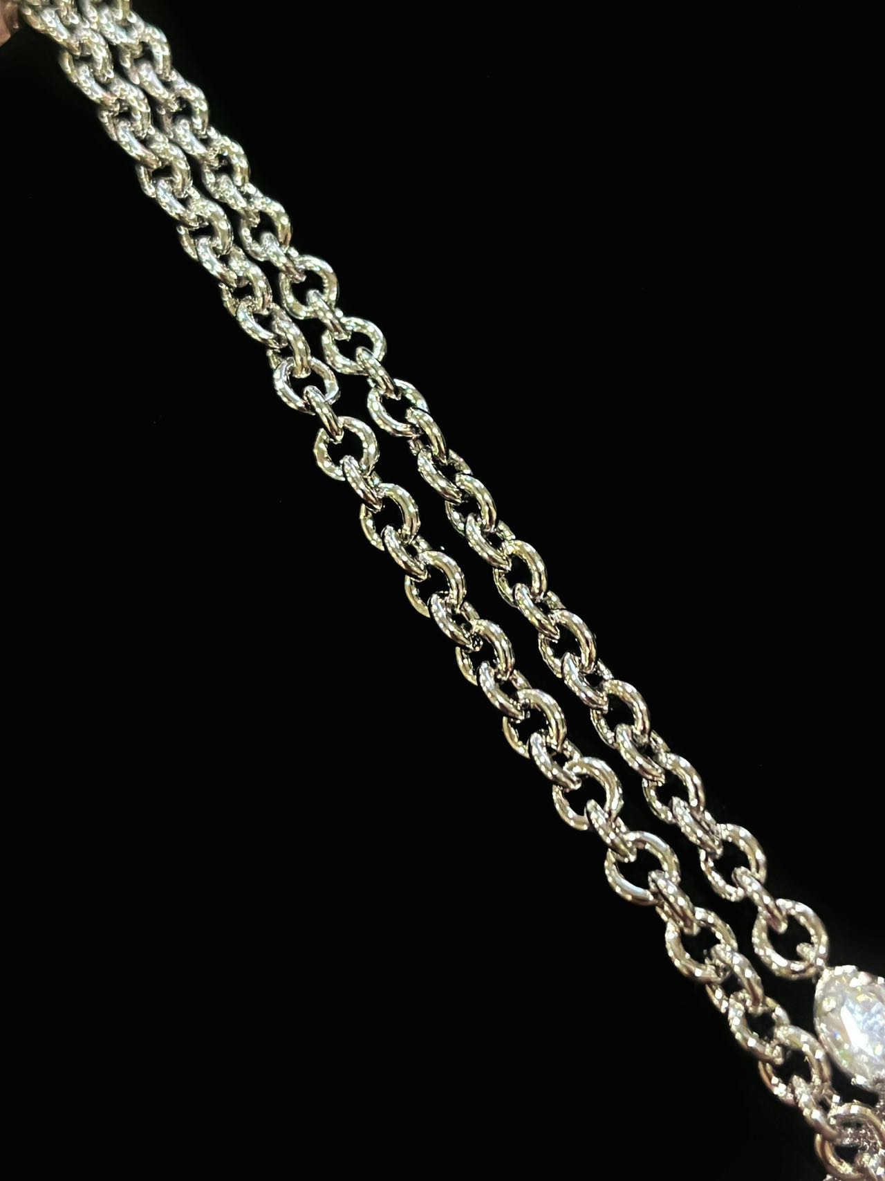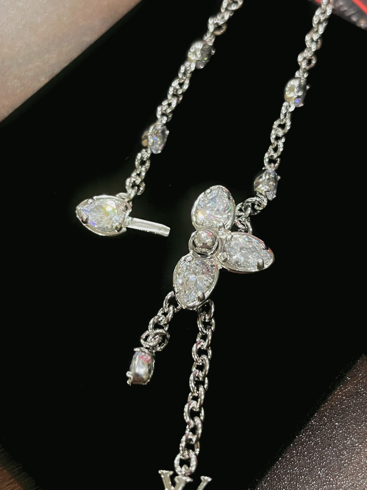 这款项链的石头都是采用了5A锆石。“5A”是对其光泽度、净度、切工、色彩及稳定性的全方位高标准评价。这条项链上的每一颗锆石,都经过精心挑选与精细打磨,确保每一面都能光彩夺目