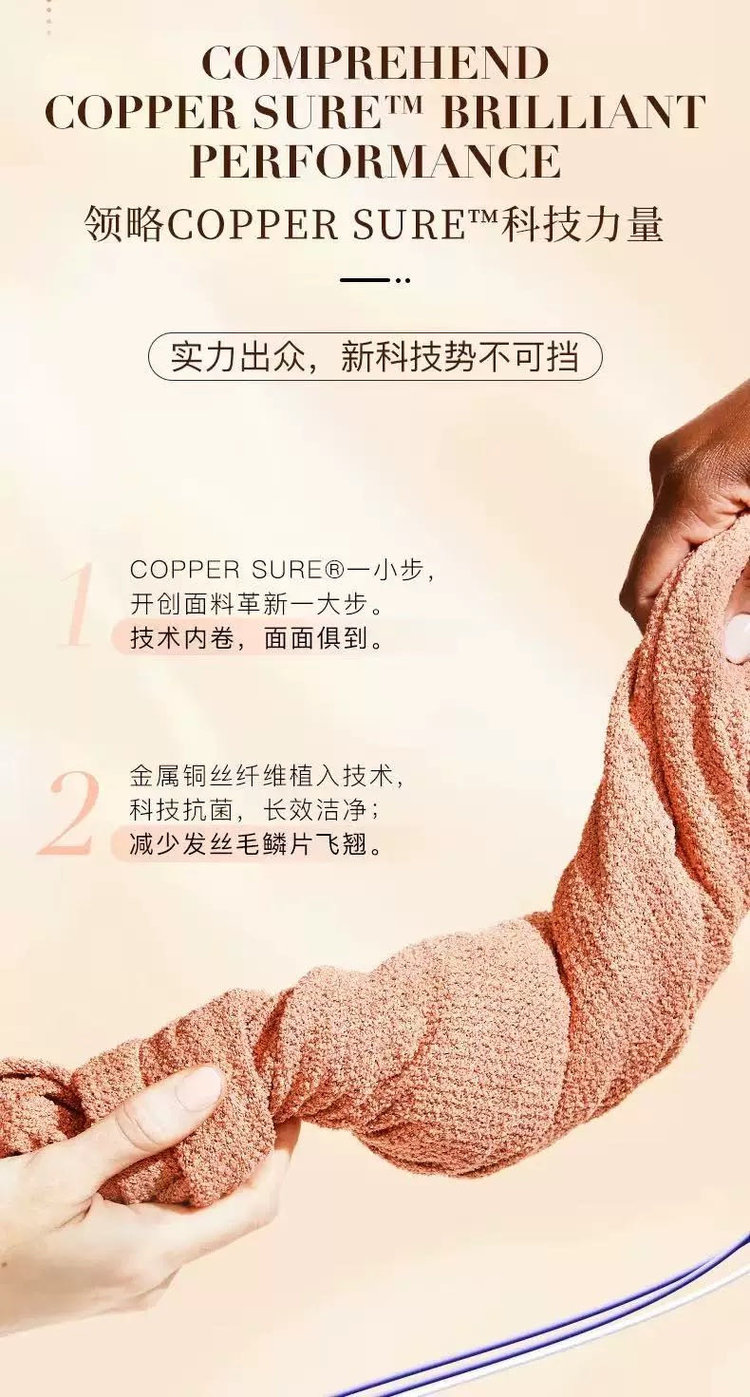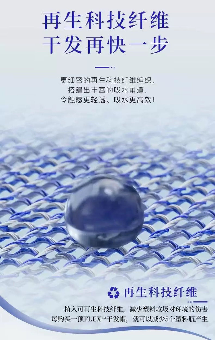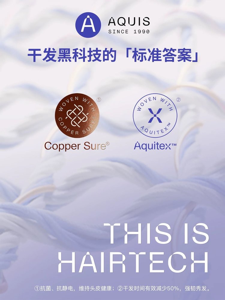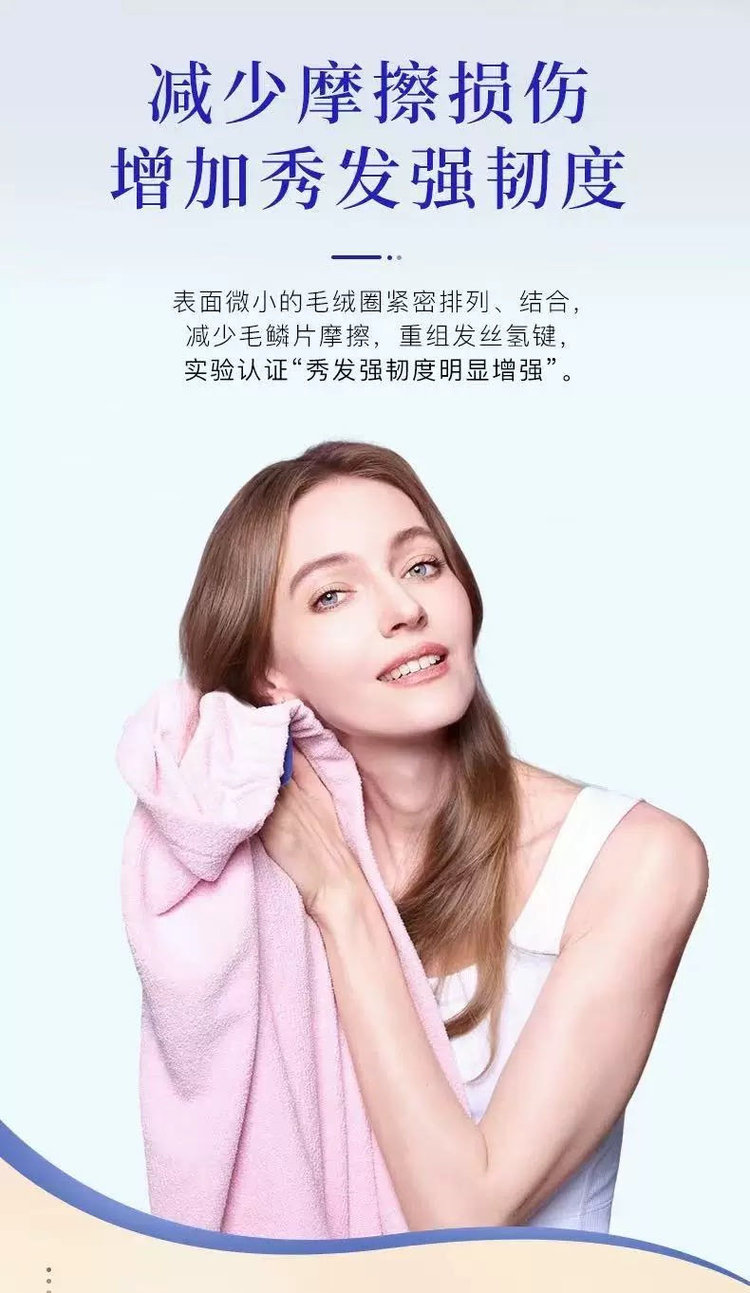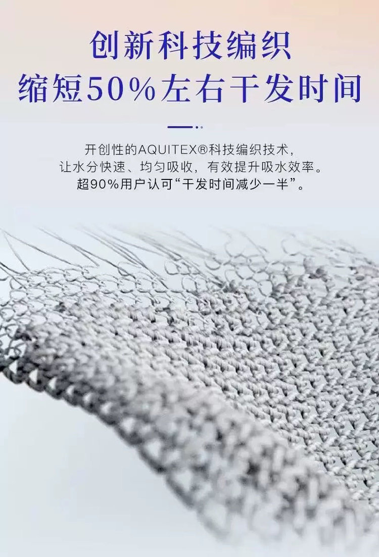 第五代干发帽采用升级的AQUITEX超细纤维织造单根纤维直径仅为发丝的1/200能通过毛细效应瞬间锁住水分子!!相比普通棉毛巾!!吸水效率提升5倍,纤维表面做了抗静电处理,擦拭时不会产生毛躁静电,对染烫后的受损发质更友好。