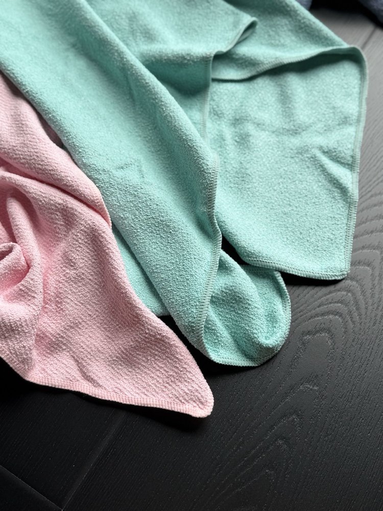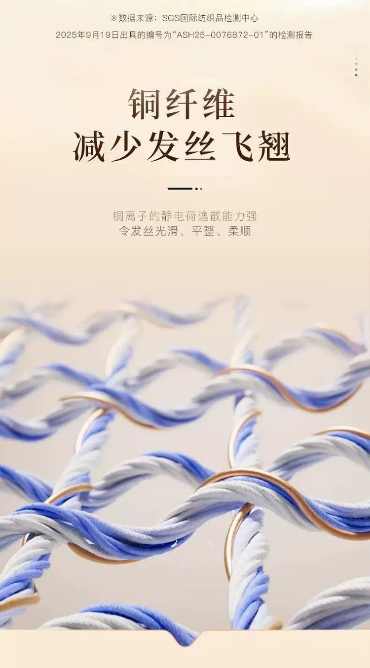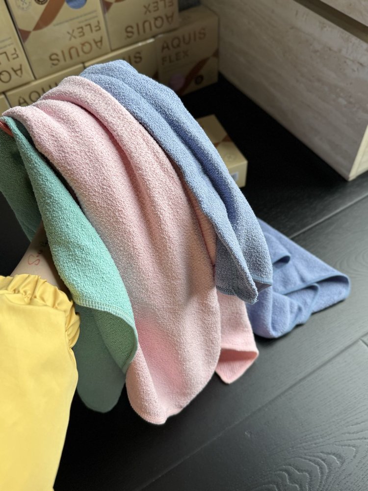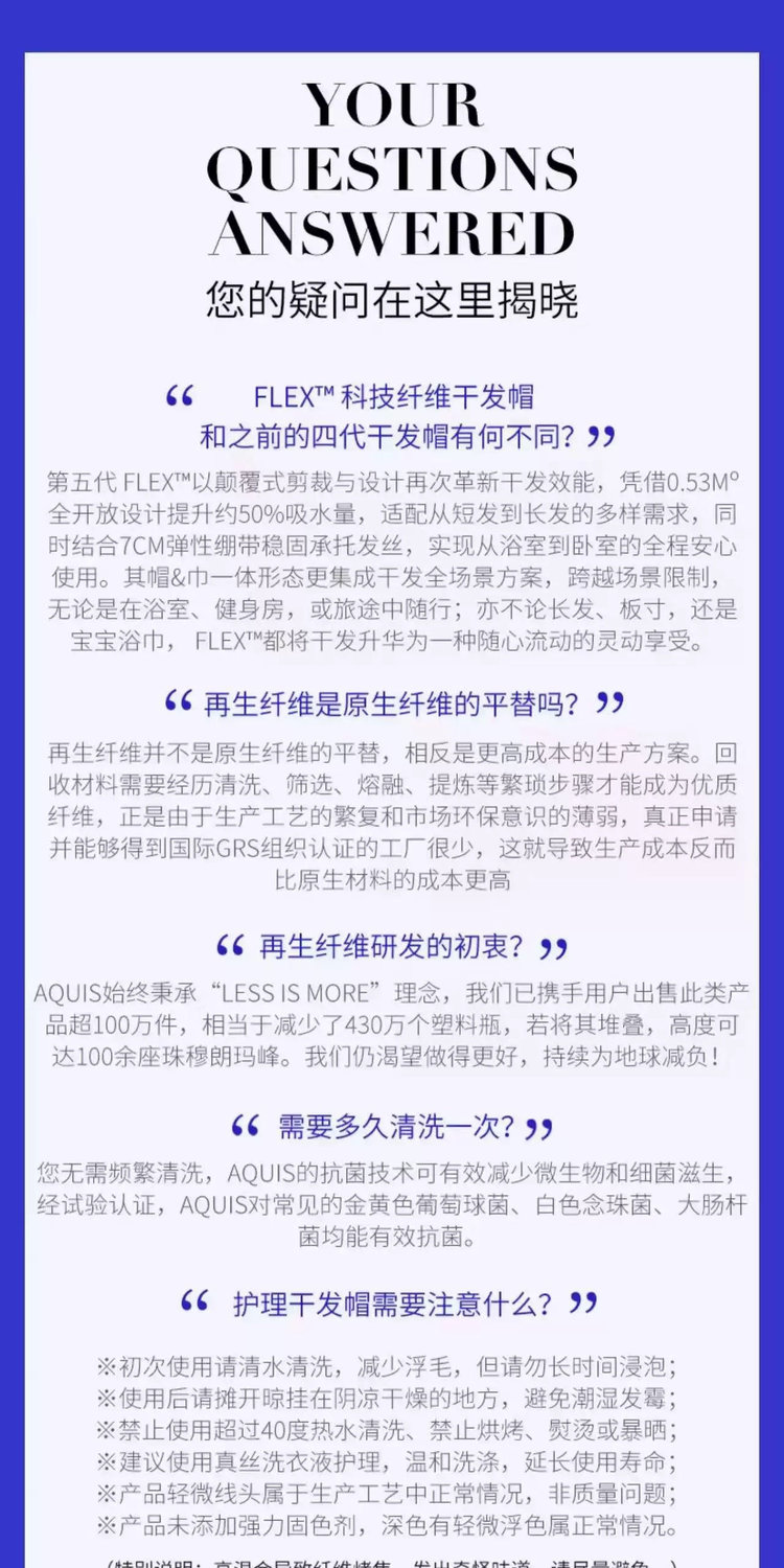 第五代干发帽采用升级的AQUITEX超细纤维织造单根纤维直径仅为发丝的1/200能通过毛细效应瞬间锁住水分子!!相比普通棉毛巾!!吸水效率提升5倍,纤维表面做了抗静电处理,擦拭时不会产生毛躁静电,对染烫后的受损发质更友好。