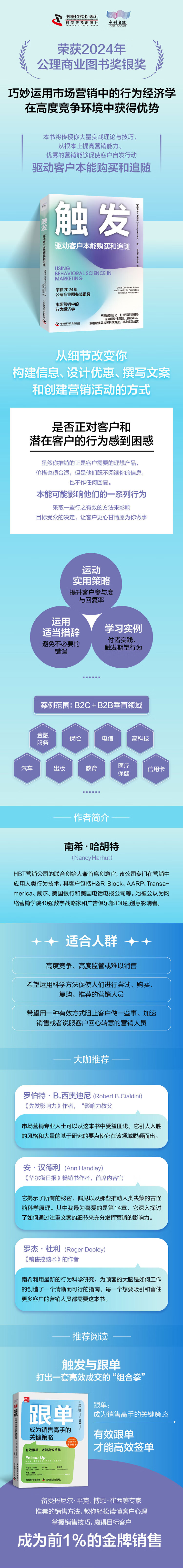 《触发》展示了如何将行为科学原理应用于营销的关键领域,包括营销传播、电子邮件、直邮和广告活动、社交媒体营销和销售漏斗转换策略。本书高度实用且易于理解,收录了来自美国电话电报公司(AT&T)、苹果、流媒体音乐服务平台Spotify和《华尔街日报》的案例研究和实例,展示了这些方法在实践中的运用。