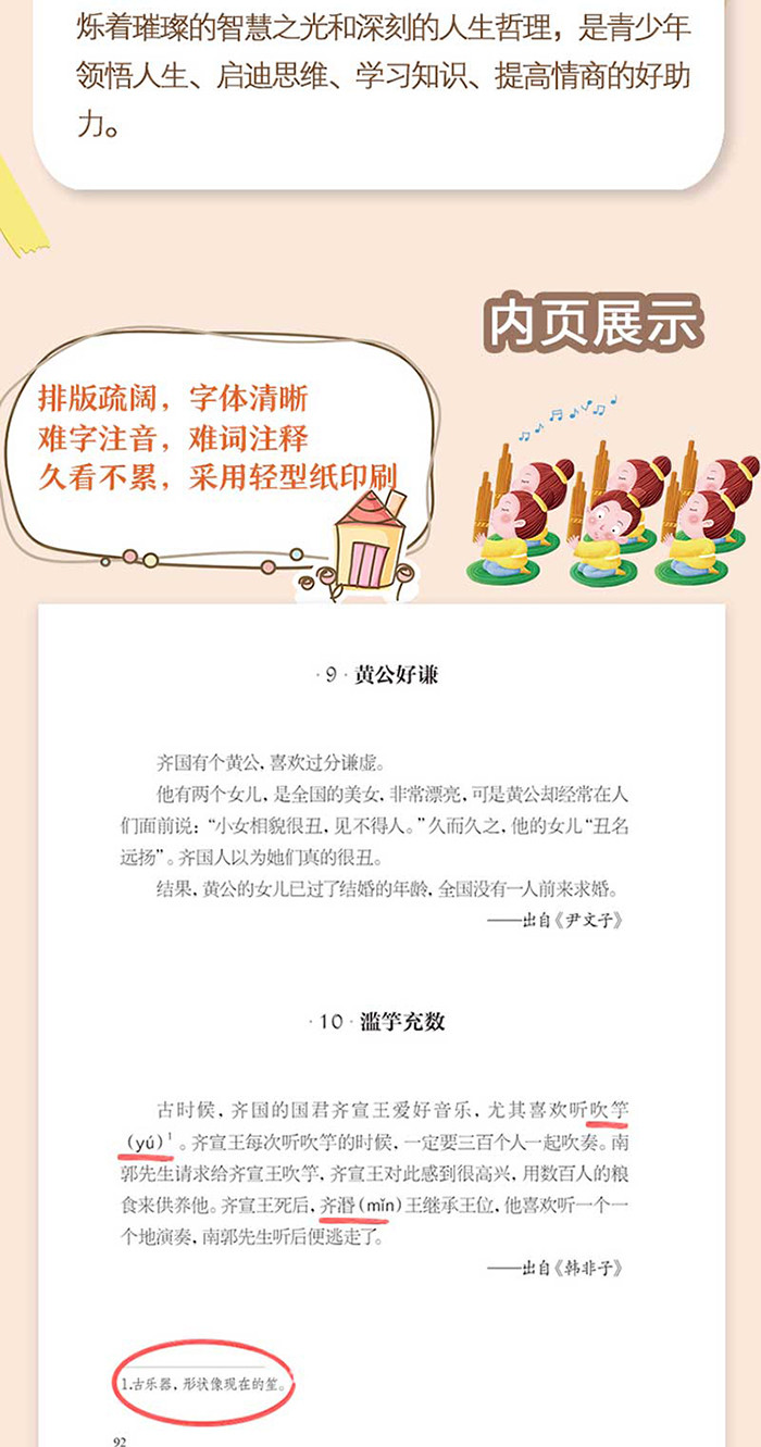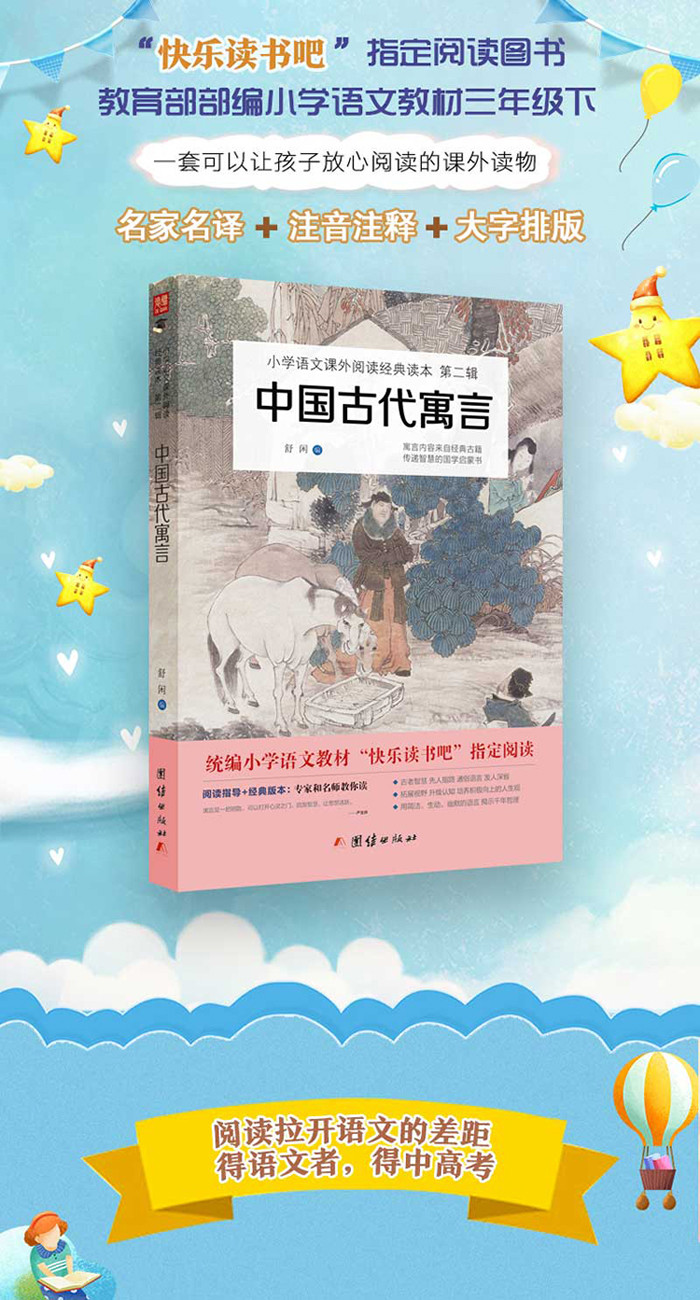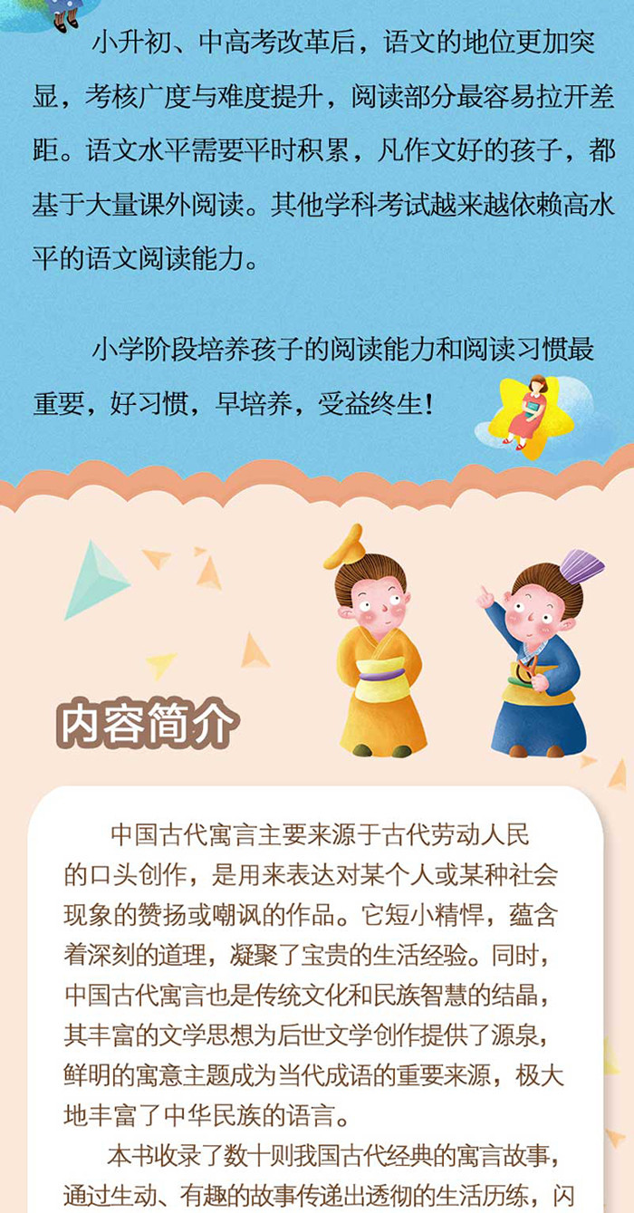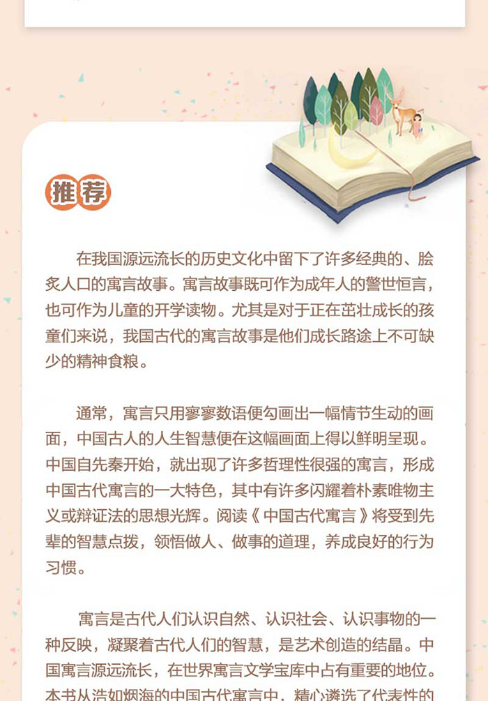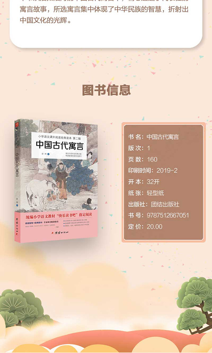 【基本信息】 书籍名称:中国古代寓言(教育部统编小学语文教材“快乐读书吧”指定阅读三年级下) 作者:舒闲 编 出版社:团结出版社 定价:20.00 书号:9787512667051 出版日期:2019.2 版次:1 页数:160 印刷时间:2019-3 开本:32开 纸张:轻型纸 印次:1 包装:平装 中图分类号:G624.233 【书籍目录】 揠苗助长 蒙鸠筑巢 智子疑邻 买椟还珠 画鬼最易 郑人买履 守株待兔 郢书燕说 涸泽之蛇 二人相马 老马识途 表水涉澭 刻舟求剑 其父善游 良狗捕鼠 次非斩蛟 燕人返国 疑邻窃斧 关尹子教射 画蛇添足 惊弓之鸟 南辕北辙 塞翁失马 对牛弹琴 周处除三害 望梅止渴 杯弓蛇影 熟能生巧 盲人识日 乌贼求全 威无所施 赵人患鼠 象虎 道士救虎 常羊学射 若石之死 师旷调琴 蛛与蚕 大鼠 螳螂捕蛇 偷鸭求骂 龙 牧童逮狼 金钩桂饵 熊渠子射石 卞庄子刺虎 盲人摸象 束氏畜猫 楚人学舟 杀鸡骇猴 枭鸟东徙 不龟手药 庖丁解牛 轮扁斫轮 井底之蛙 东施效颦 楚王好细腰 学弈 唇亡齿寒 子罕不受玉 和氏璧 扁鹊见蔡桓公 曾子杀猪 心不在马 狗猛酒酸 拔杨容易栽杨难 晏子的车夫 不死之药 三人成虎 鹬蚌相争 伯乐怜马 千金市骨 凿井得人 生木造屋 愚公移山 薛谭学讴 齐人夺金 歧路亡羊 纪昌学射 泥偶与木偶 苛政猛于虎 嗟来之食 螳螂捕蝉 华歆救人 临江之麋 黔驴技穷 永州鼠 伤仲永 焚庐灭鼠 越人溺鼠 白雁落网 乌鸦与蜀鸡 许金不酬 狙公之死 八哥学话 孔雀爱尾 渔人与鸬鹚 牧童拾金 粗脖病 田杨画本 翠鸟移巢 狼 蜀鄙二僧 老翁捕虎 河中石兽 防患于未然 画饼充饥 帮人笞子 邯郸学步 庄子借米 朝三暮四 五十步笑百步 以羊易牛 偷鸡者 宣王好射 黄公好谦 滥竽充数 棘尖刻猴 自相矛盾 不识车轭 强取人衣 掩耳盗钟 杞人忧天 狐假虎威 人有卖骏马者 晏子使楚 橘化为枳 叶公好龙 博士买驴 蛤蟆惧诛 更渡一遭 书生救火 千里马 稀世古琴 蒙人叱虎 鸲鹆噪虎 荆人畏鬼 鲁人窃糟为酒 金玉其外 按图索骥 喜得玄珠 河阳猪 吏人立誓 养凫搏兔 半日清闲 傅显迂缓 世无良猫 天帝赐酒 螳臂当车 黎丘丈人 回生之术 引婴投江 道听途说 抱薪救火 半截入土 鱼目混珠 郑人逃暑 大鳌与蚂蚁 与狐谋皮 猩猩嗜酒 截竿入城 一叶障目 汉人煮箦 口眼相争 盲人坠桥 兄弟争雁 客套误事 齐奄号猫 外科医生 姜从树生 菱生山中 藕如船 罚人吃肉 莫砍虎皮 囫囵吞枣 痴人说梦 戴高帽 杀骡乘鸡 营丘士折难 山魅漆镜 屯子多忧 【编辑推荐】 ★1、版本完善,文质俱美,插图精致 摒弃浮华,专注文字,平实流畅,文字贴近小学生 ★2、经典名著,版权保障,彰显实力 融聚众多版权书,汇集知名翻译家作品,节选*经典篇章 ★3、难字注音,难词注释,阅读指导 难字标注拼音,生词添加注释,老师指导阅读方法 ★4、字大行疏,环保印刷,装订结实 采用轻型纸印刷,大字排版,字体清晰,久看不累 【内容简介】 中国古代寓言主要来源于古代劳动人民的口头创作,是用来表达对某个人或某种社会现象的赞扬或嘲讽的作品。它短小精悍,蕴含着深刻的道理,凝聚了宝贵的生活经验。同时,中国古代寓言也是传统文化和民族智慧的结晶,其丰富的文学思想为后世文学创作提供了源泉,鲜明的寓意主题成为当代成语的重要来源,极大地丰富了中华民族的语言。 本书收录了数十则我国古代经典的寓言故事,通过生动、有趣的故事传递出透彻的生活历练,闪烁着璀璨的智慧之光和深刻的人生哲理,是青少年领悟人生、启迪思维、学习知识、提高情商的好助力。 【媒体评论】 在我国源远流长的历史文化中留下了许多经典的、脍炙人口的寓言故事。寓言故事既可作为成年人的警世恒言,也可作为儿童的开学读物。尤其是对于正在茁壮成长的孩童们来说,我国古代的寓言故事是他们成长路途上不可缺少的精神食粮。 通常,寓言只用寥寥数语便勾画出一幅情节生动的画面,中国古人的人生智慧便在这幅画面上得以鲜明呈现。中国自先秦开始,就出现了许多哲理性很强的寓言,形成中国古代寓言的一大特色,其中有许多闪耀着朴素唯物主义或辩证法的思想光辉。阅读《中国古代寓言》将受到先辈的智慧点拨,领悟做人、做事的道理,养成良好的行为习惯。 寓言是古代人们认识自然、认识社会、认识事物的一种反映,凝聚着古代人们的智慧,是艺术创造的结晶。中国寓言源远流长,在世界寓言文学宝库中占有重要的地位。本书从浩如烟海的中国古代寓言中,精心遴选了代表性的寓言故事,所选寓言集中体现了中华民族的智慧,折射出中国文化的光辉。 【在线试读部分章节】 揠苗助长 宋国有个人,担心自己的禾苗长得太慢,就跑到田里把禾苗一棵棵地拔高了一截。他十分疲倦地回到了家,对家里人说:“今天累坏了!我让禾苗一下子长高了很多!”他的儿子急忙跑到田里去看,禾苗都已经枯死了。——出自《孟子》 蒙鸠筑巢 南方有一种鸟叫蒙鸠,它用发丝将羽毛编织起来做巢穴,把巢系在芦苇的穗子上。大风来了,吹断了芦苇,蒙鸠孵的卵摔破了,幼鸟也摔死了。 不是蒙鸠的巢穴建造得不够完美,而是它把巢穴建错了地方。——出自《荀子》 智子疑邻 宋国有个有钱人,下大雨时他家的院墙被冲坏了。他的儿子说:“如果不把院墙修好,一定会招来小偷的。”邻居家的老头也这么说。果不其然,晚上他家里丢失了好多东西。这个人认为他的儿子非常聪明,却怀疑起了