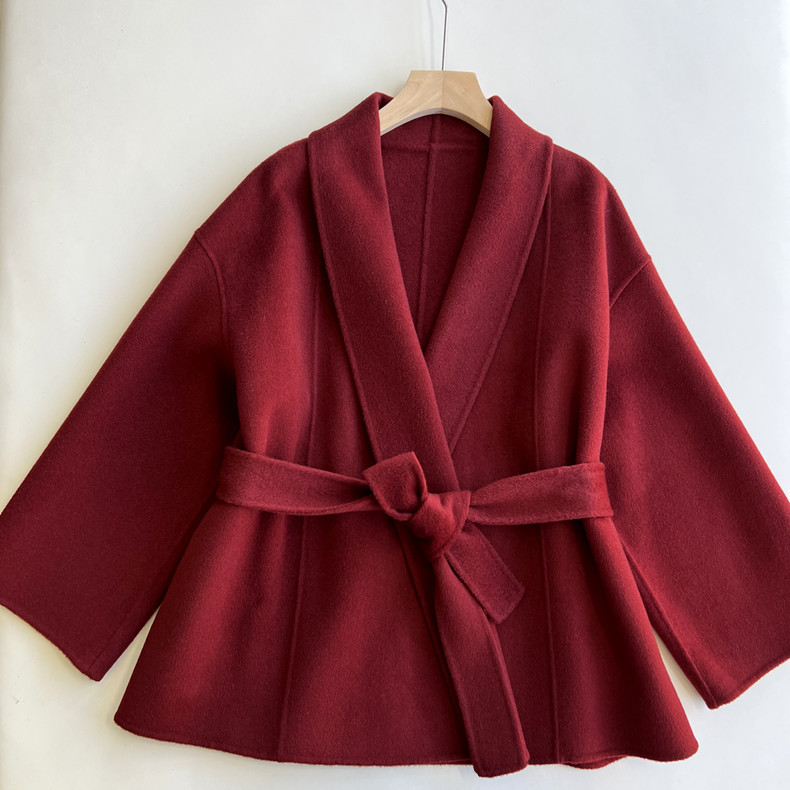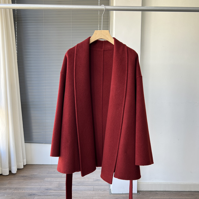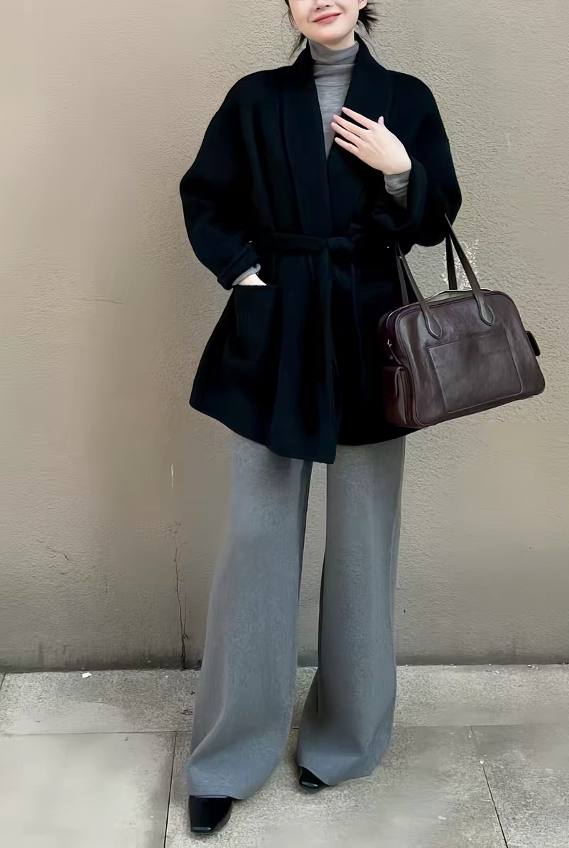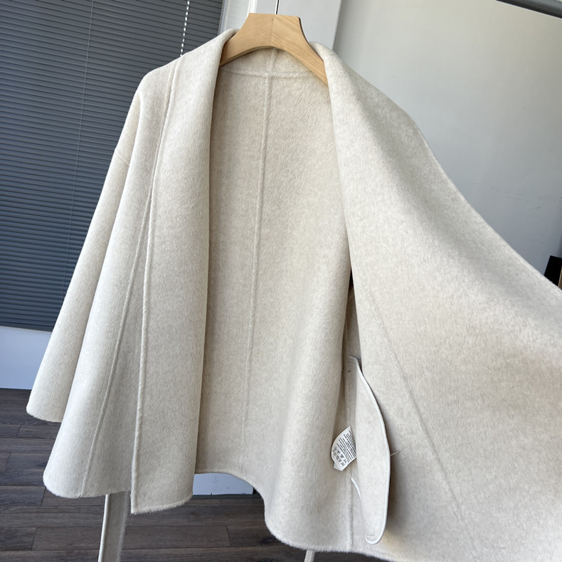 每道工序繁复严谨,耗时耗力,使面料达到稳定的状态成衣质地紧密,拥有平滑悬垂性和回弹力。整体丰盈柔糯而不失柔韧骨感宽松的斗篷大廓形,遮肉显瘦显背薄