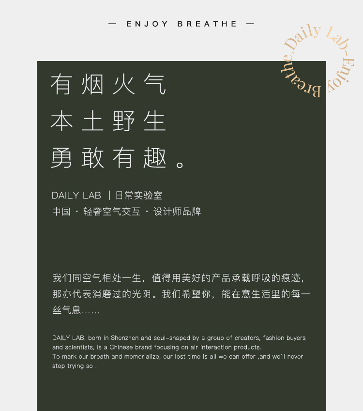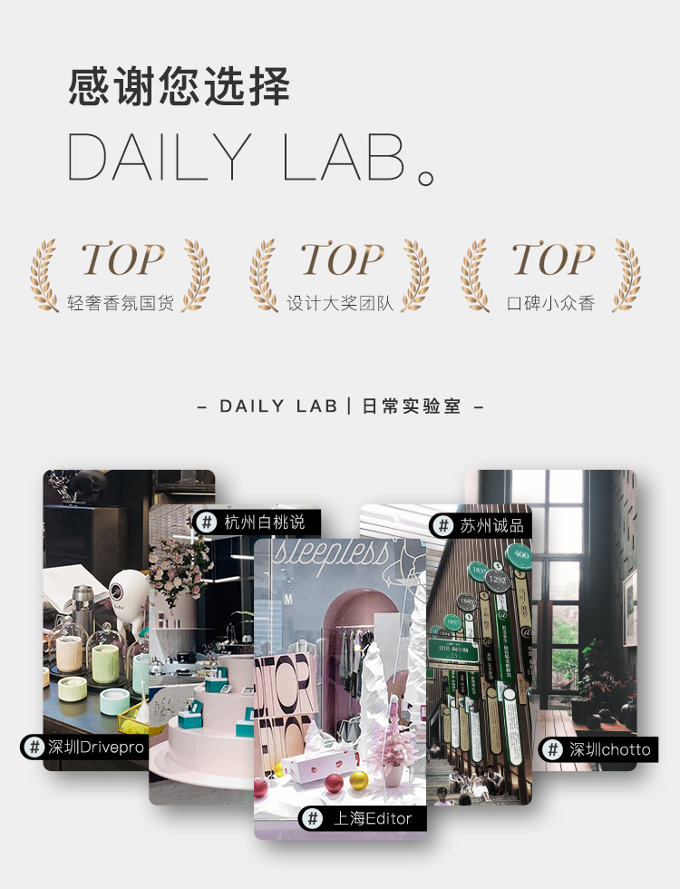 - DAILY LAB|日常实验室,立足东方美学,是专注于「香气可视化」的轻奢空气交互品牌。