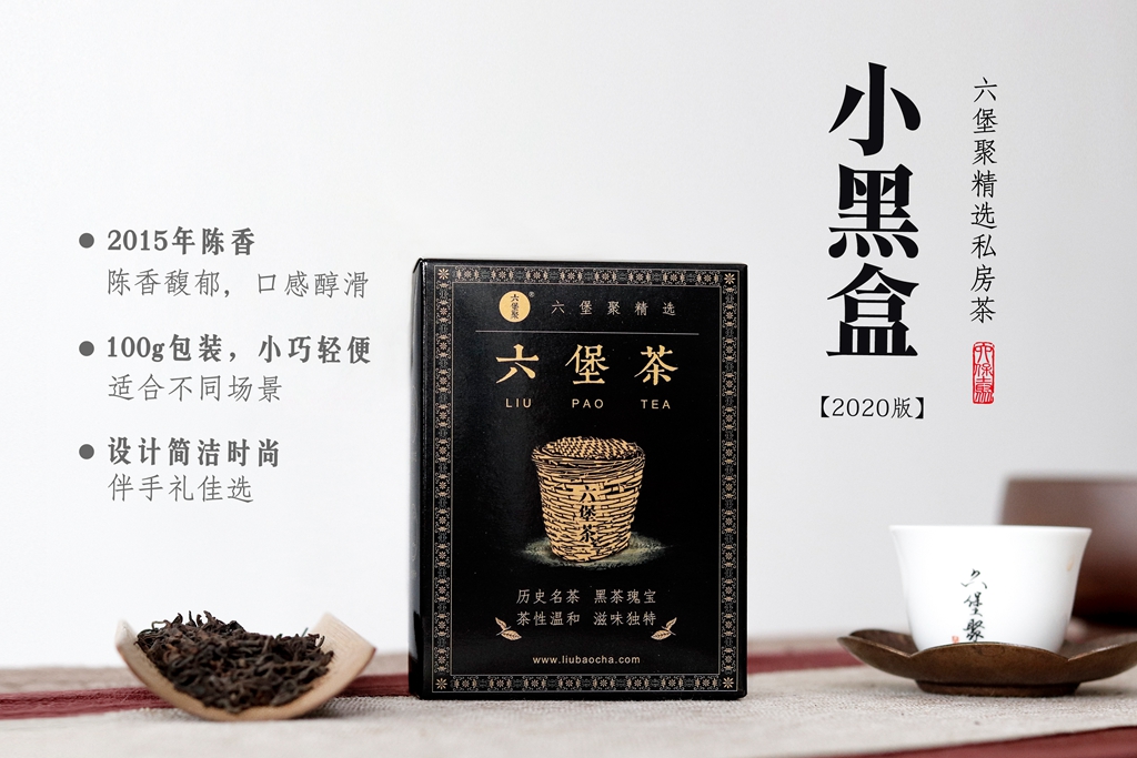 六堡聚小黑盒2020,采用小包装设计,每盒装100克茶叶。包装以黑色为主,所以简称“小黑盒”。