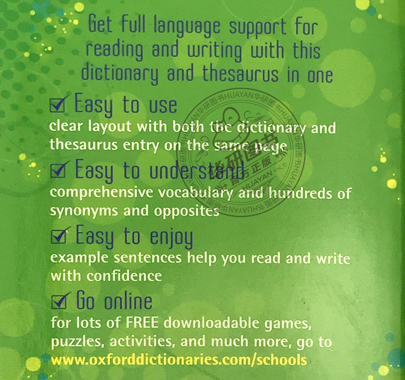 Oxford Mini School Dictionary and Thesaurus是牛津大学出版社以牛津儿童语料库为基准,专为即将升初中的英国小学生设计的两用词典。词典每一页的上半部分为英语字典,包含简洁明了的释义、例句、单词拼写、语法以及标点;下半部分为同义词词典,列出了上半部分词汇相对应的同义词、替代词、易错词和被过度使用的词语。一目了然的排版设计,用彩色标明的词语,让这本轻巧便携的迷你词典更加易于理解。