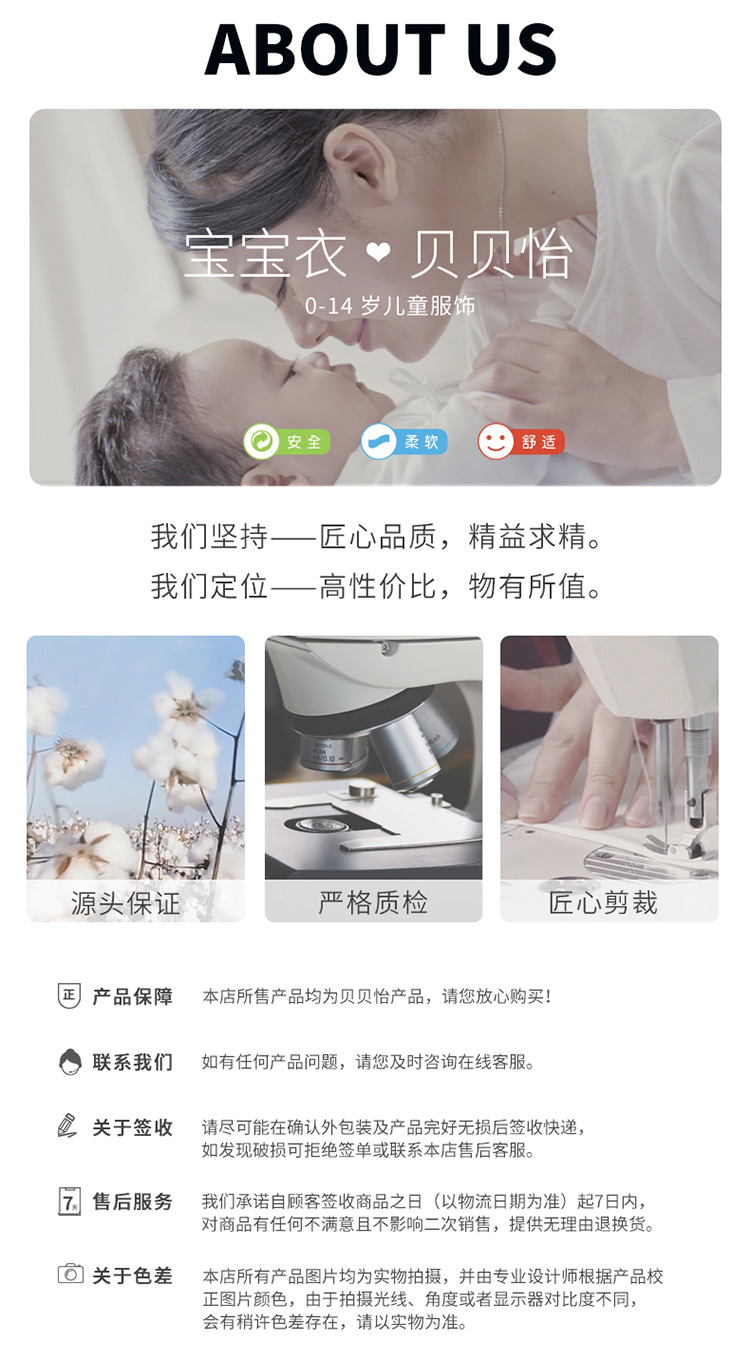 - 贝贝怡专注0-6岁婴幼儿服饰,坚持安全、柔软、舒适的产品理念,为千万中国家庭提供超高品质、安全可靠的婴幼儿服饰产品,妈妈放心,宝宝开心!