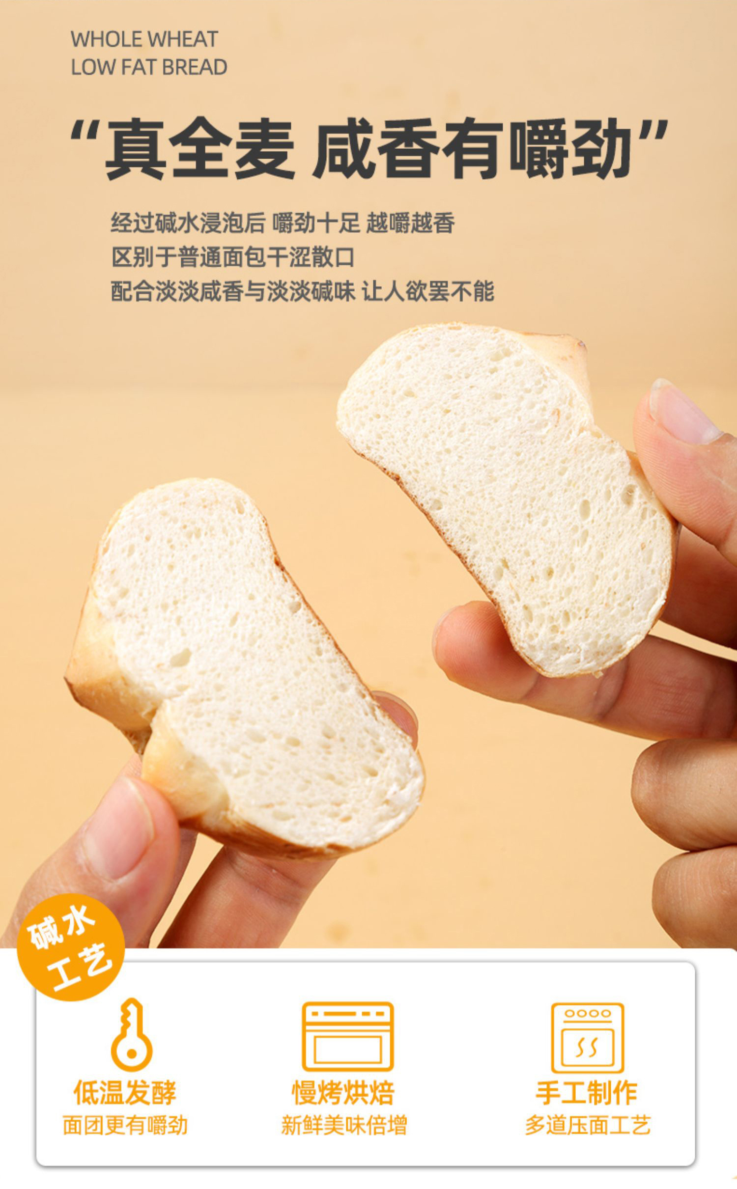 作为简装的平价小面包,包装确实非常潦草,但碱水包倒是每一颗都油光发亮,长得不错!而且原料也只有简单的水、面粉、盐等,可以说是很朴实健康了,饱腹感也相当强,一个就顶饱。全麦的添加含量大于50%,无油低脂,不加蔗糖,热量也不高,佛系减脂也可以大胆吃吃!
