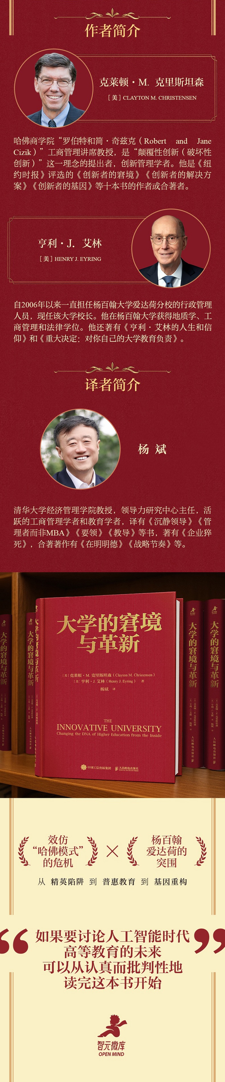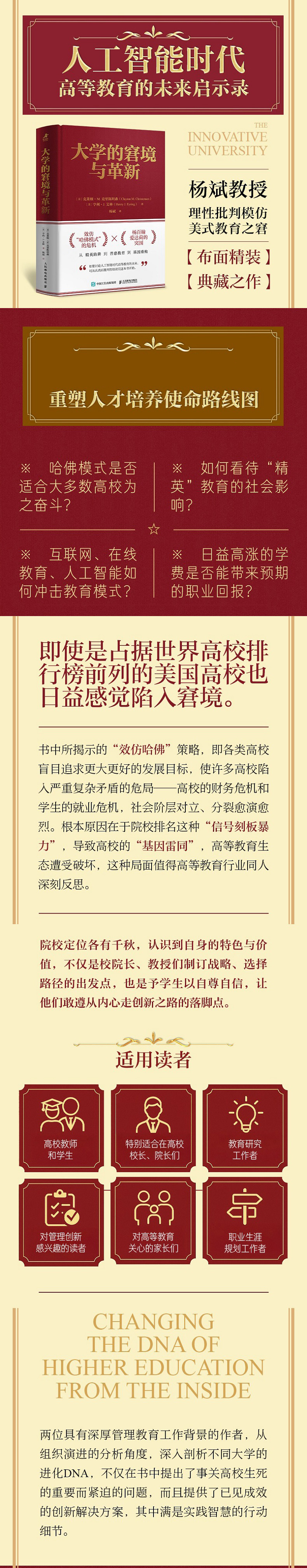 本书以哈佛大学近四百年的基因演化为主轴,可以看到现代大学的创新演化过程,再加上杨百翰大学爱达荷分校这些年依靠在线教育,实现快速突围的方法,向我们揭示“创造新知、传承薪火和明德*民”是大学的关键作用。新技术或将有助于大幅降低教育成本、彻底改变教育方式,从而使教育行业发生天翻地覆的变化。那些能够适应新的竞争环境的大学、能够利用历史优势的大学、能够拥抱新技术并*越对哈佛模式效仿的大学,将拥有光明的未来。通过两所学校不同的创新DNA对比,从战略创新和组织变革角度,对理解当下大学的困境和探寻AI时代教育的未来出路非常有启发。