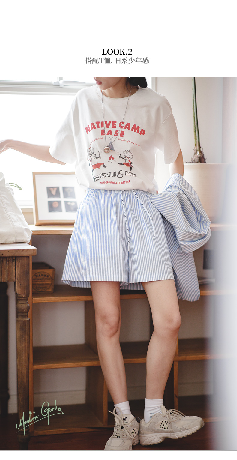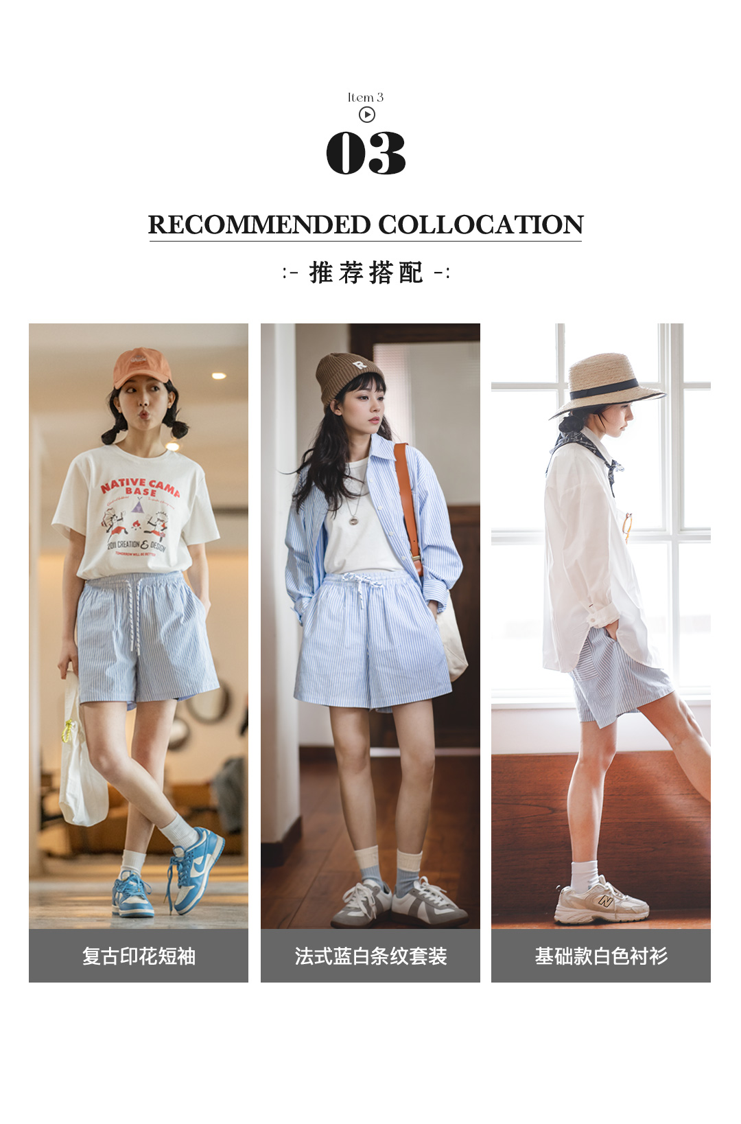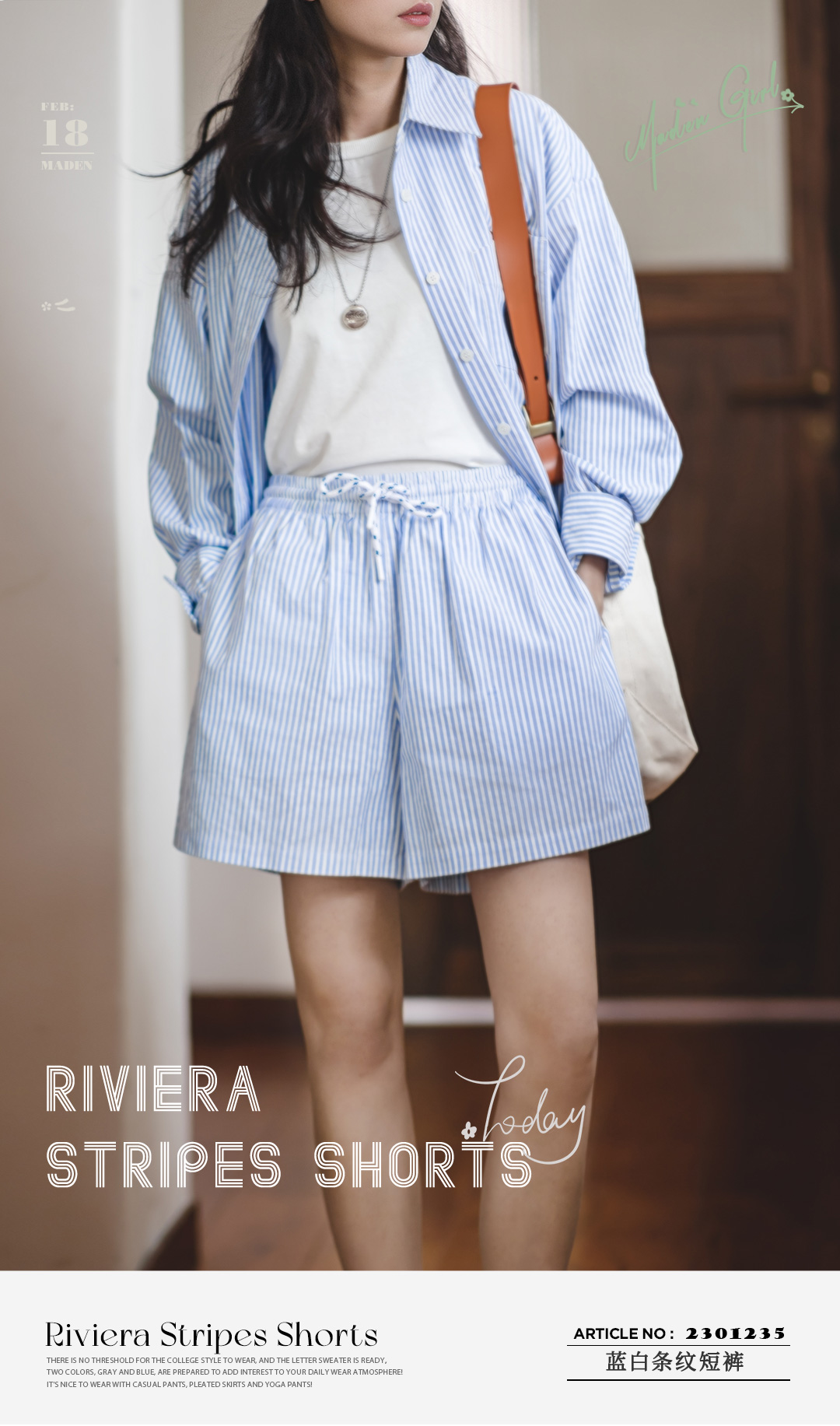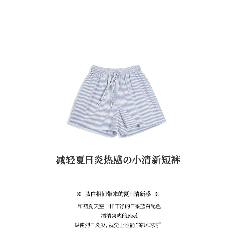 马登日系蓝色条纹休闲短裤防晒条纹套装女纯棉高腰运动阔腿裤女