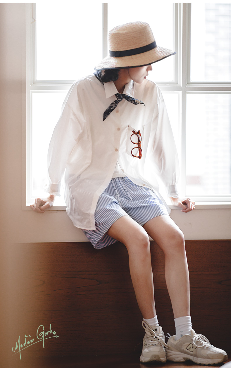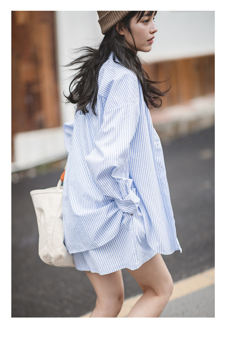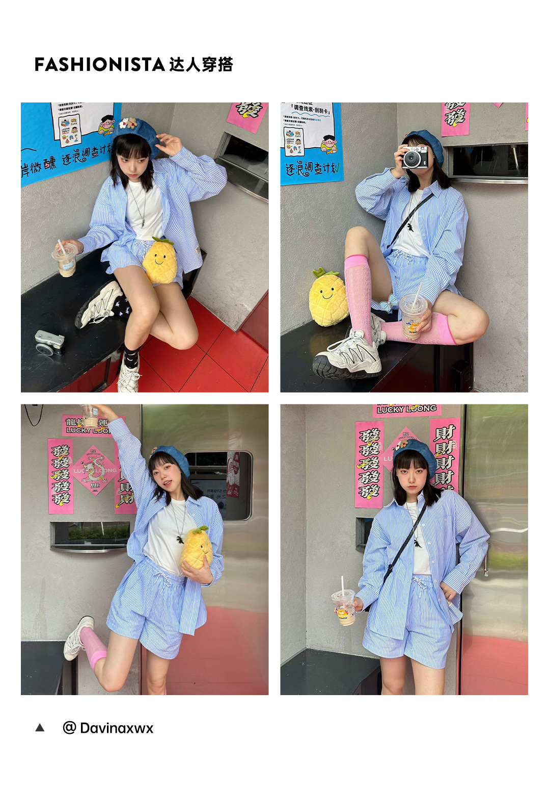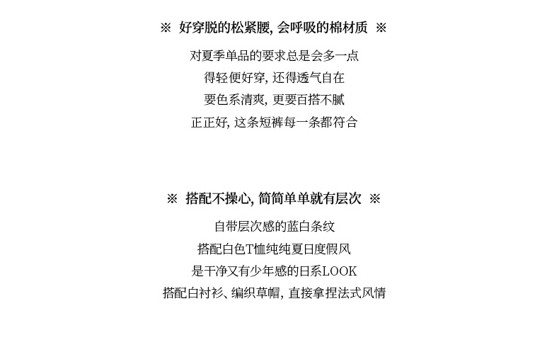 马登日系蓝色条纹休闲短裤防晒条纹套装女纯棉高腰运动阔腿裤女