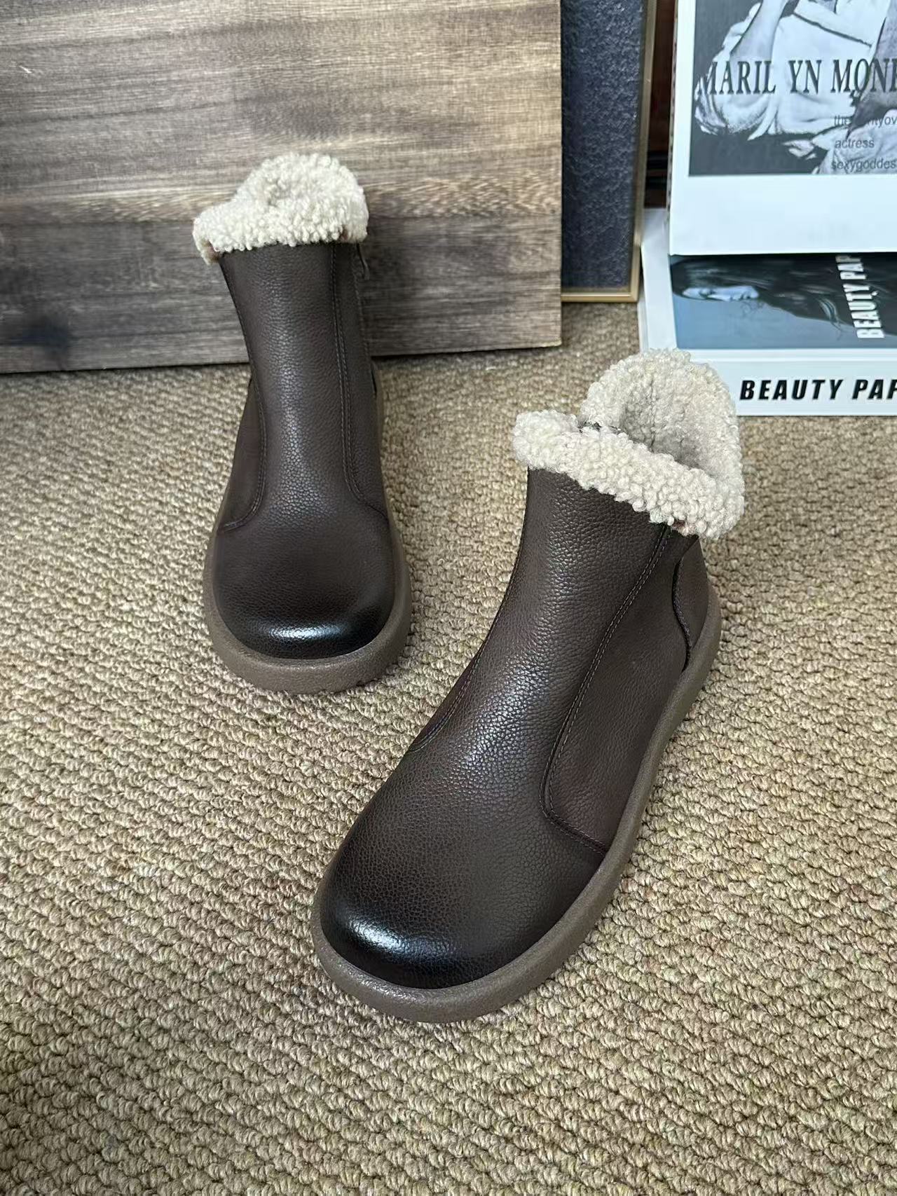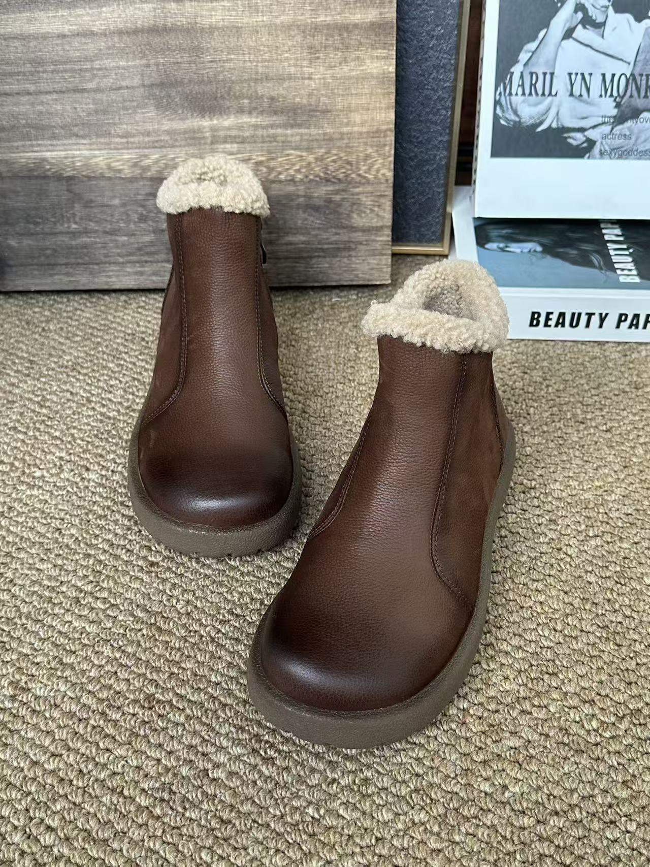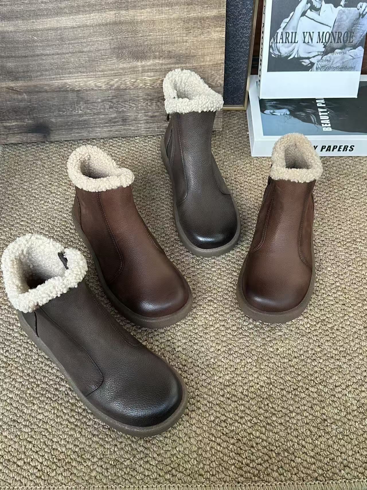 手工复古做旧雪地靴!2025小众设计加绒保暖棉靴女磨砂牛皮侧拉链棉鞋!