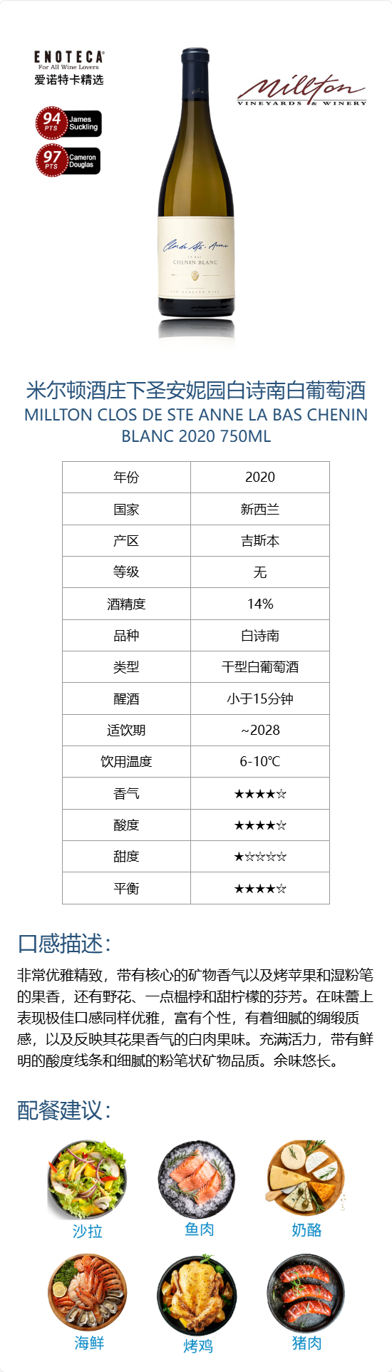 【生物动力法!95 分白诗南!】Millton Clos De Ste Anne La Bas Chenin Blanc 2020 750Ml 米尔顿酒庄下圣安妮园白诗南白葡萄酒