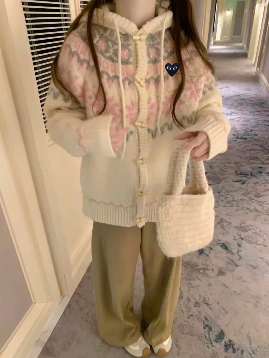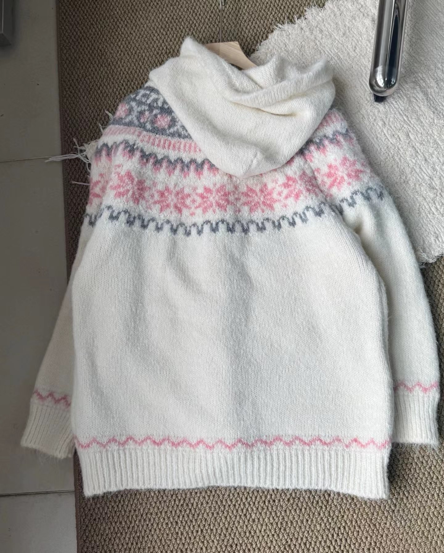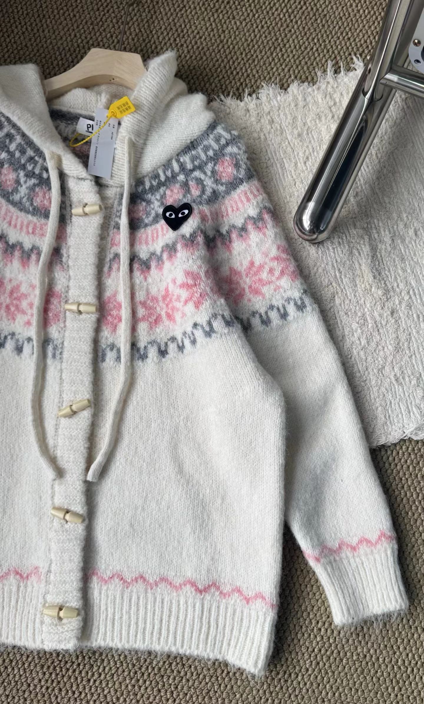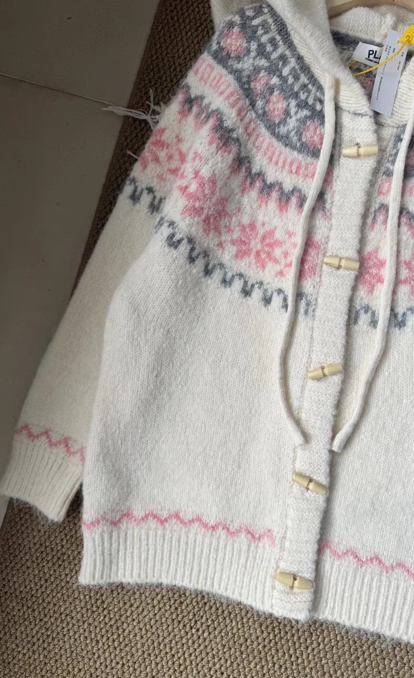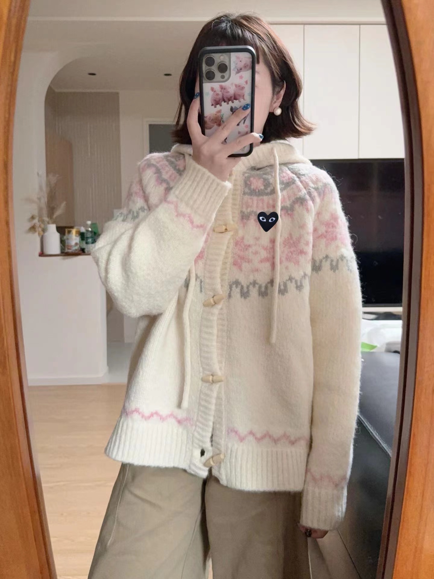 连帽针织开衫,整体风格甜美清新,兼具休闲与温柔感宽松的落肩版型,采用软糯的针织面料,触感蓬松,穿着舒适且有慵懒感。主体为米白色,衣身拼接粉灰相间的费尔岛花纹,下摆和袖口有粉色波浪纹点缀,色彩柔和且富有层次感。带抽绳的连帽设计,门襟处用木质牛角扣装饰,左胸口有黑色爱心小刺绣,增添了俏皮感;开衫的款式穿脱方便,实用性强。