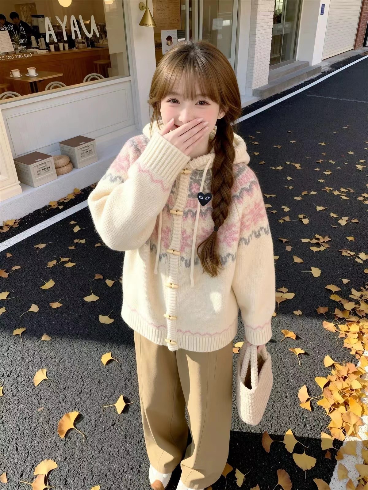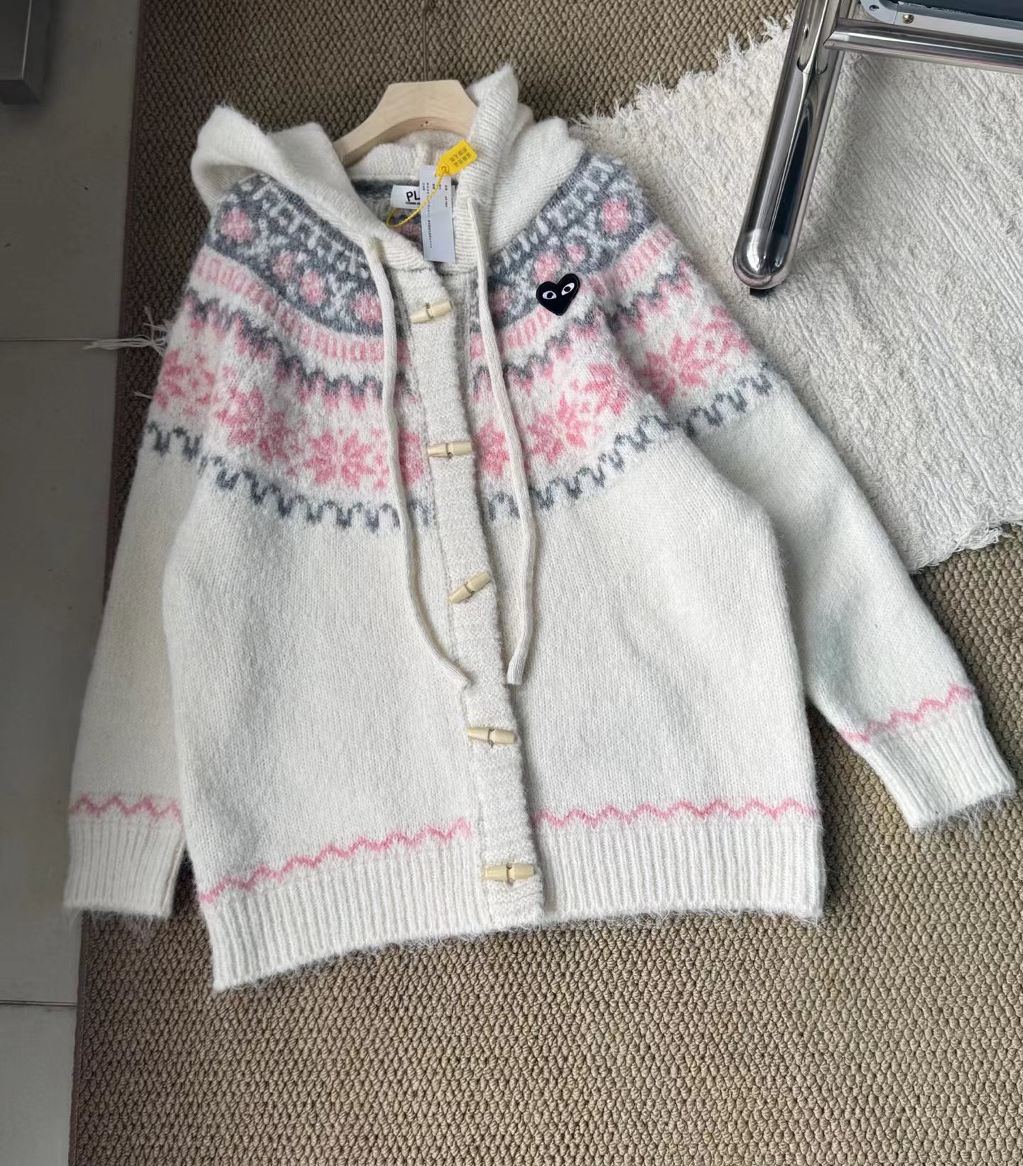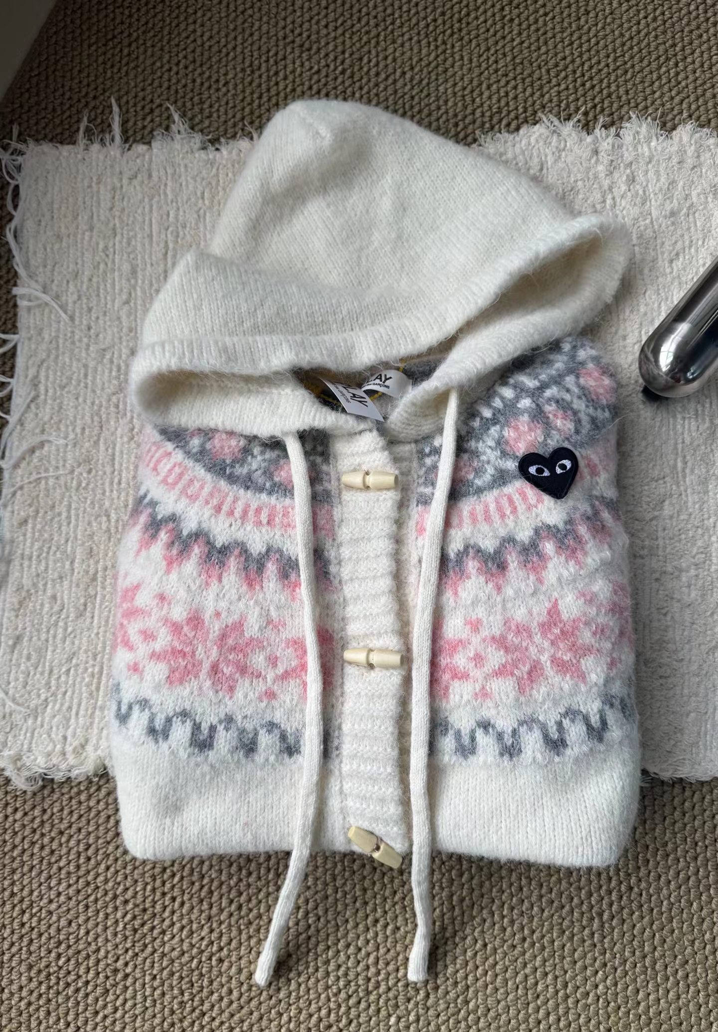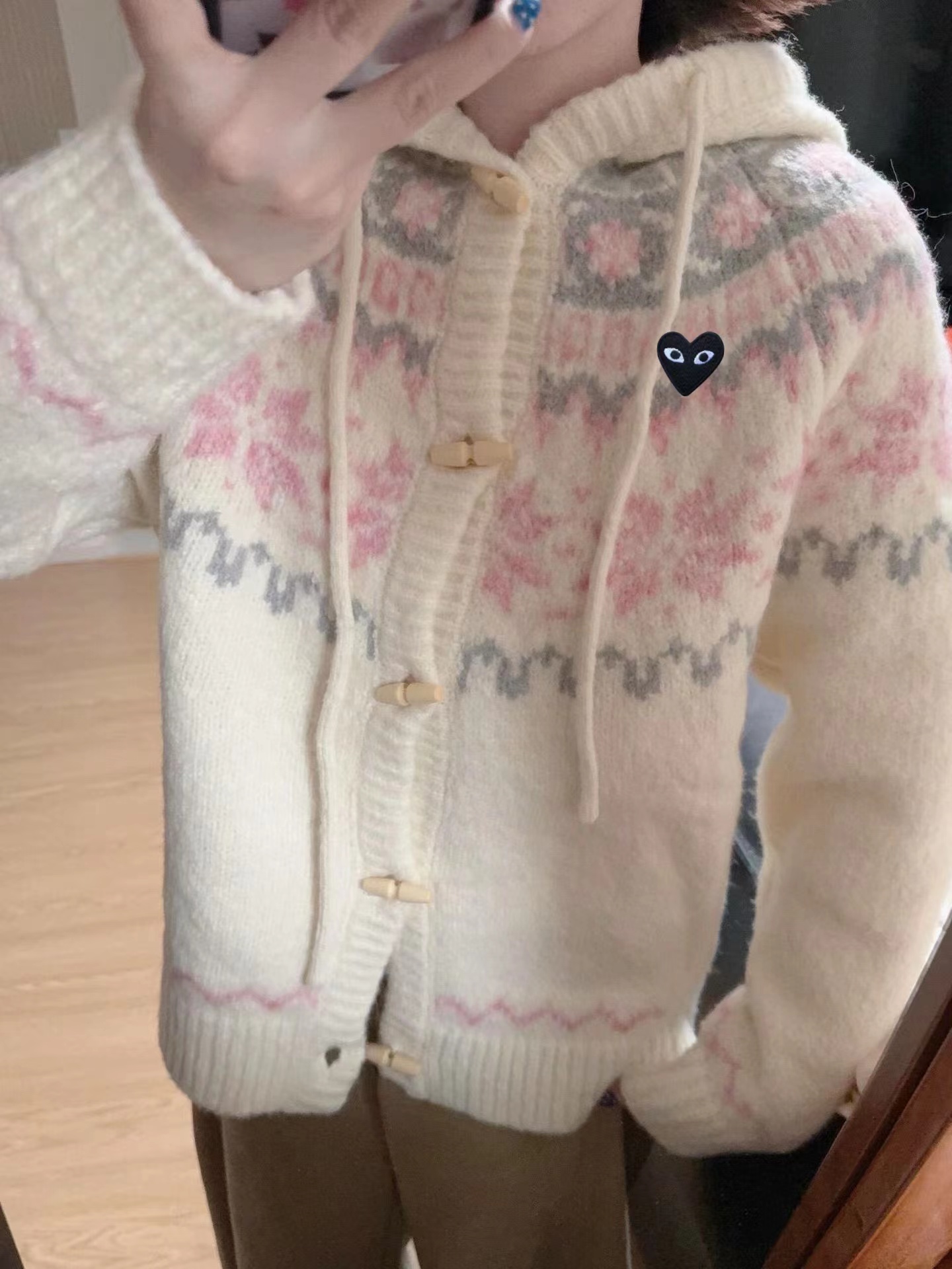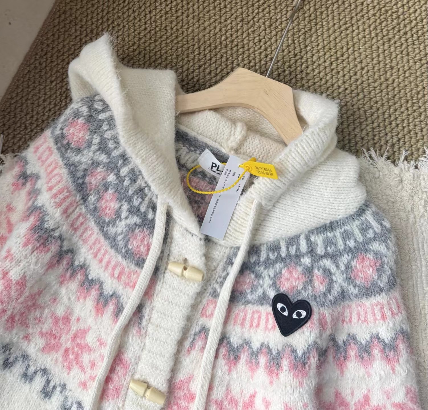 连帽针织开衫,整体风格甜美清新,兼具休闲与温柔感宽松的落肩版型,采用软糯的针织面料,触感蓬松,穿着舒适且有慵懒感。主体为米白色,衣身拼接粉灰相间的费尔岛花纹,下摆和袖口有粉色波浪纹点缀,色彩柔和且富有层次感。带抽绳的连帽设计,门襟处用木质牛角扣装饰,左胸口有黑色爱心小刺绣,增添了俏皮感;开衫的款式穿脱方便,实用性强。
