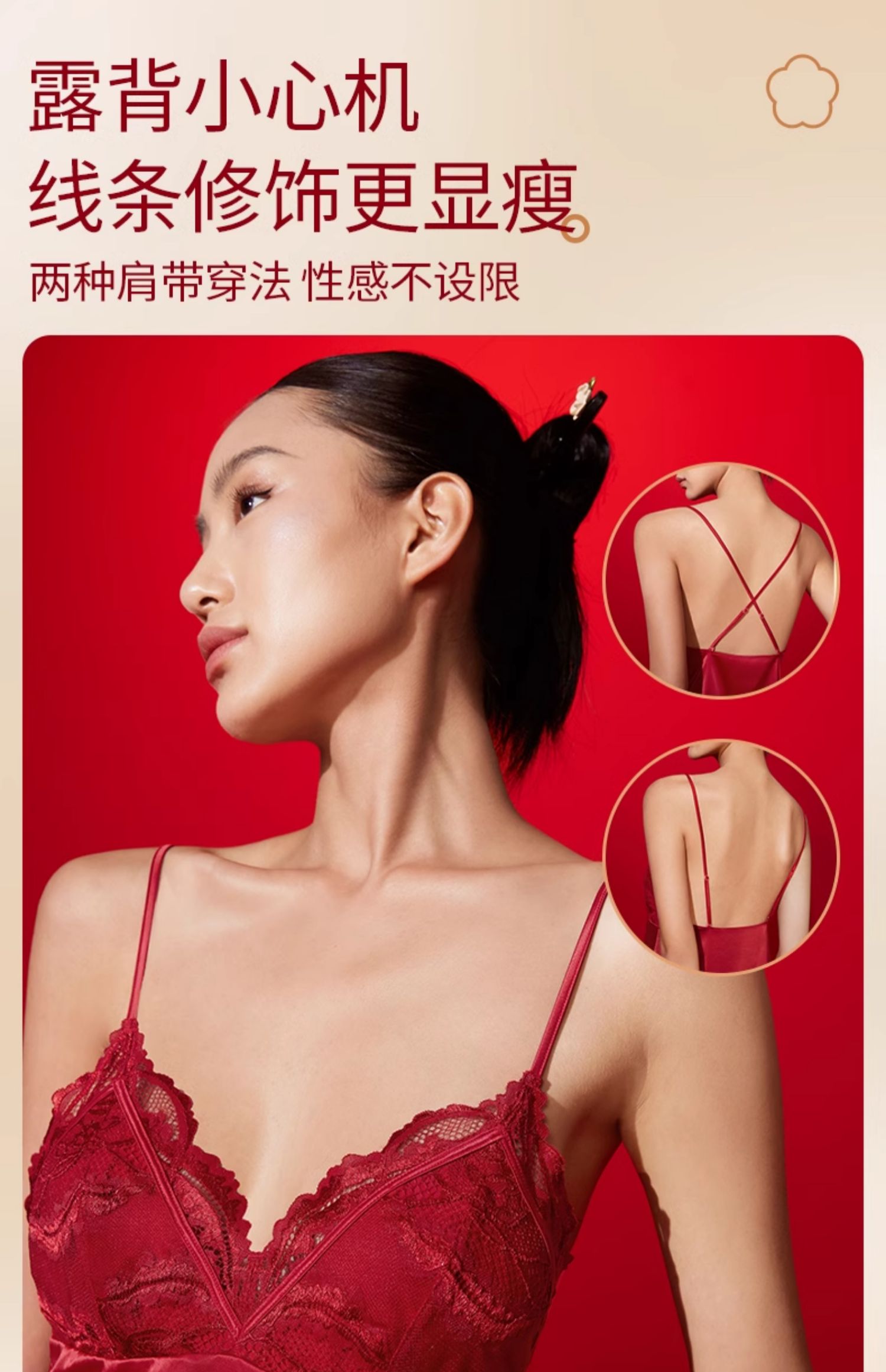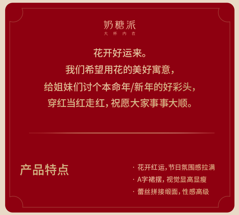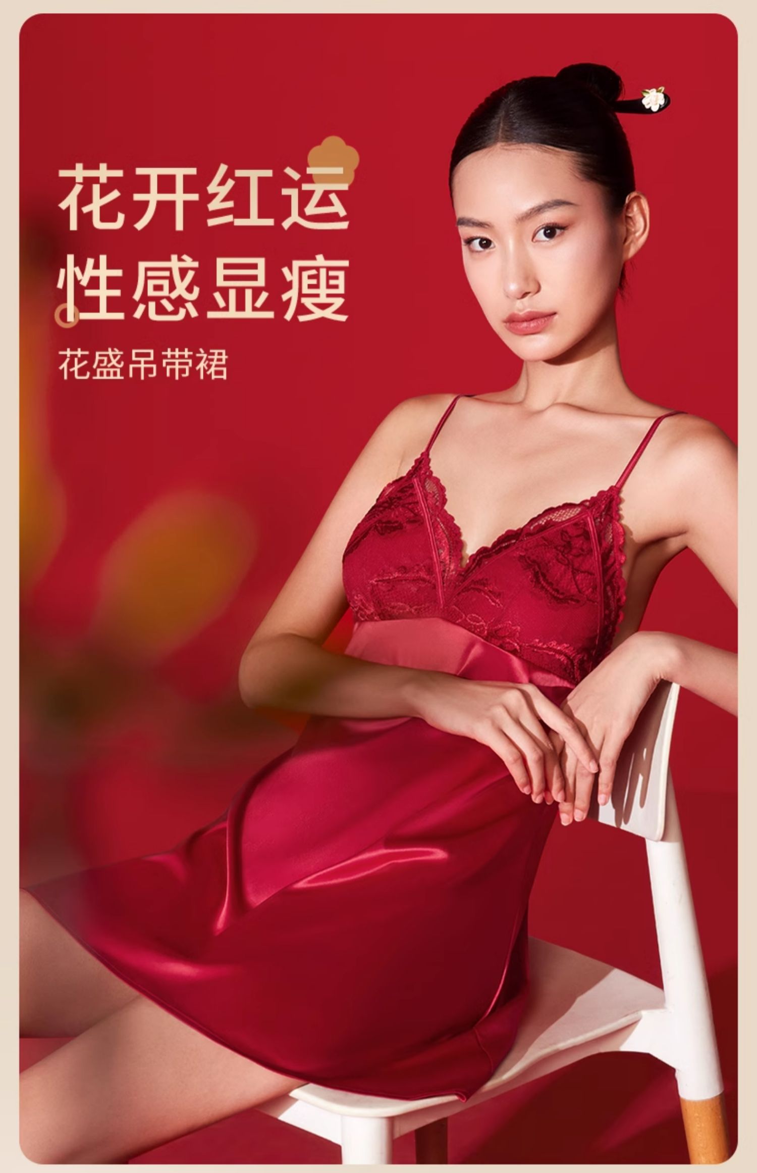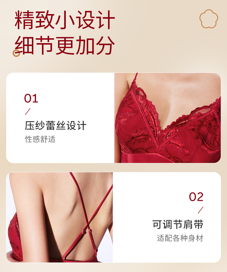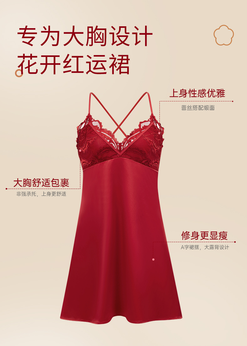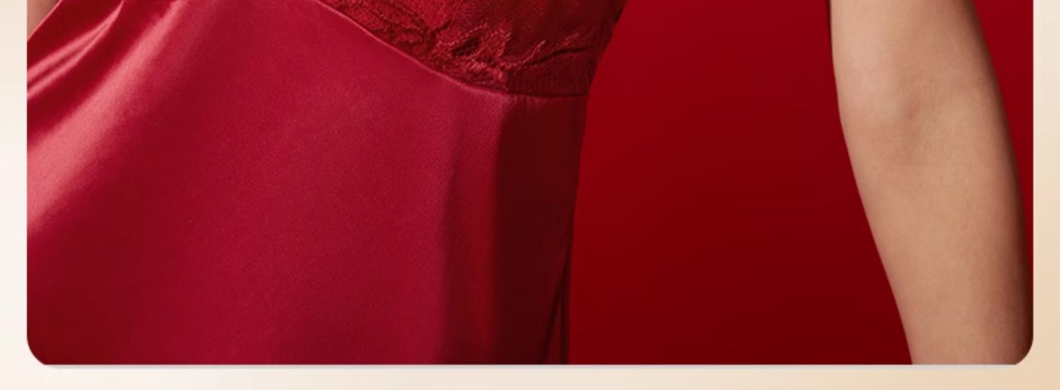 奶糖派花盛系列性感露背缎面深V蕾丝睡裙本命年红色吊裙