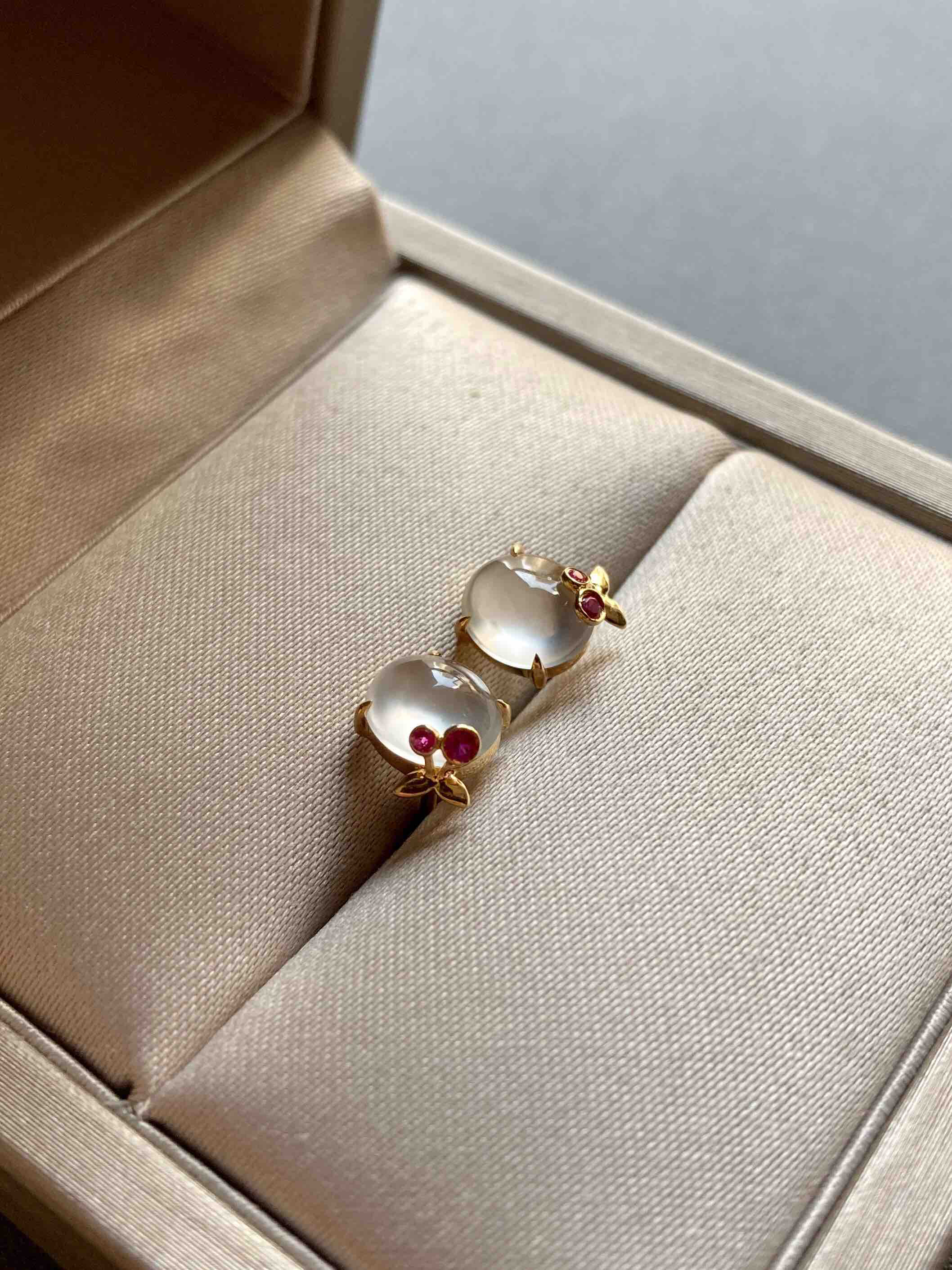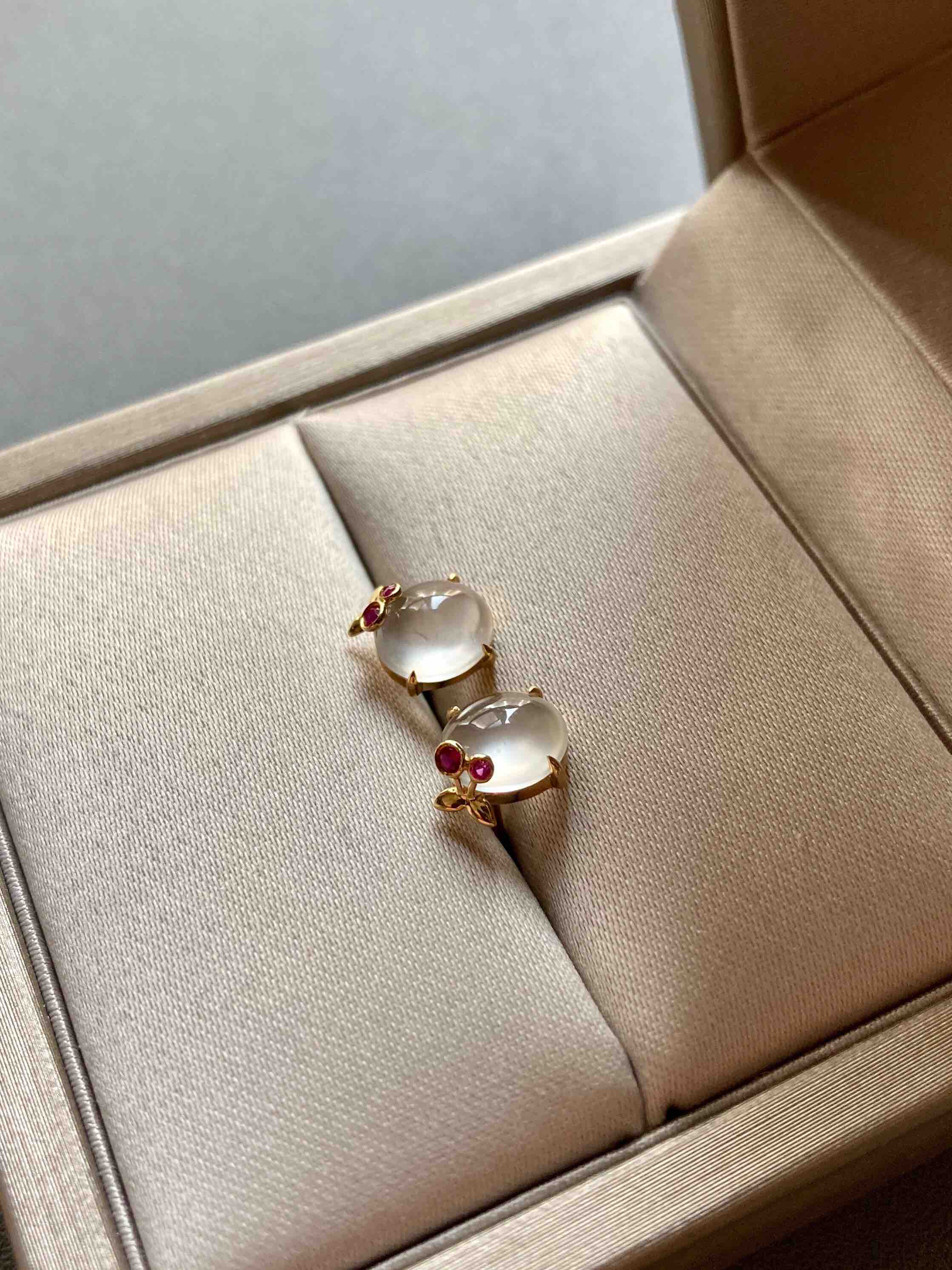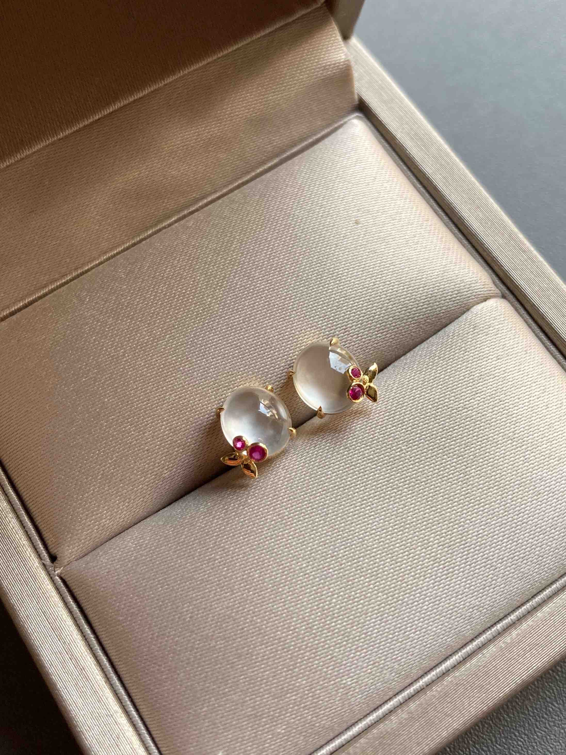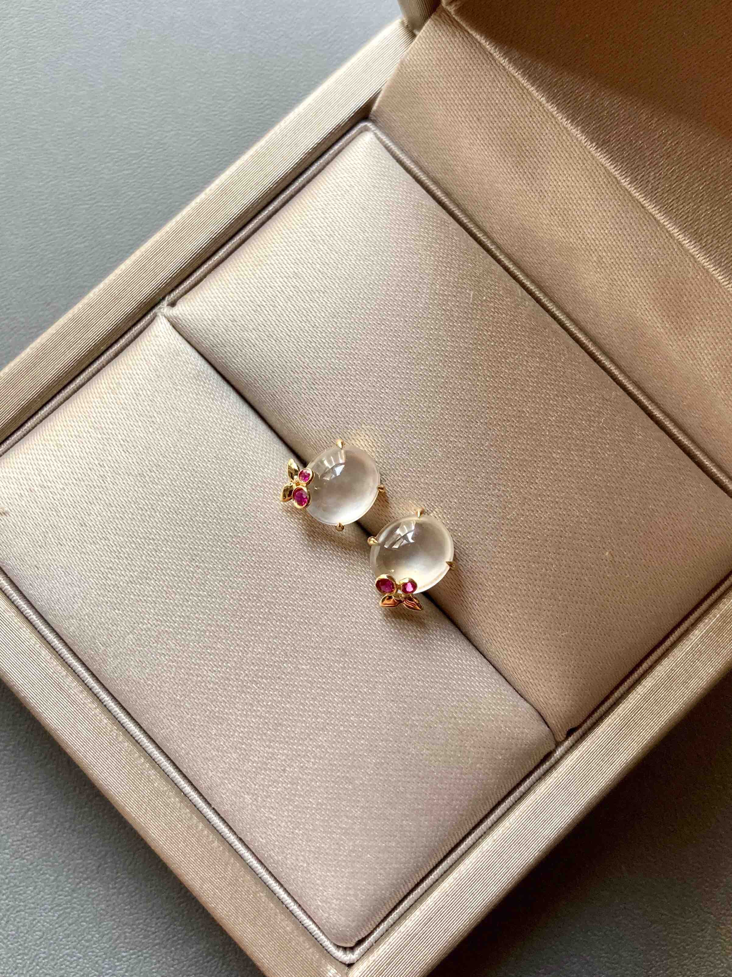玻璃种翡翠蛋面红樱桃耳钉18k黄金红碧玺镶嵌,细节决定成败,就是那么与众不同,玻璃种翡翠耳钉也能被我们玩出花样,那么好的种水,蛋面7×6×3.5mm,荧光四射,当然要配禄来家的原创设计,18k黄金红碧玺镶嵌,小小红樱桃做点缀,上身超好看