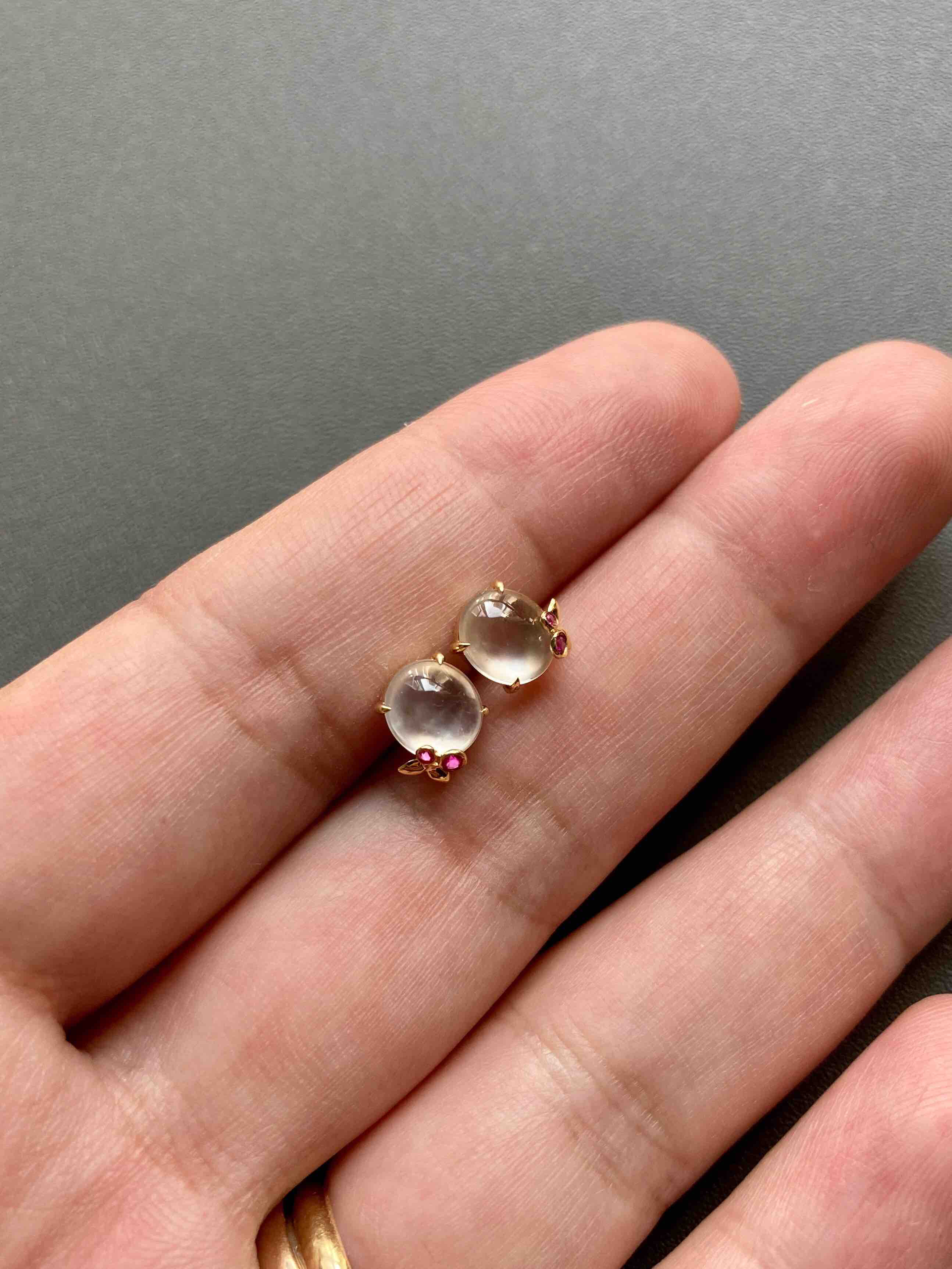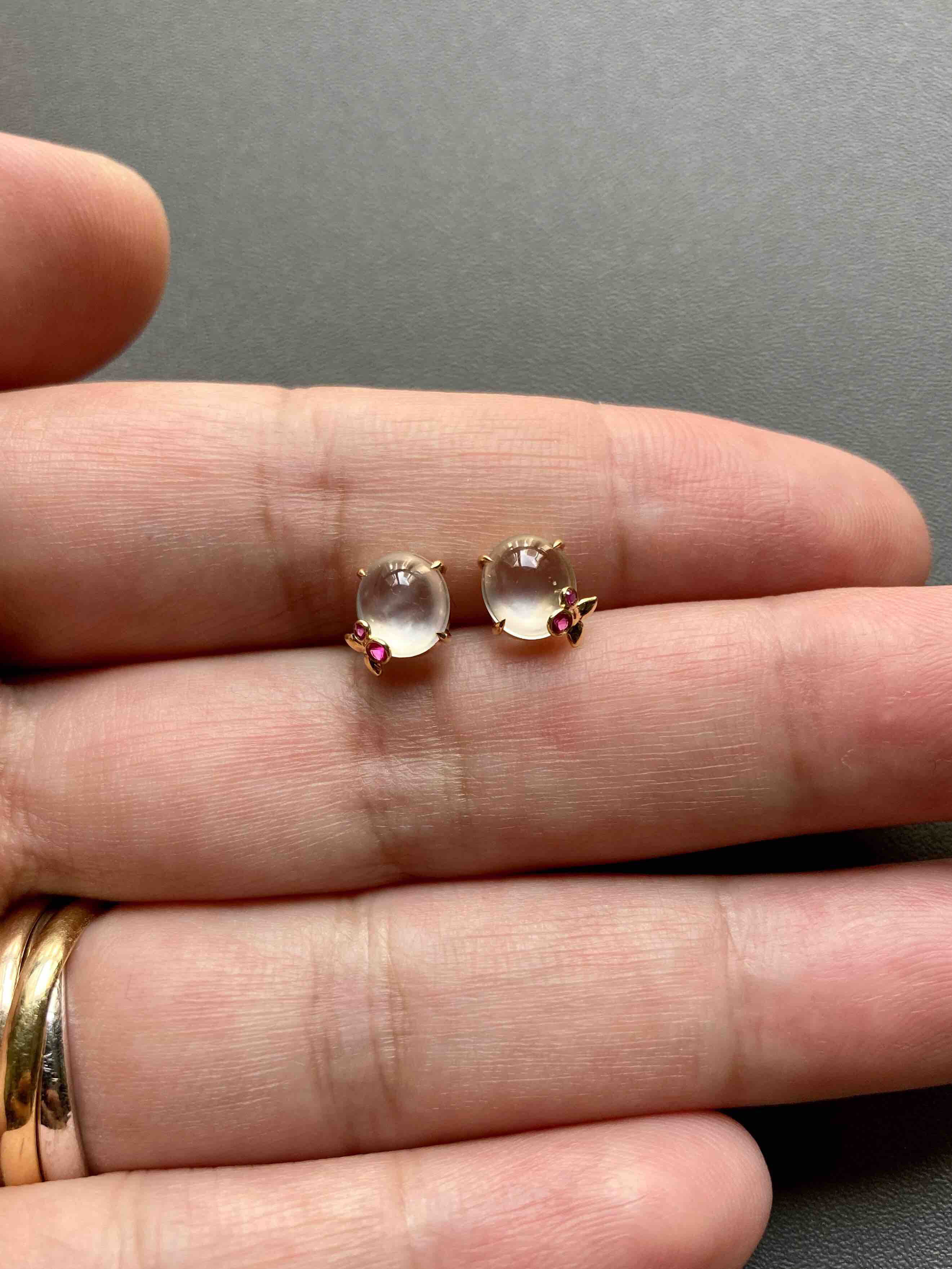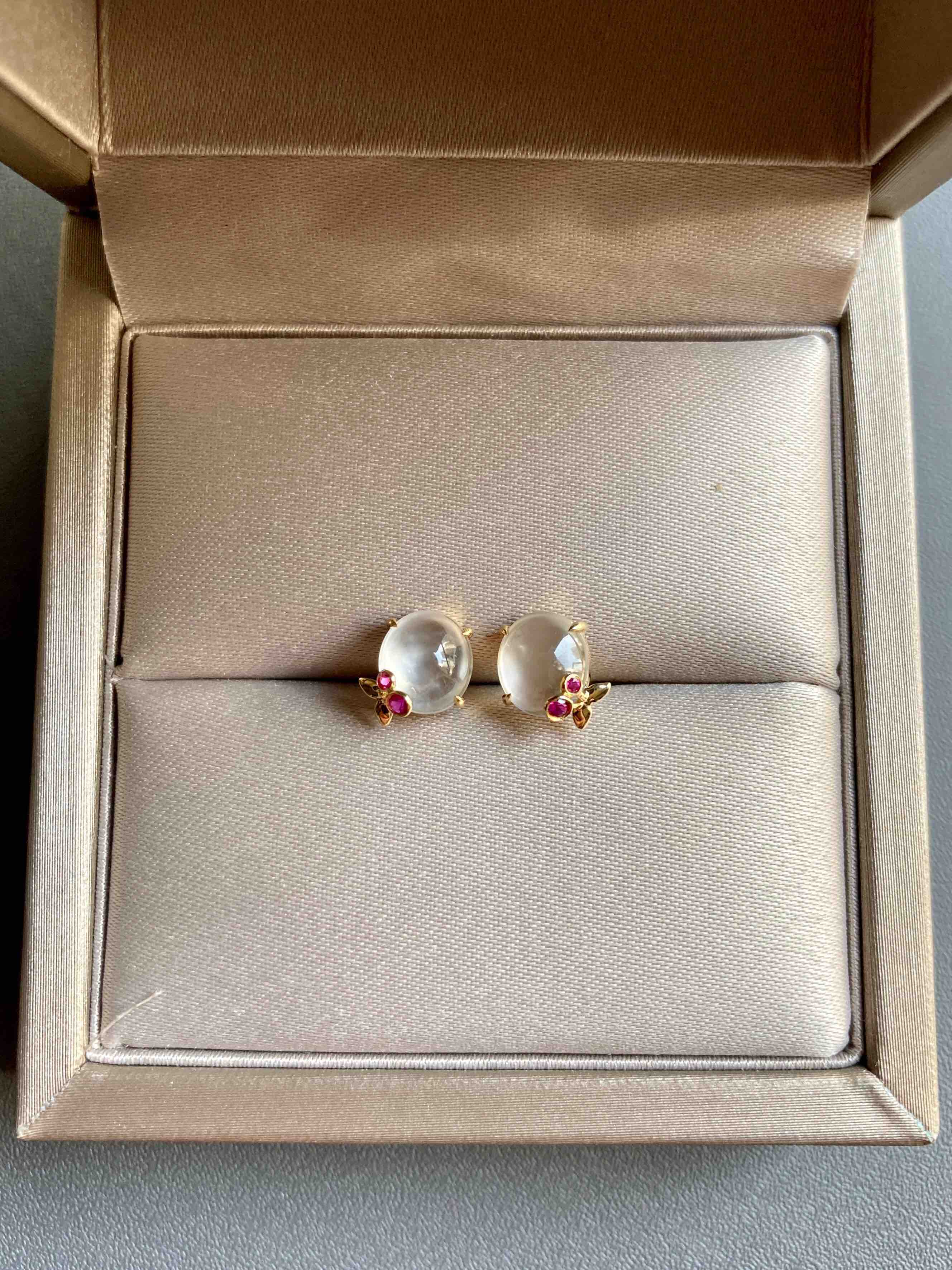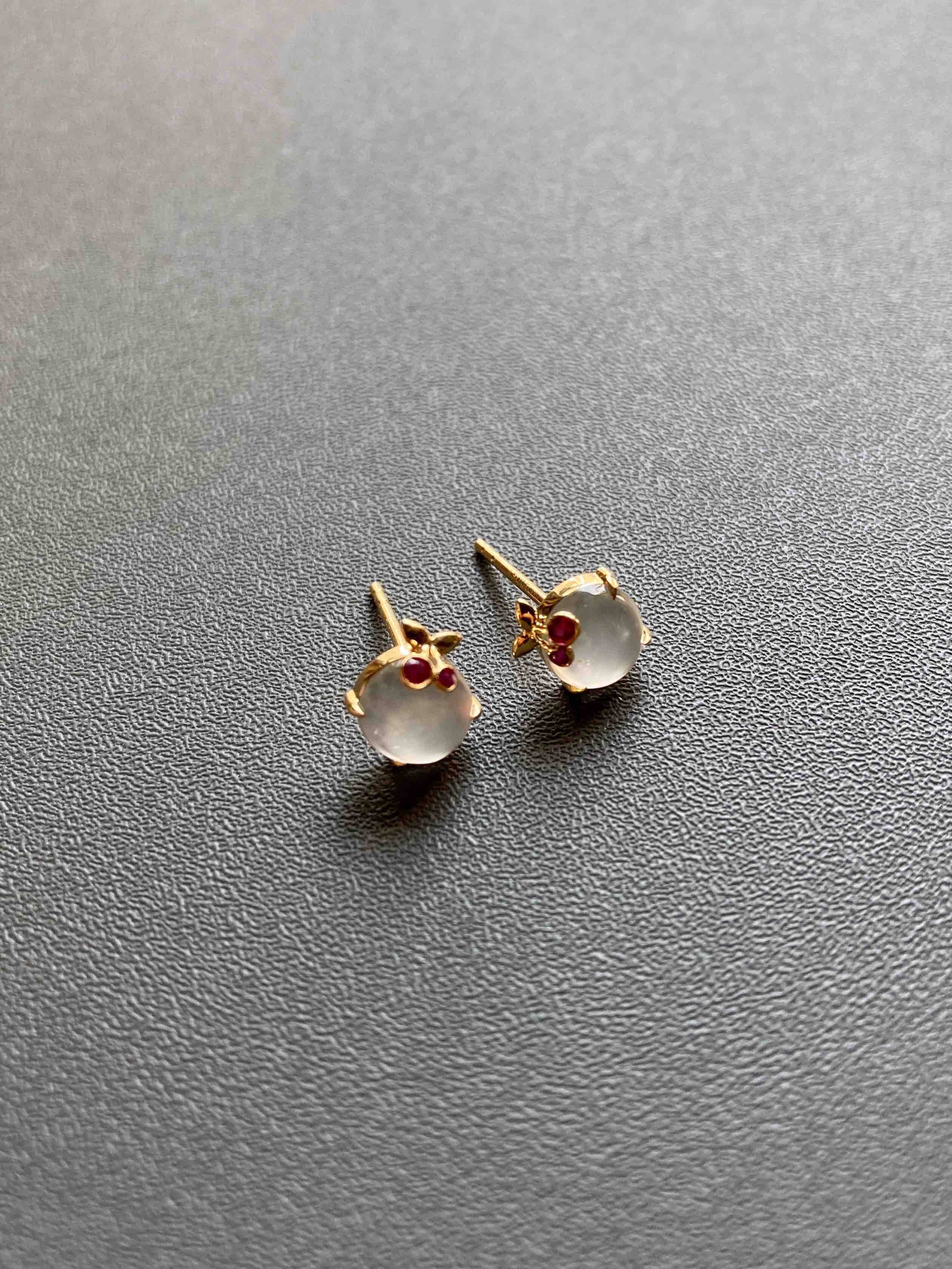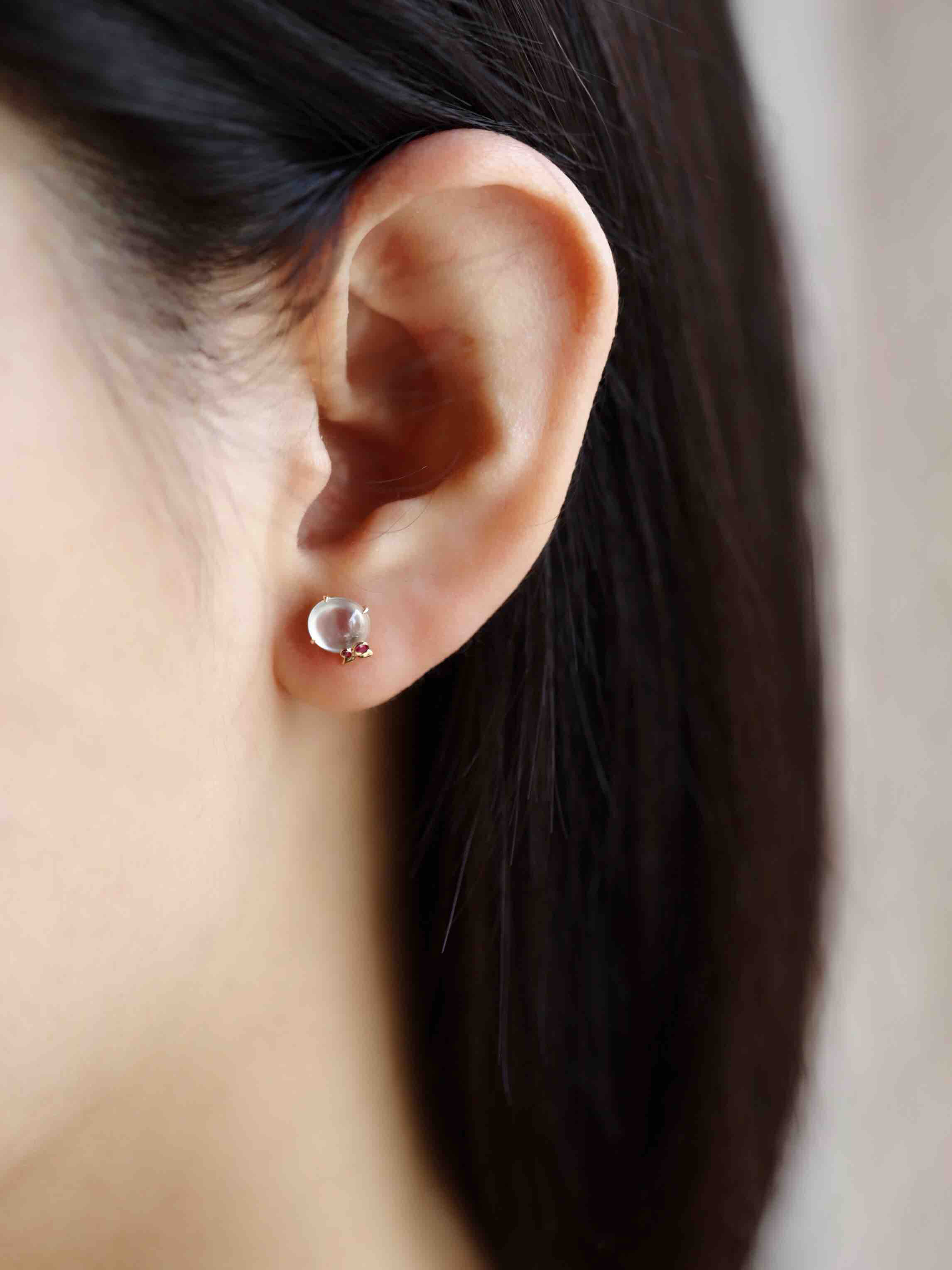 玻璃种翡翠蛋面红樱桃耳钉18k黄金红碧玺镶嵌,细节决定成败,就是那么与众不同,玻璃种翡翠耳钉也能被我们玩出花样,那么好的种水,蛋面7×6×3.5mm,荧光四射,当然要配禄来家的原创设计,18k黄金红碧玺镶嵌,小小红樱桃做点缀,上身超好看