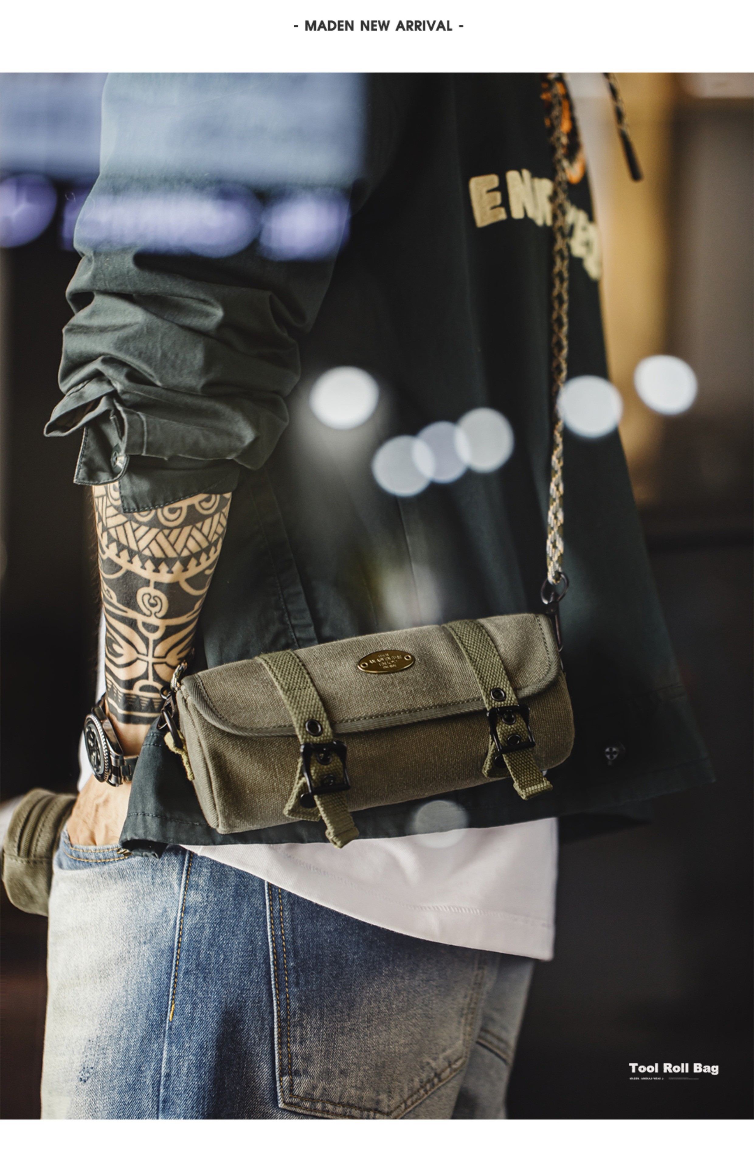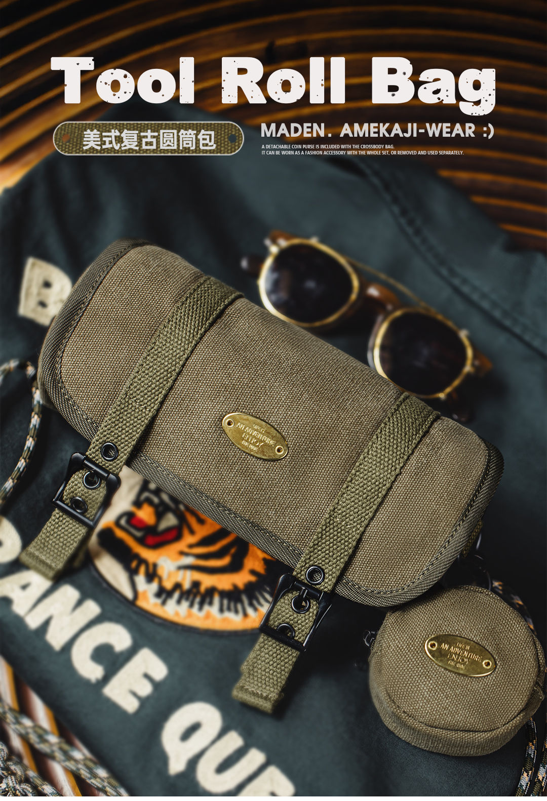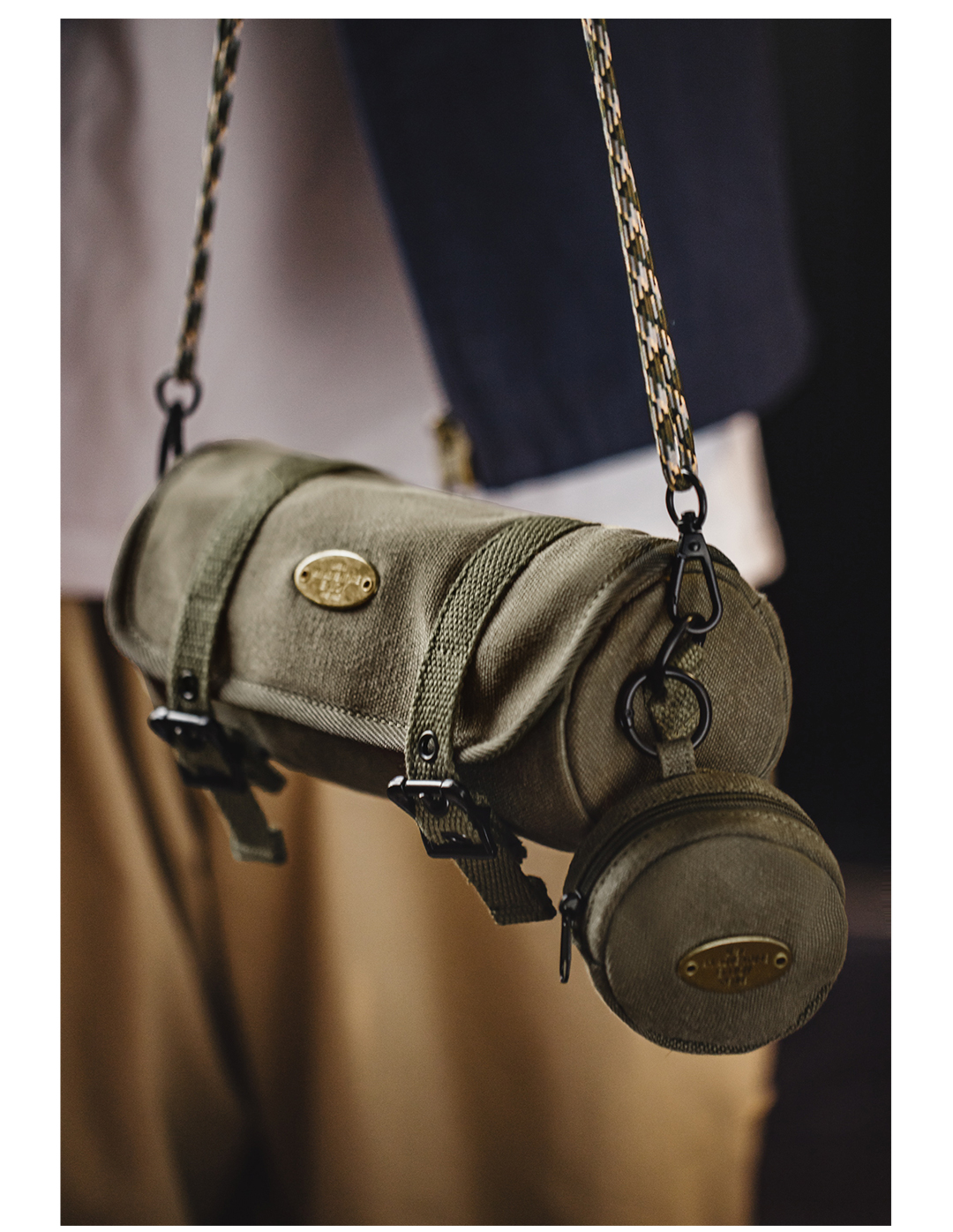 马登工装美式复古帆布圆筒包随身包通勤小包斜跨包包子母零钱包男