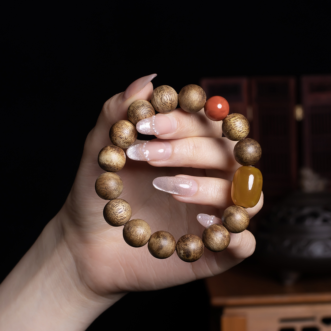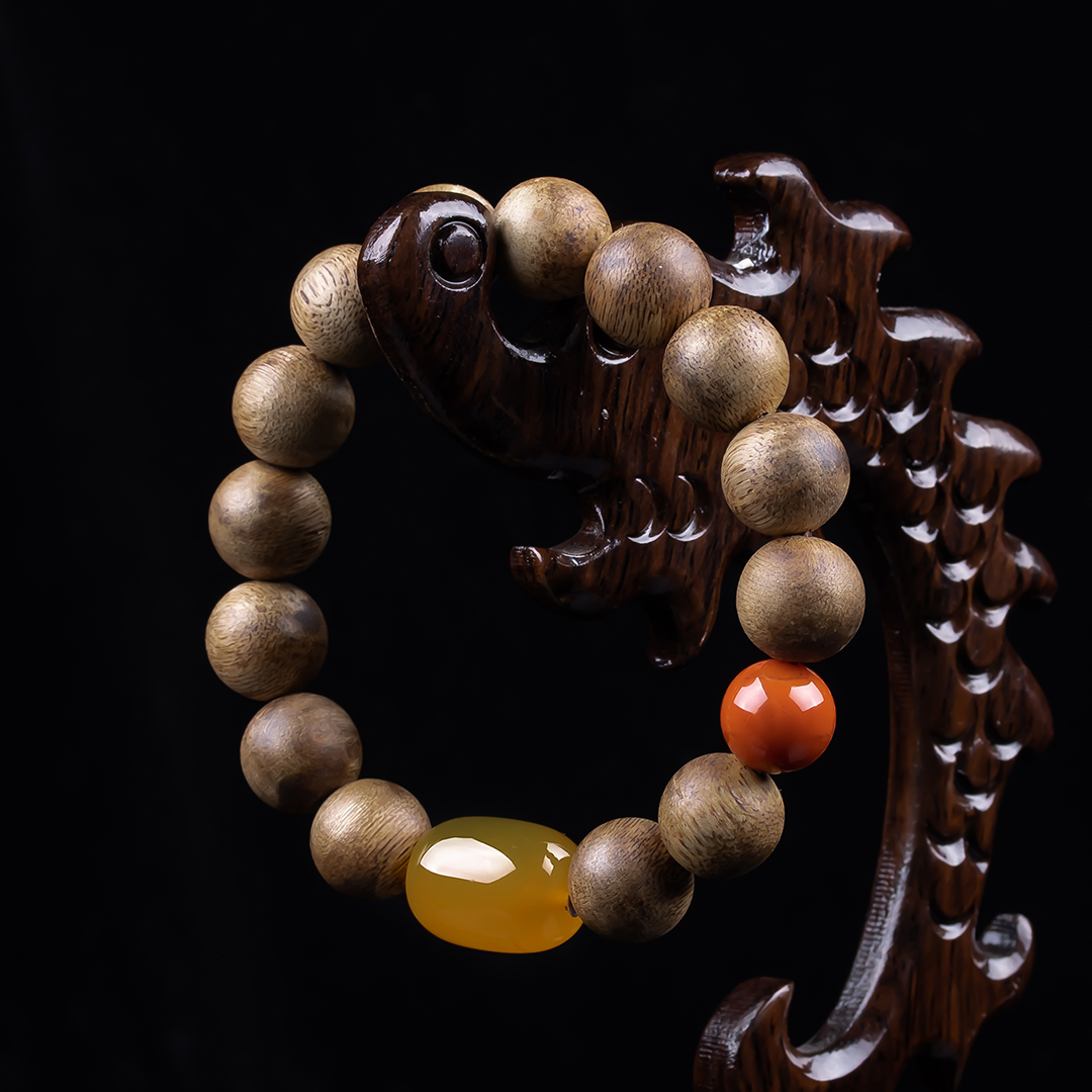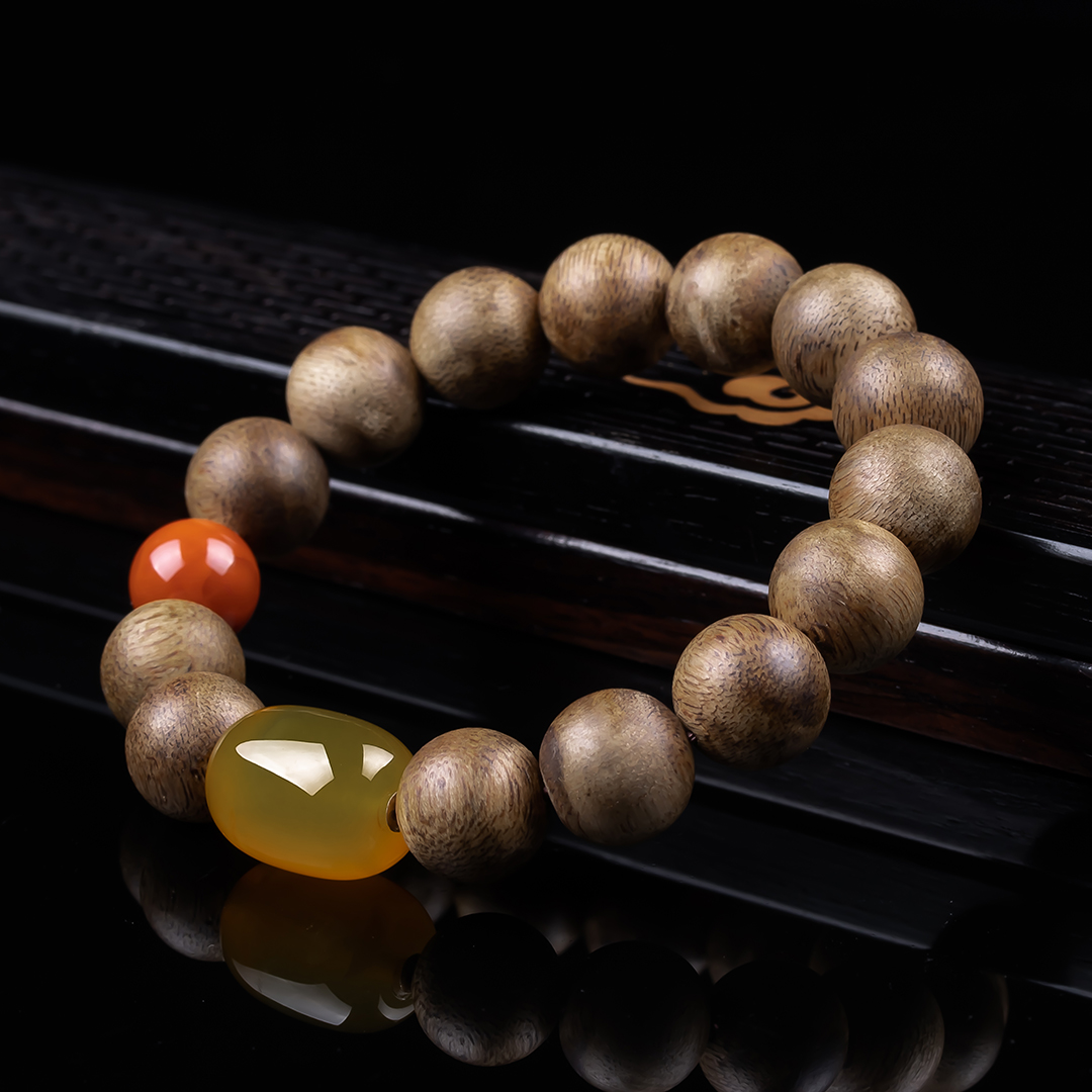 xy0347沉香+玛瑙南红国风diy手串,天然沉香12.4mm,原色原味,香味自然清甜,玛瑙18.8*13.4mm,一颗满色肉的南红,整体文玩风格,国风穿搭,温润大气。
