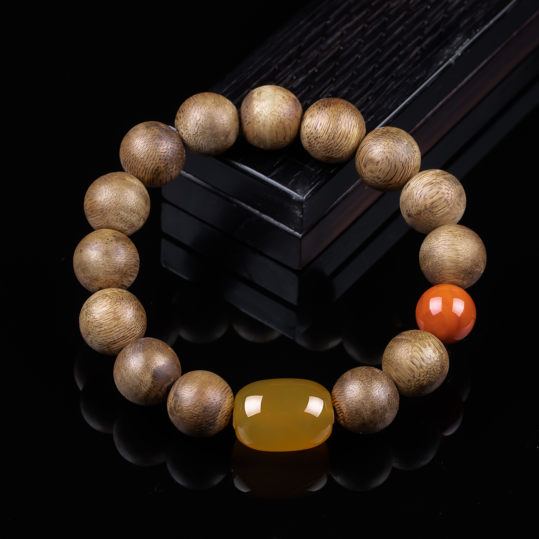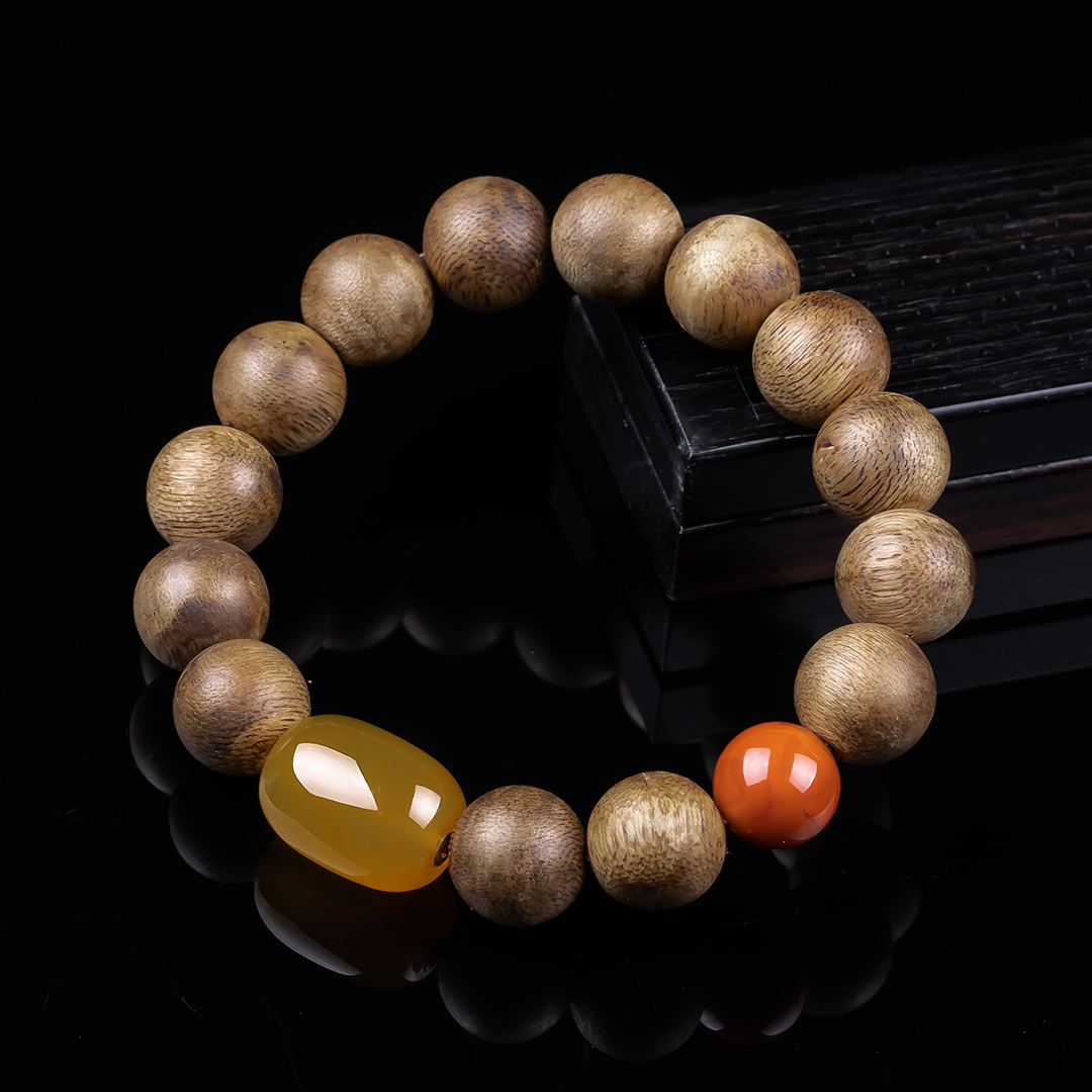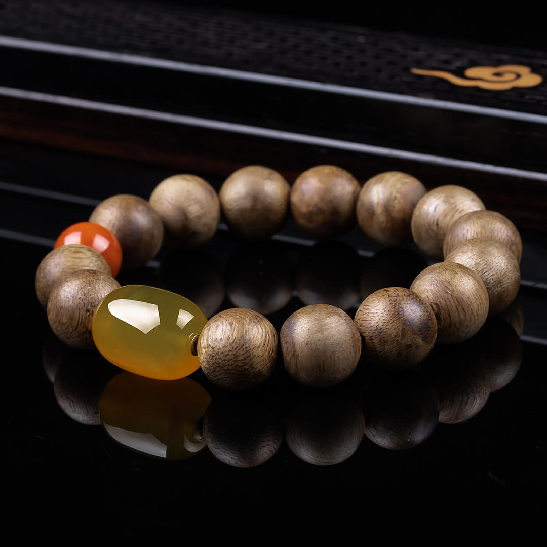 xy0347沉香+玛瑙南红国风diy手串,天然沉香12.4mm,原色原味,香味自然清甜,玛瑙18.8*13.4mm,一颗满色肉的南红,整体文玩风格,国风穿搭,温润大气。