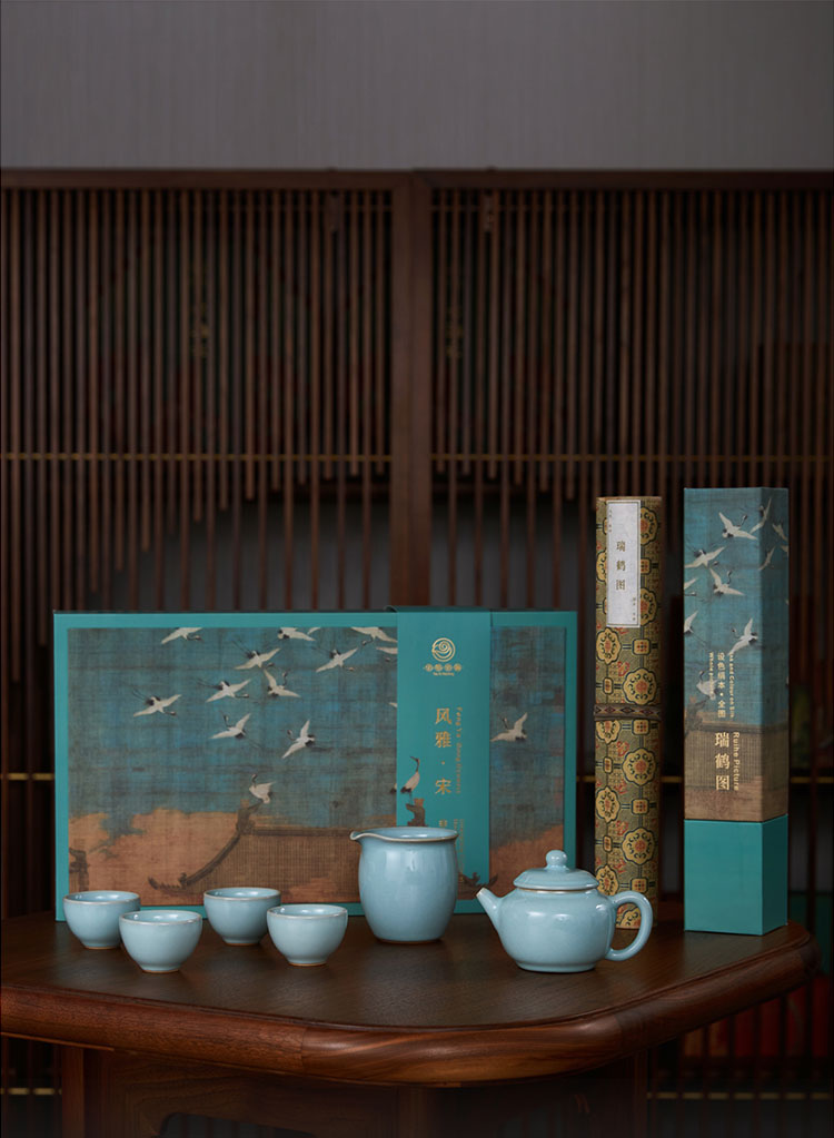 【风雅·宋】非遗汝窑套组1壶4杯1公道 博物馆馆藏级瑞鹤图卷轴