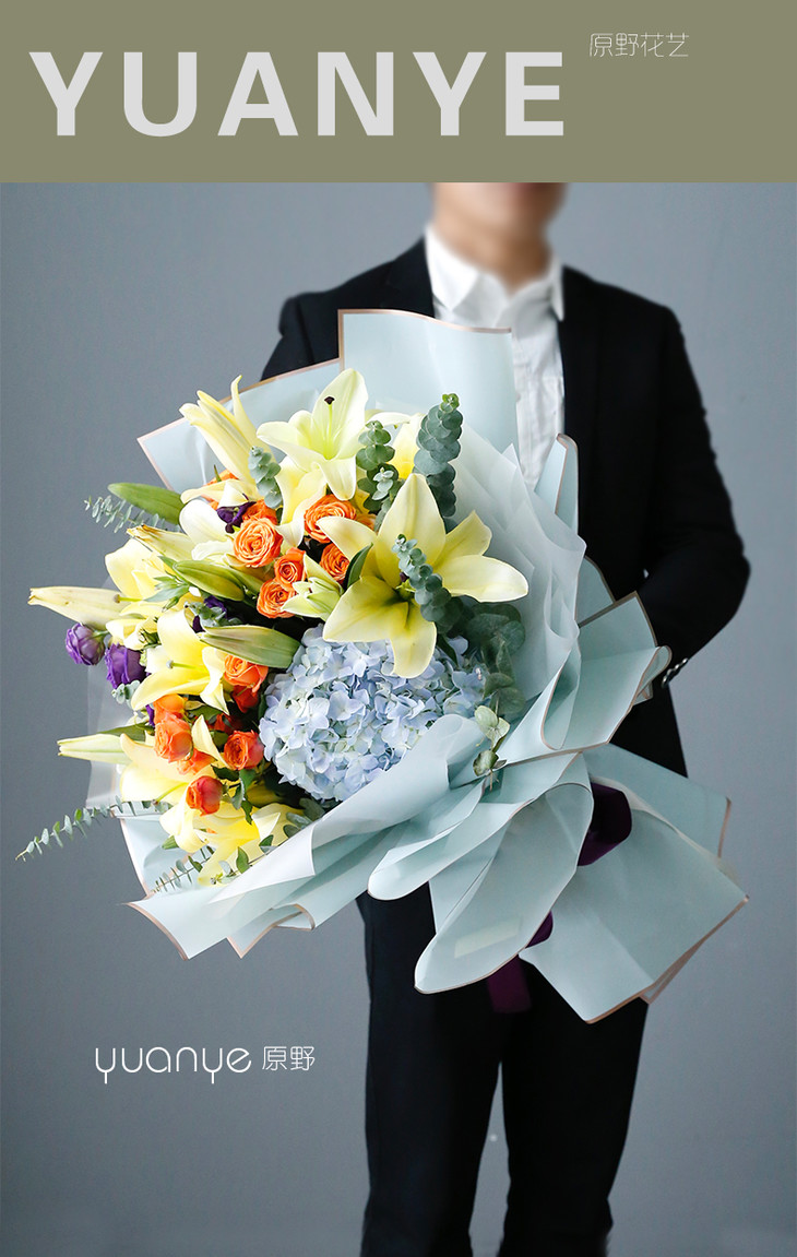 黄百合玫瑰向日葵混搭花束