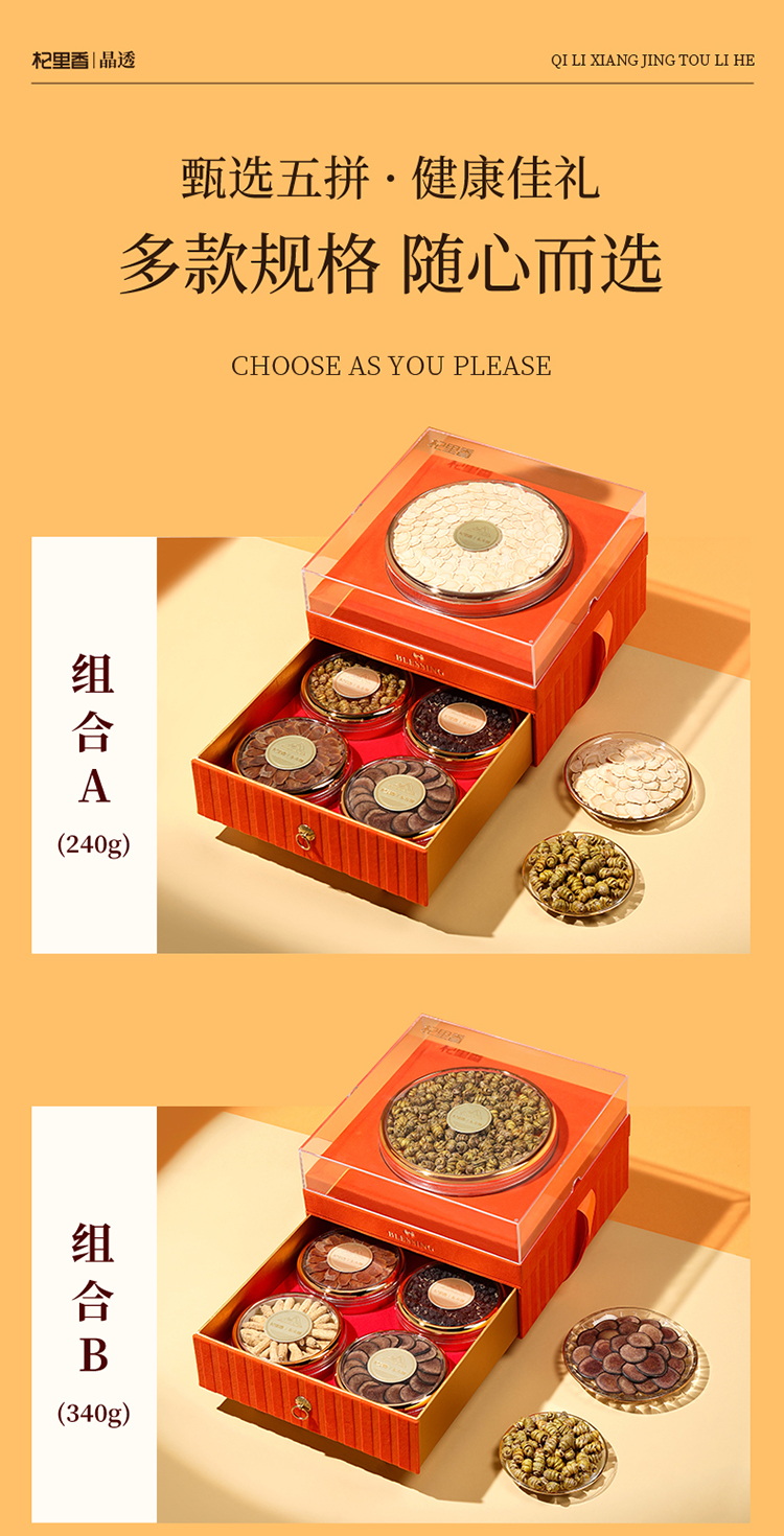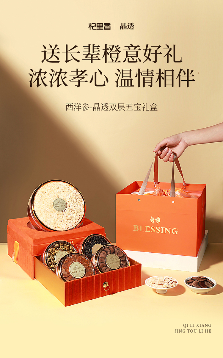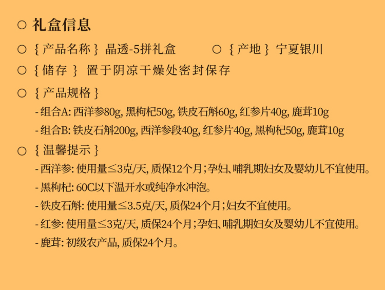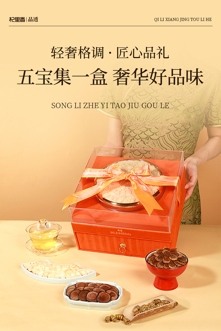 【冬季滋补】杞里香240g双层晶透橙色5拼礼盒-A西洋参80,石斛60g,红参40g,鹿茸10g,黑枸杞50g