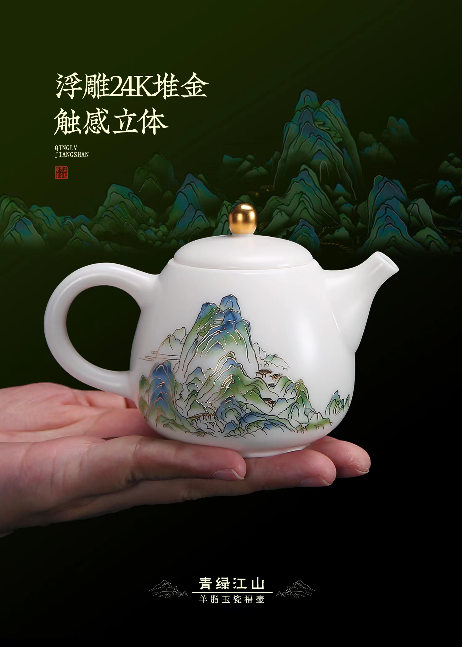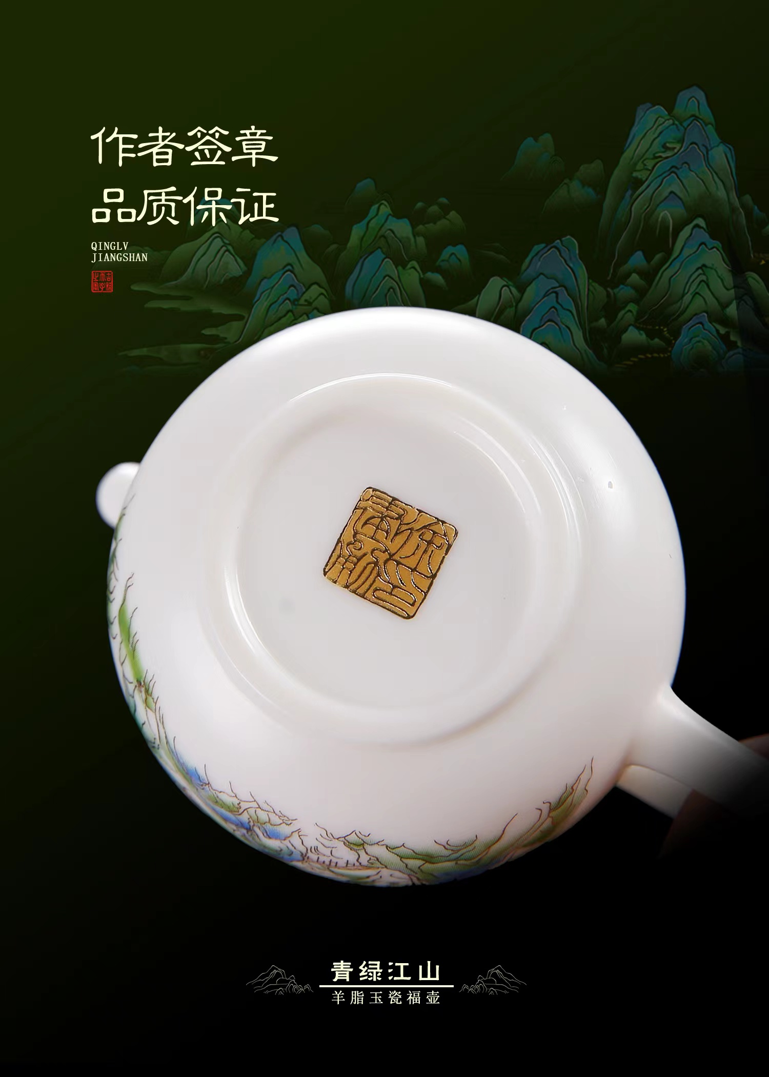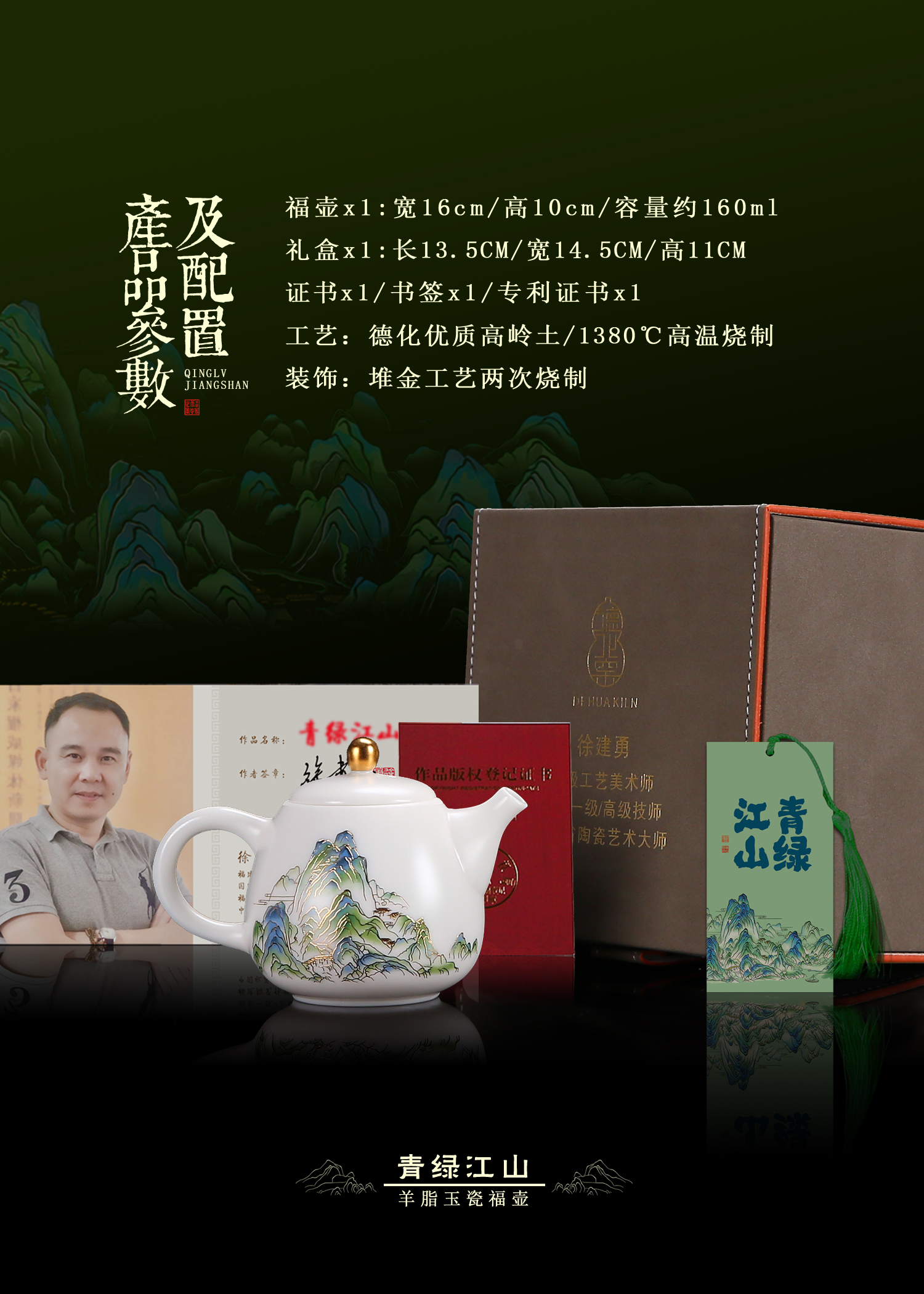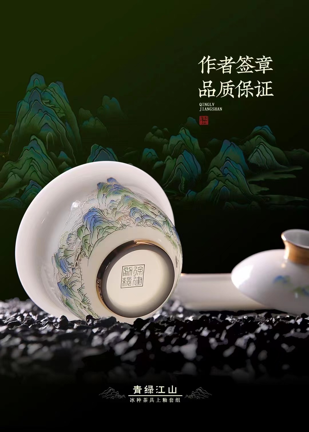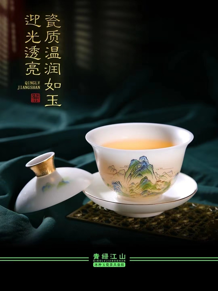 【只此青绿 也只有青绿】青绿江山茶壶、莲花杯、铃铛杯、禅定杯、圆融杯、水杯三件套,徐建勇老师签章,瓷质温润如玉 迎光透亮,浮雕堆金工艺 触感立体,珍藏品鉴 送礼臻品