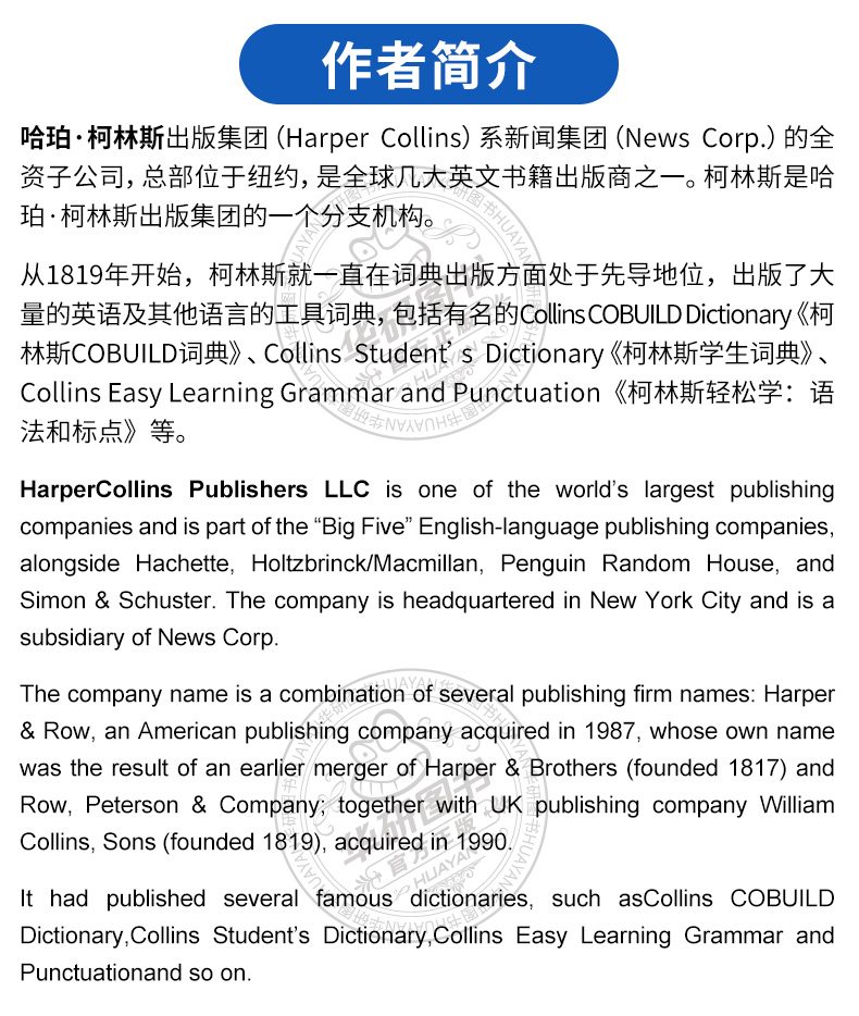 哈珀·柯林斯出版集团(Harper Collins)系新闻集团(News Corp.)的全资子公司,总部位于纽约,是全球几大英文书籍出版商之一。柯林斯是哈珀·柯林斯出版集团的一个分支机构。从1819年开始,柯林斯就一直在词典出版方面处于领军地位,出版了大量的英语及其他语言的工具词典,包括著名的Collins COBUILD Dictionary《柯林斯COBUILD词典》、Collins Student’s Dictionary《柯林斯学生词典》、Collins Easy Learning Grammar and Punctuation《柯林斯轻松学:语法和标点》等。