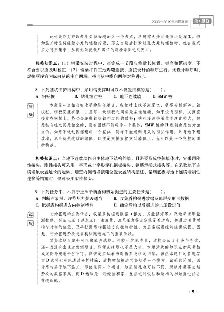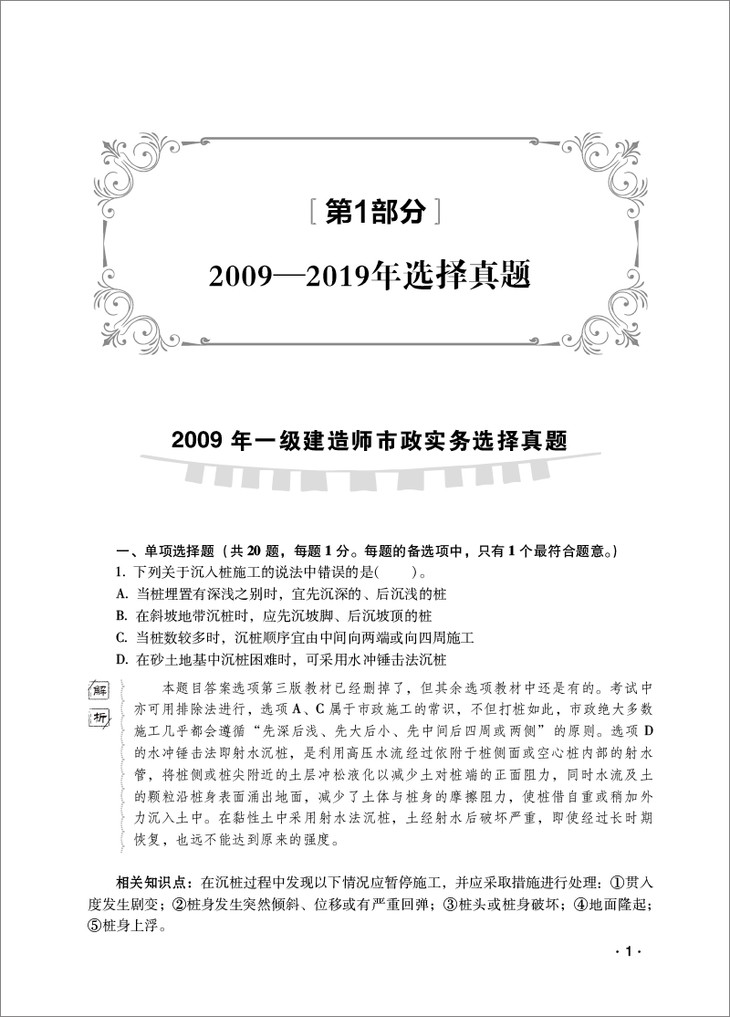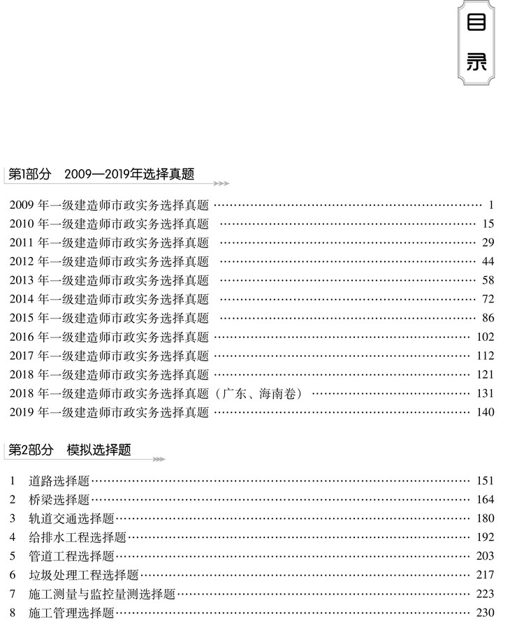 本书第一部分主要汇集了2009—2019年一级建造师市政专业选择题,第二部分参照历年真题的形式,增加了各章节模拟选择题,内容包括道路、桥梁、轨道交通、给排水、管道、垃圾处理、施工测量与监控量测、施工管理等,力求最大程度地涵盖教材知识点,争取让考生在短时间内全面熟悉和掌握教材内容。