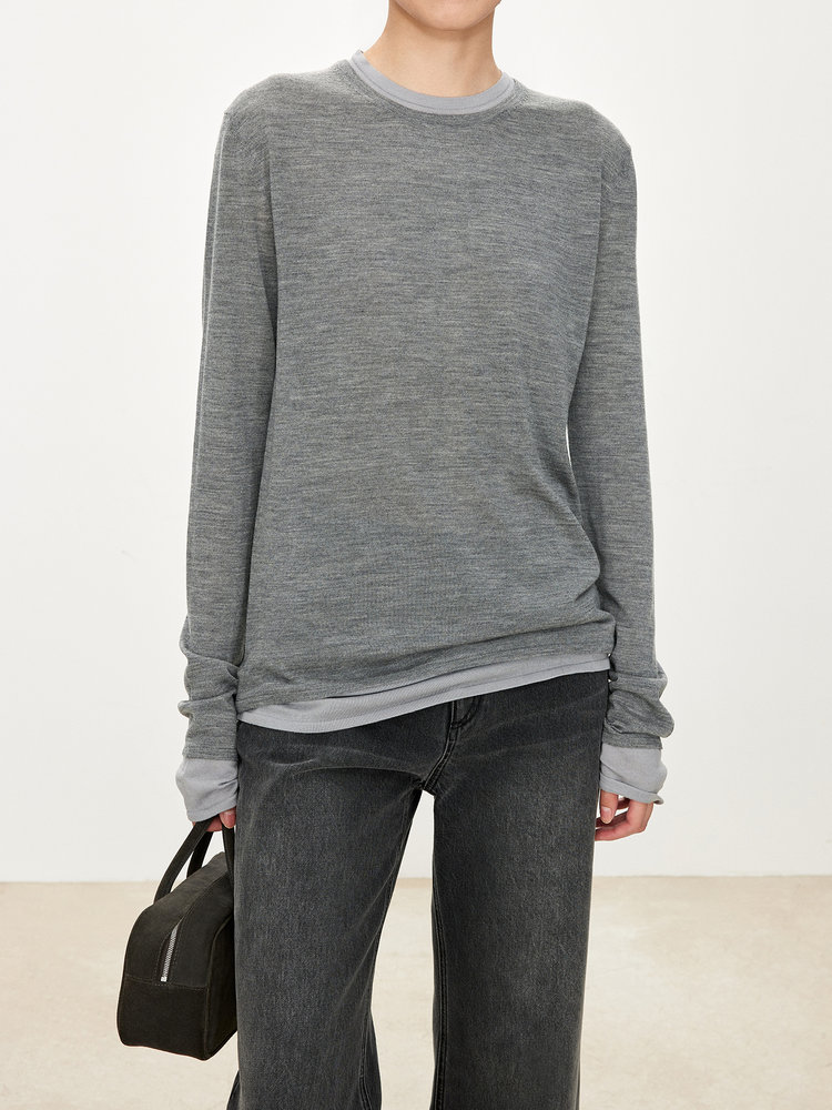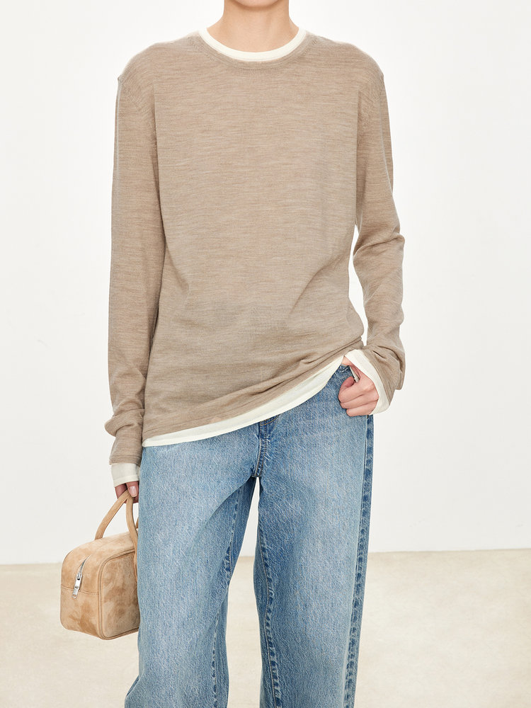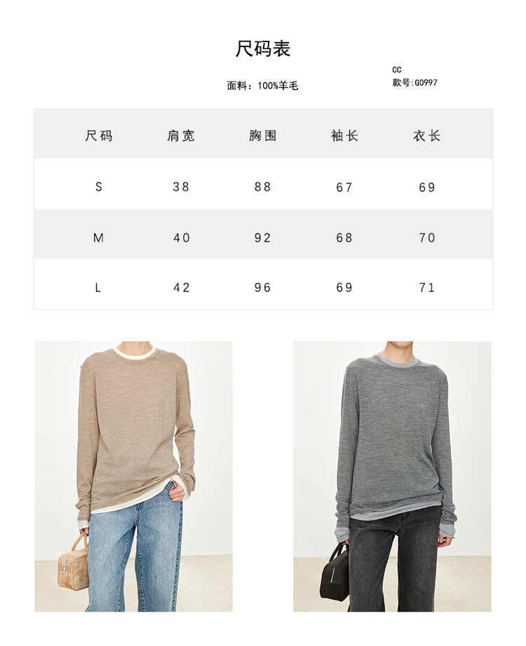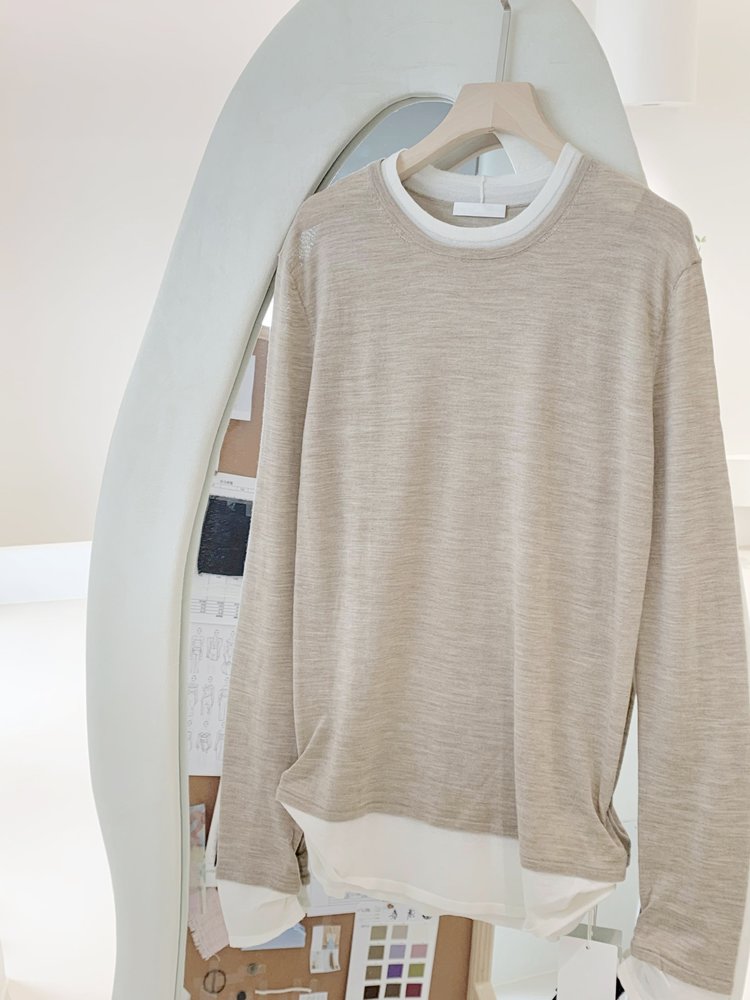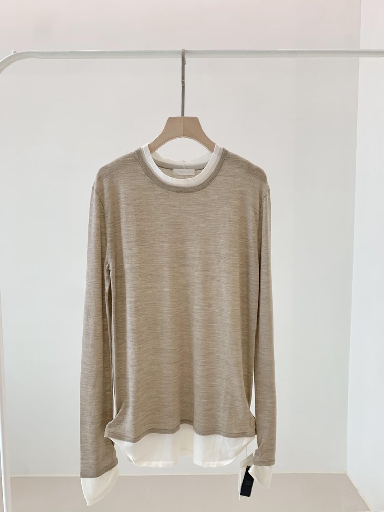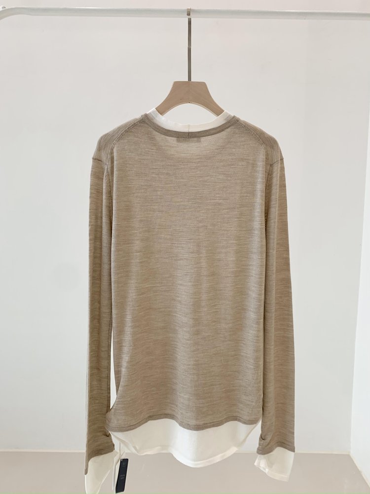 假两件拼色长袖空气针织T恤 秀场风心机拼色假两件空气衫 柔软有筋骨 贴身越穿越亲肤 宽松版型 下摆拼色边偏长 下摆包边+卷边双层织法