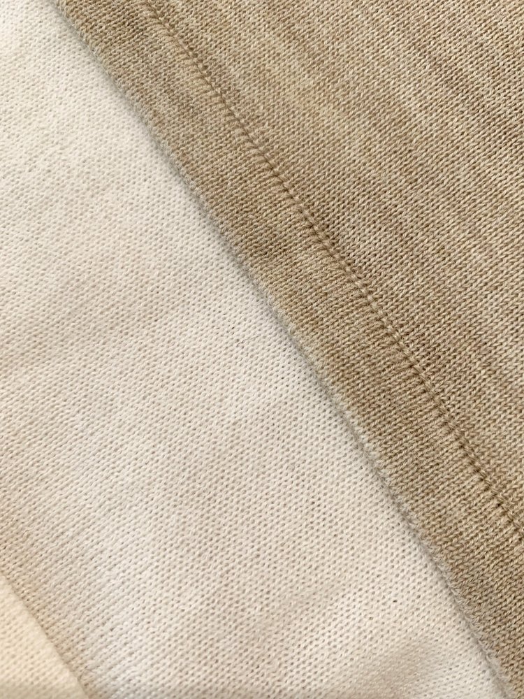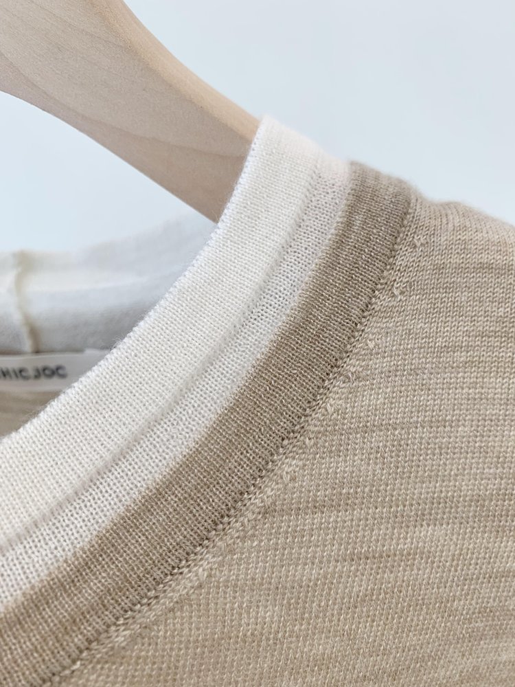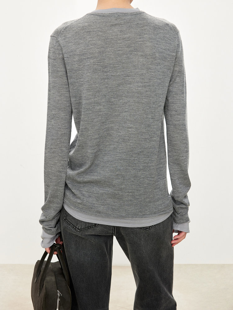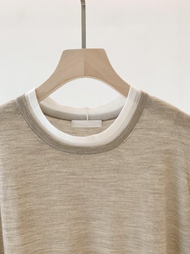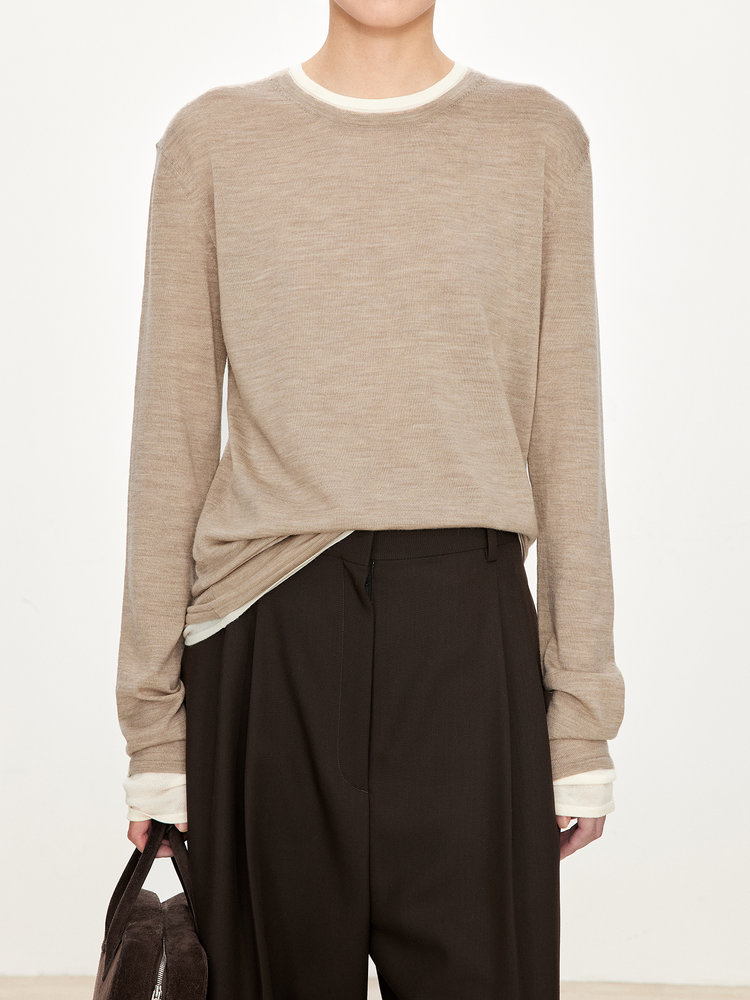 假两件拼色长袖空气针织T恤 秀场风心机拼色假两件空气衫 柔软有筋骨 贴身越穿越亲肤 宽松版型 下摆拼色边偏长 下摆包边+卷边双层织法