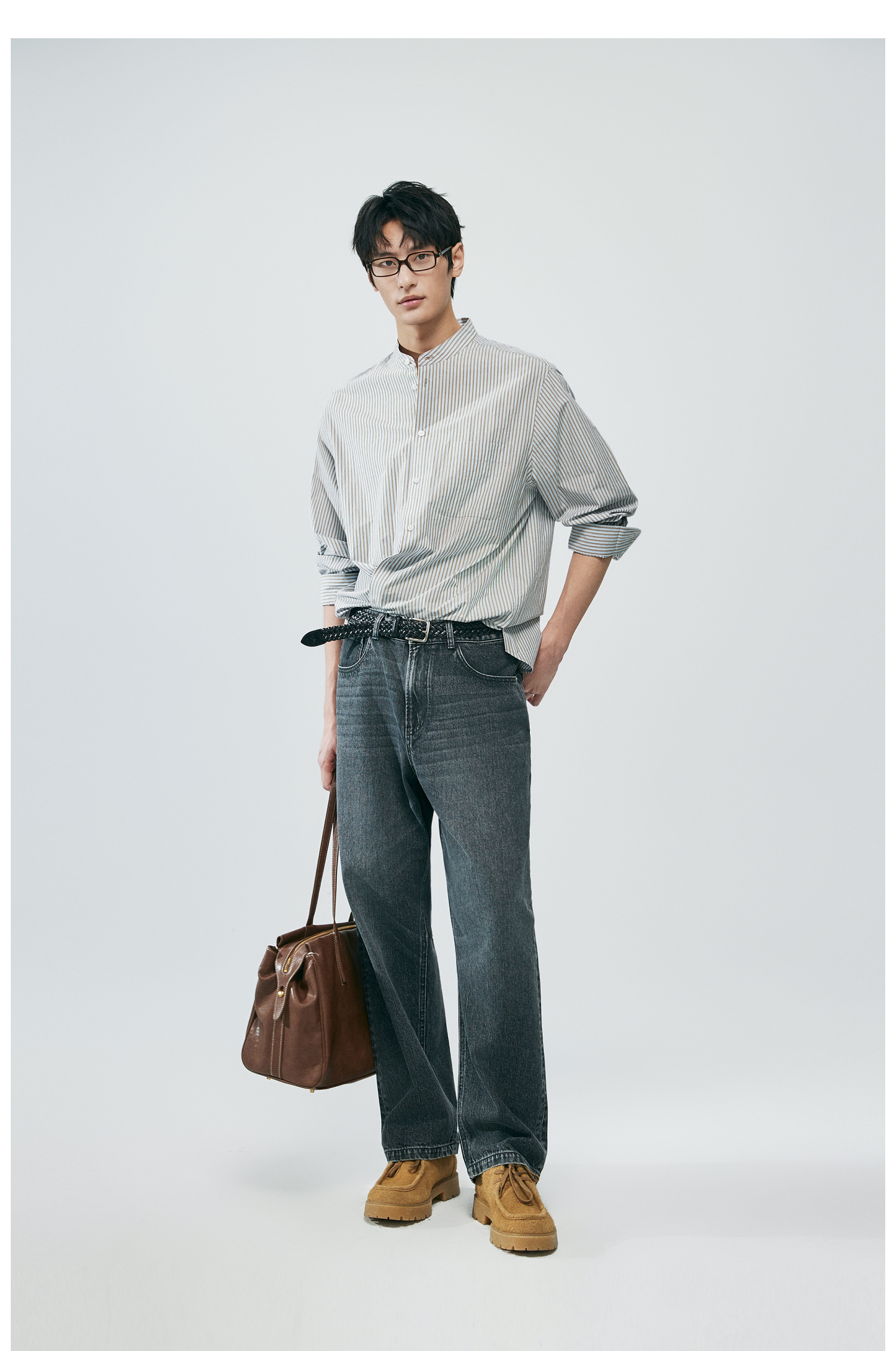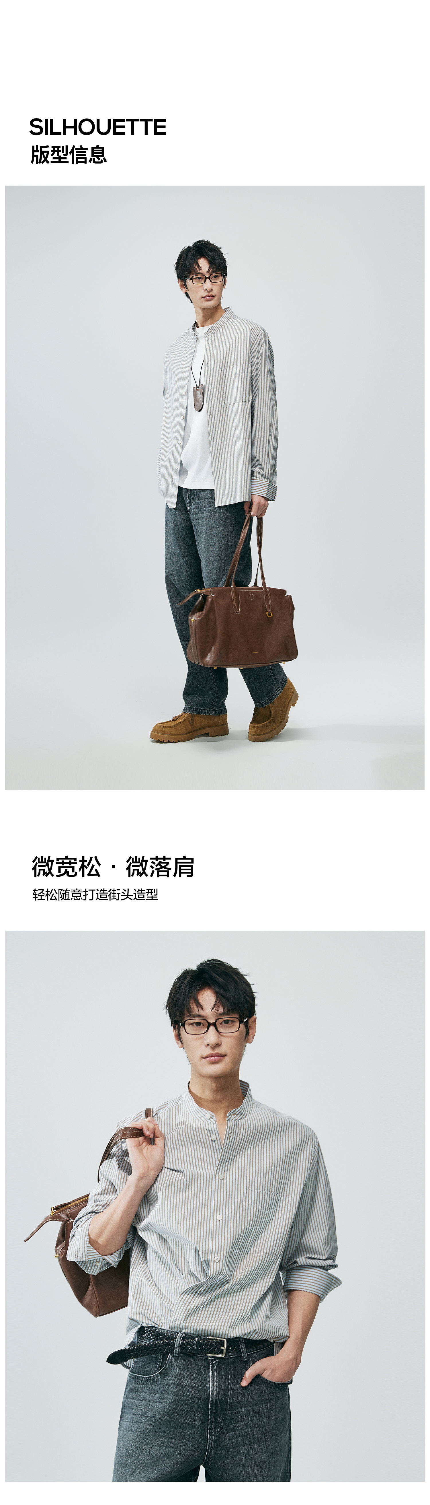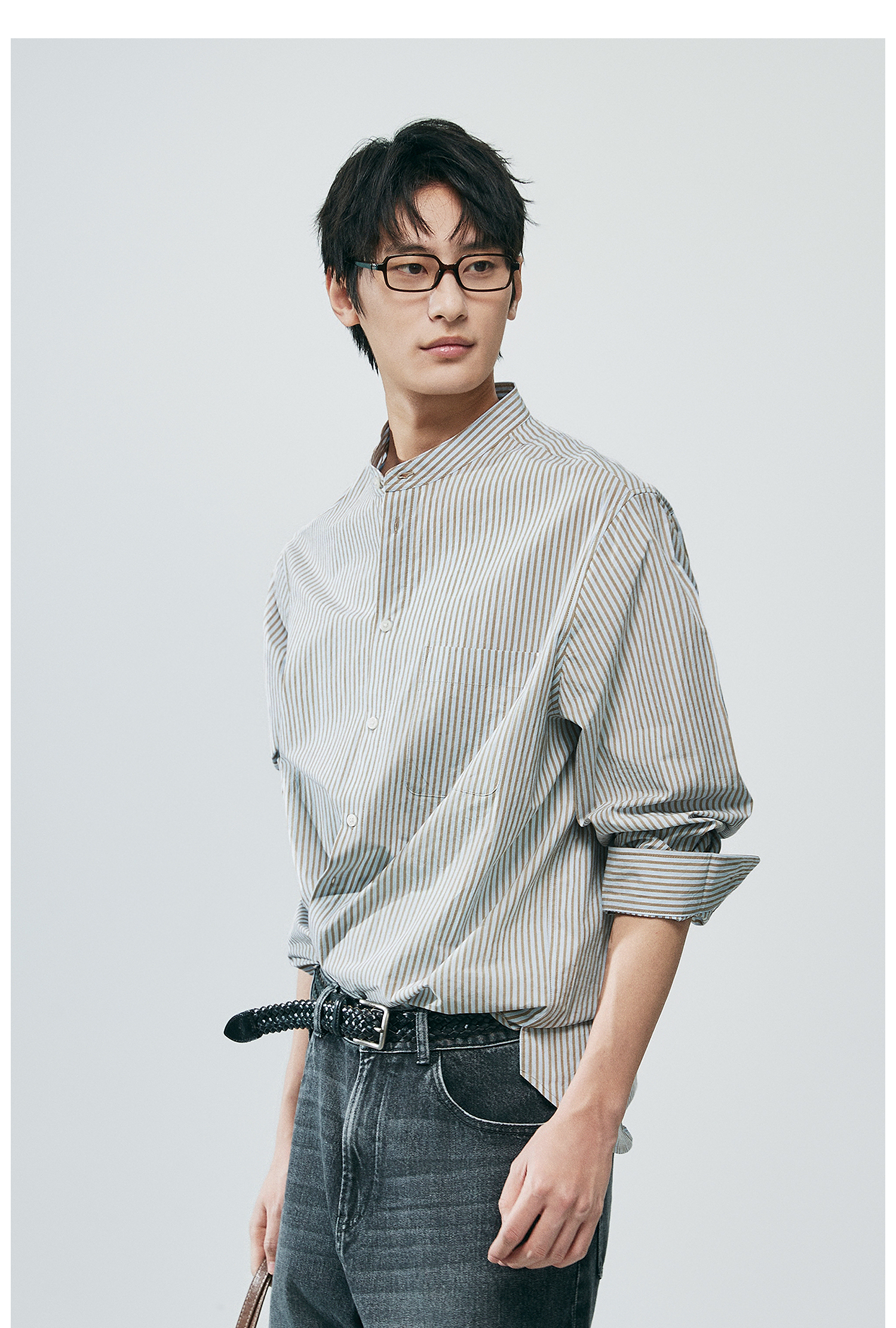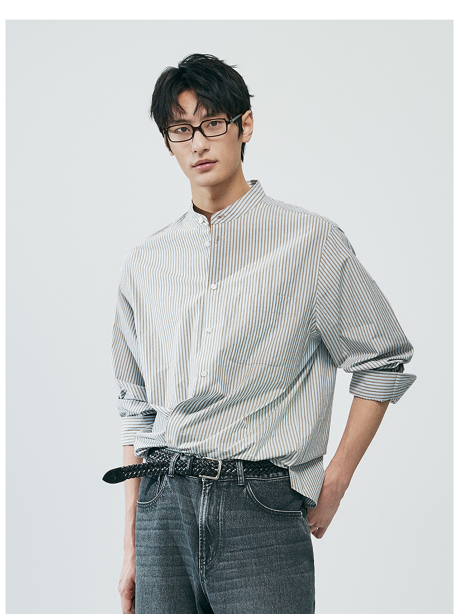 棉仓362804006-微宽松全棉砂洗条纹立领长袖衬衫