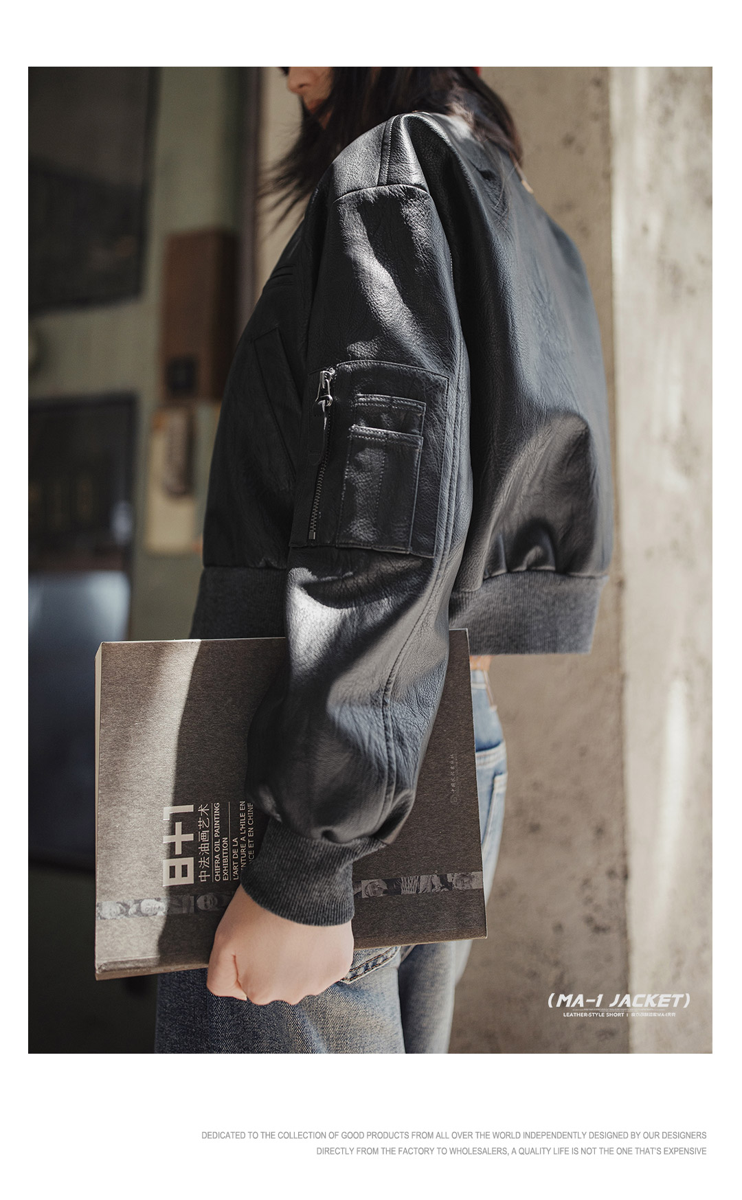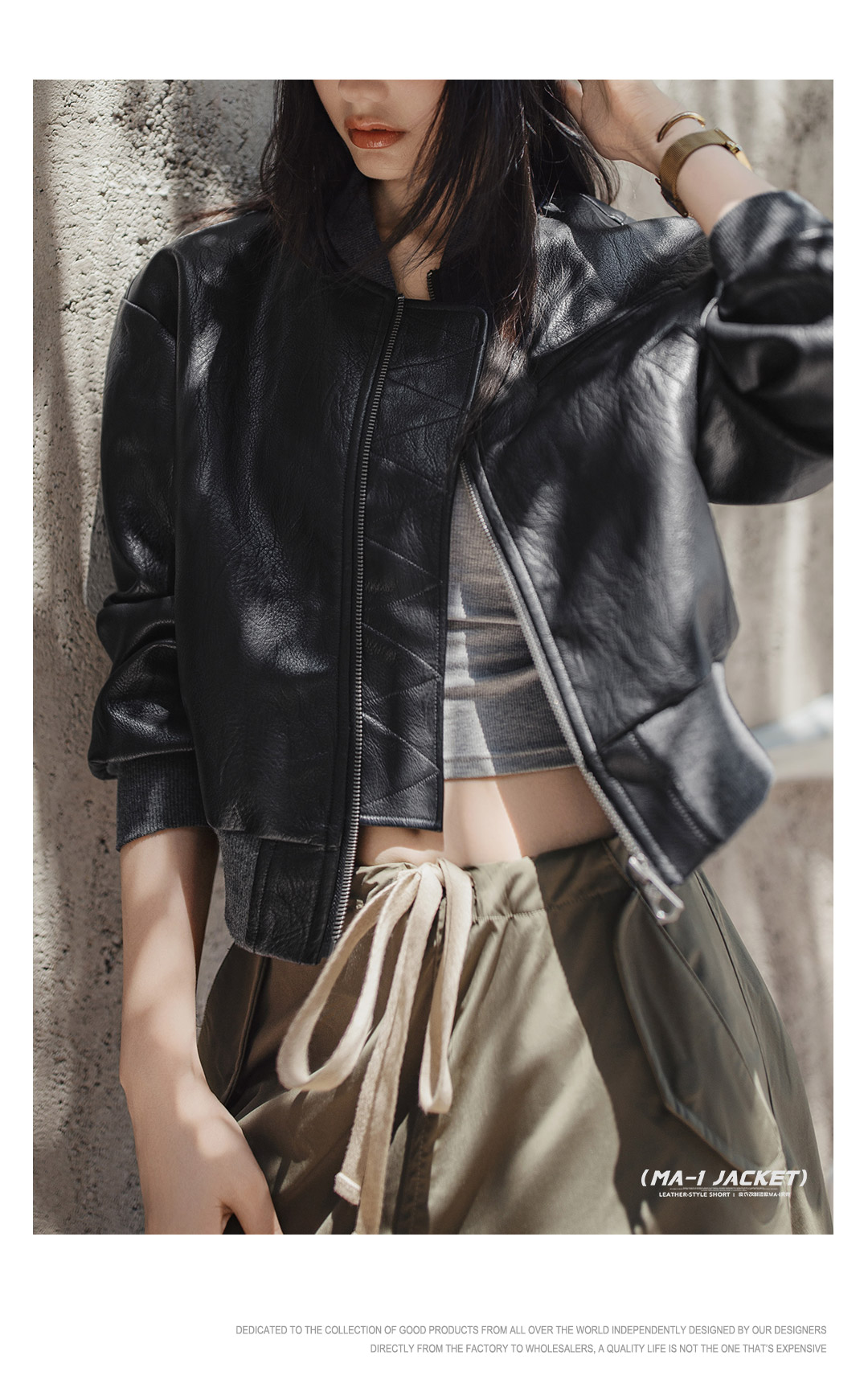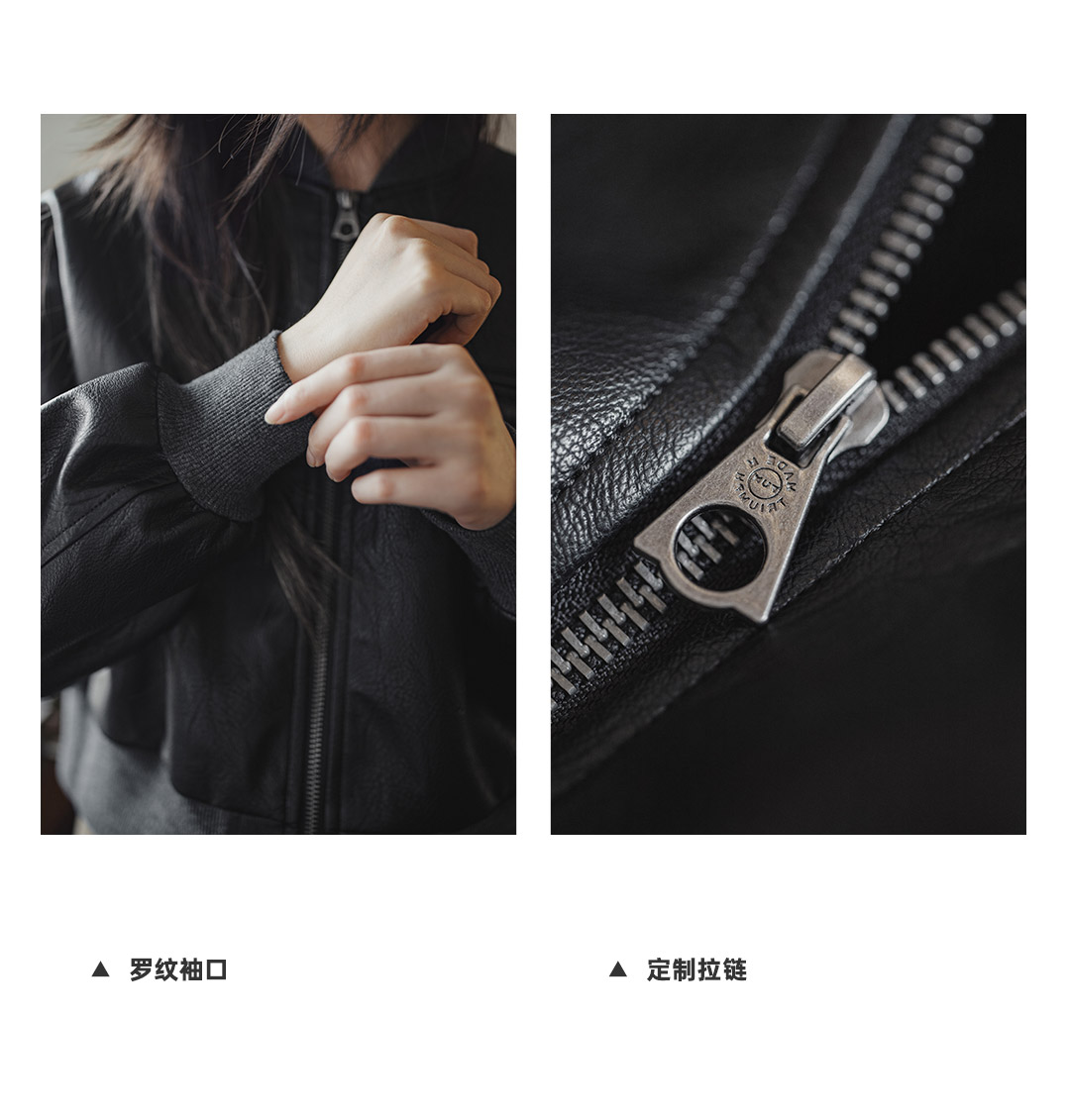 马登美式黑色飞行员棒球圆领短款版机车pu软小皮衣夹克外套女士秋