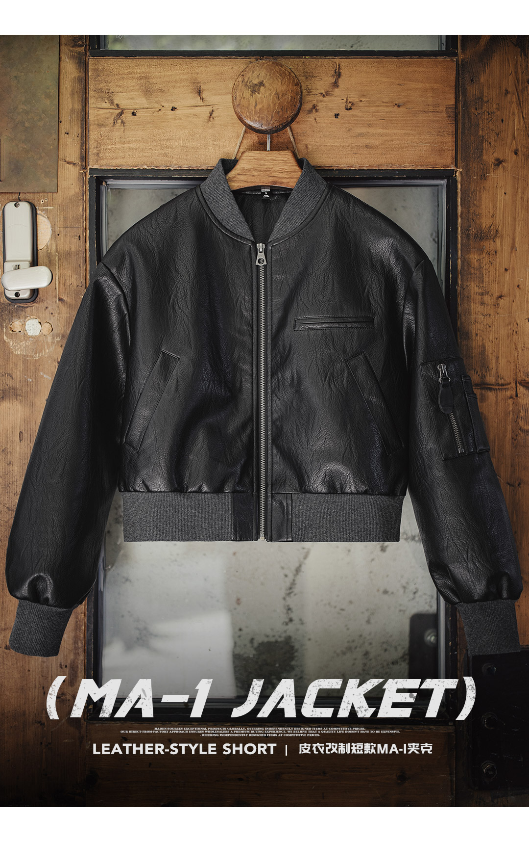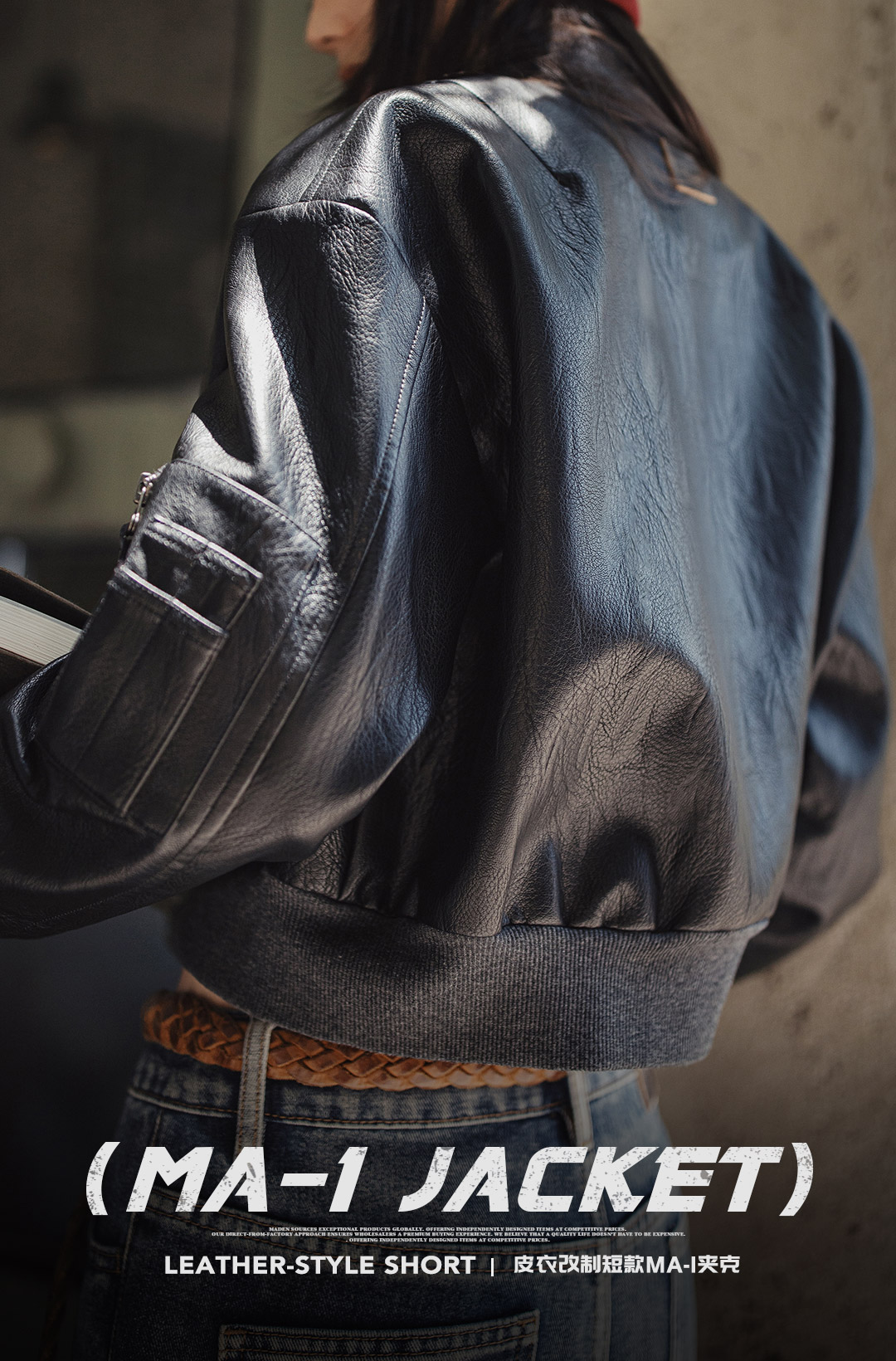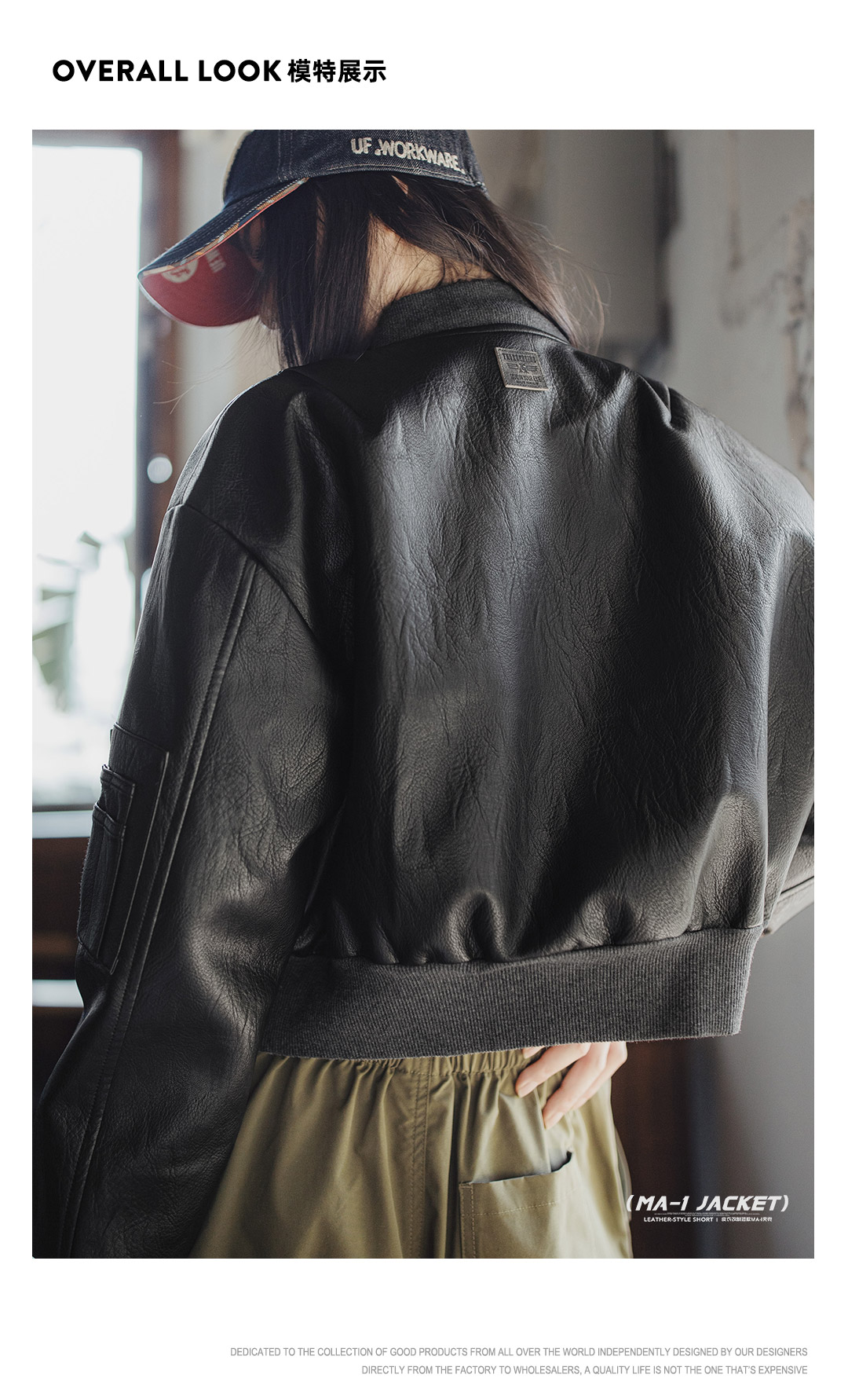 马登美式黑色飞行员棒球圆领短款版机车pu软小皮衣夹克外套女士秋