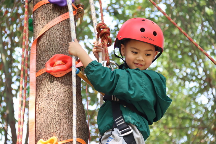 学习攀树运动的各类技巧,手脚推进法、上升下降技术的切换、双绳脚锁攀爬法等,锻炼上下肢力量和身体的敏捷度及协调性。