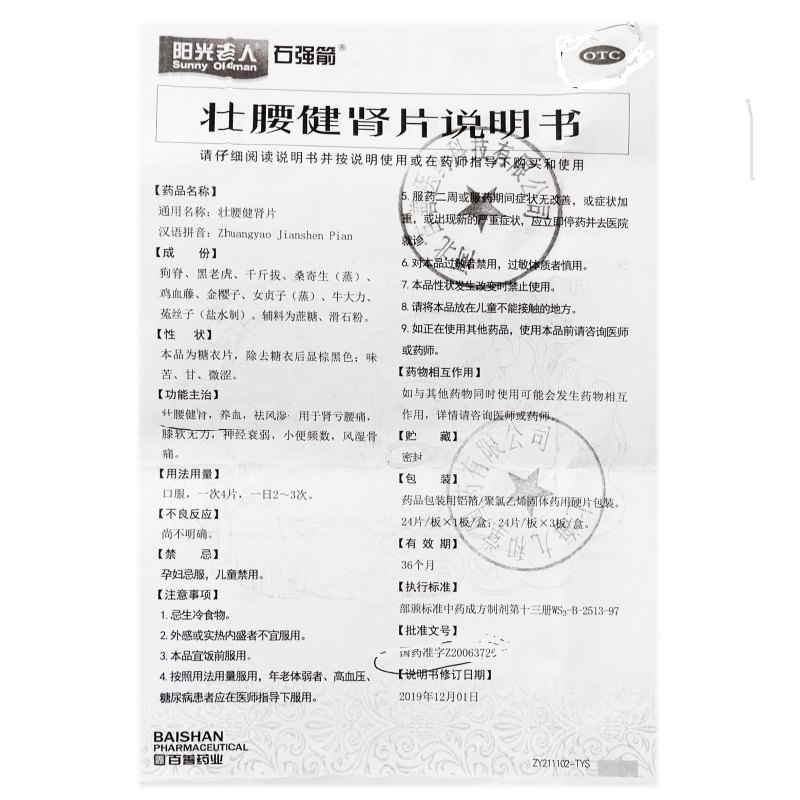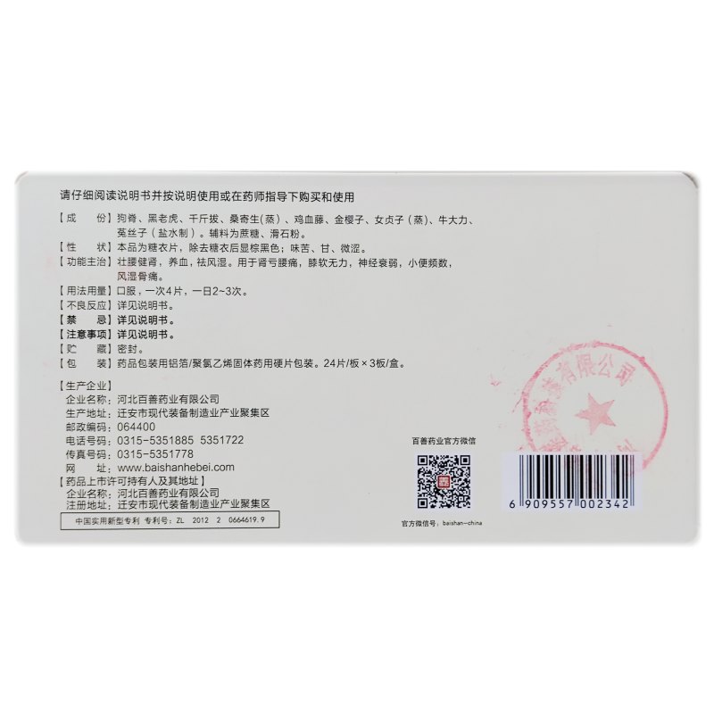 狗脊、黑老虎、干斤拔、桑寄生(蒸)、鸡血藤、金樱子、女贞子(蒸)、牛大力、菟丝子(盐水制)。辅料为蔗糖、滑石粉。