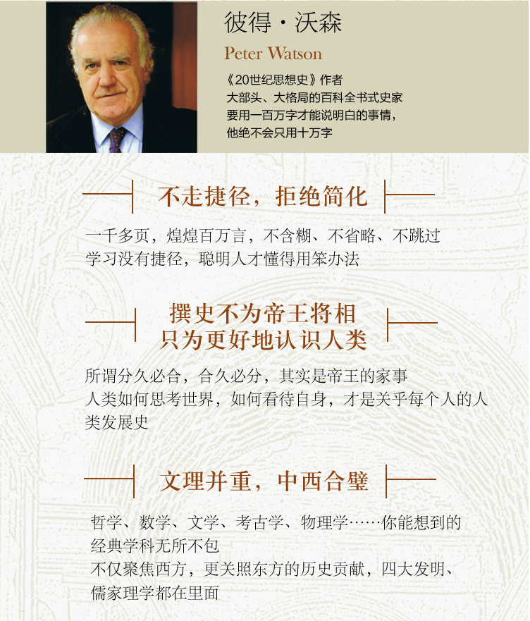 彼得·沃森是写作思想史的大家,向来以大格局的写作风格闻名。沃森着迷的历史,不是帝王将相征服与统治的历史,而是人类如何认识世界、认识自己的历史。他的成名作《20世纪思想史》(将由译林社在2018年出版),2000年初版以来在西方知识界引起强烈反响,是一本涵盖了所有塑造和改变了20世纪的人物和理念的野心之作,被誉为从当代视角了解20世纪的最杰出作品。
